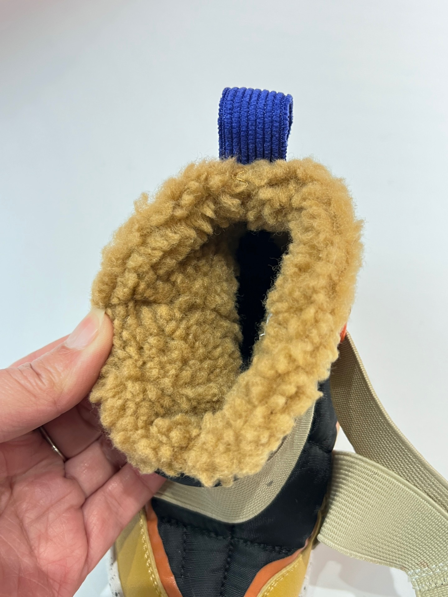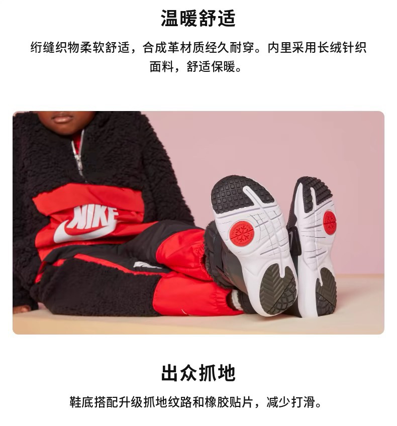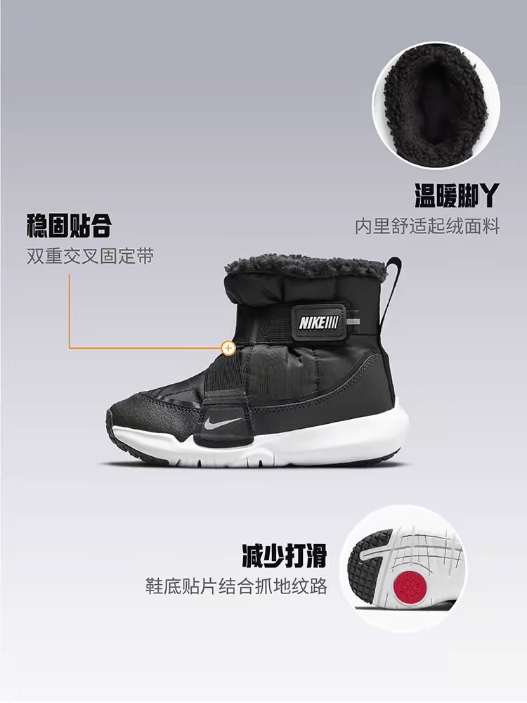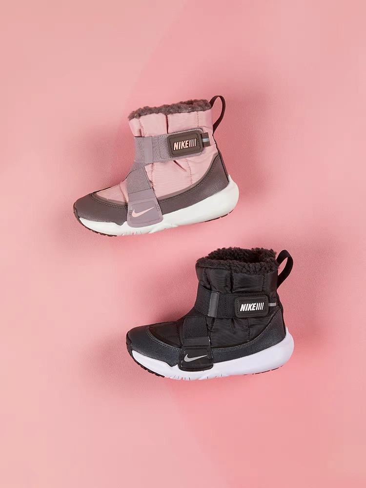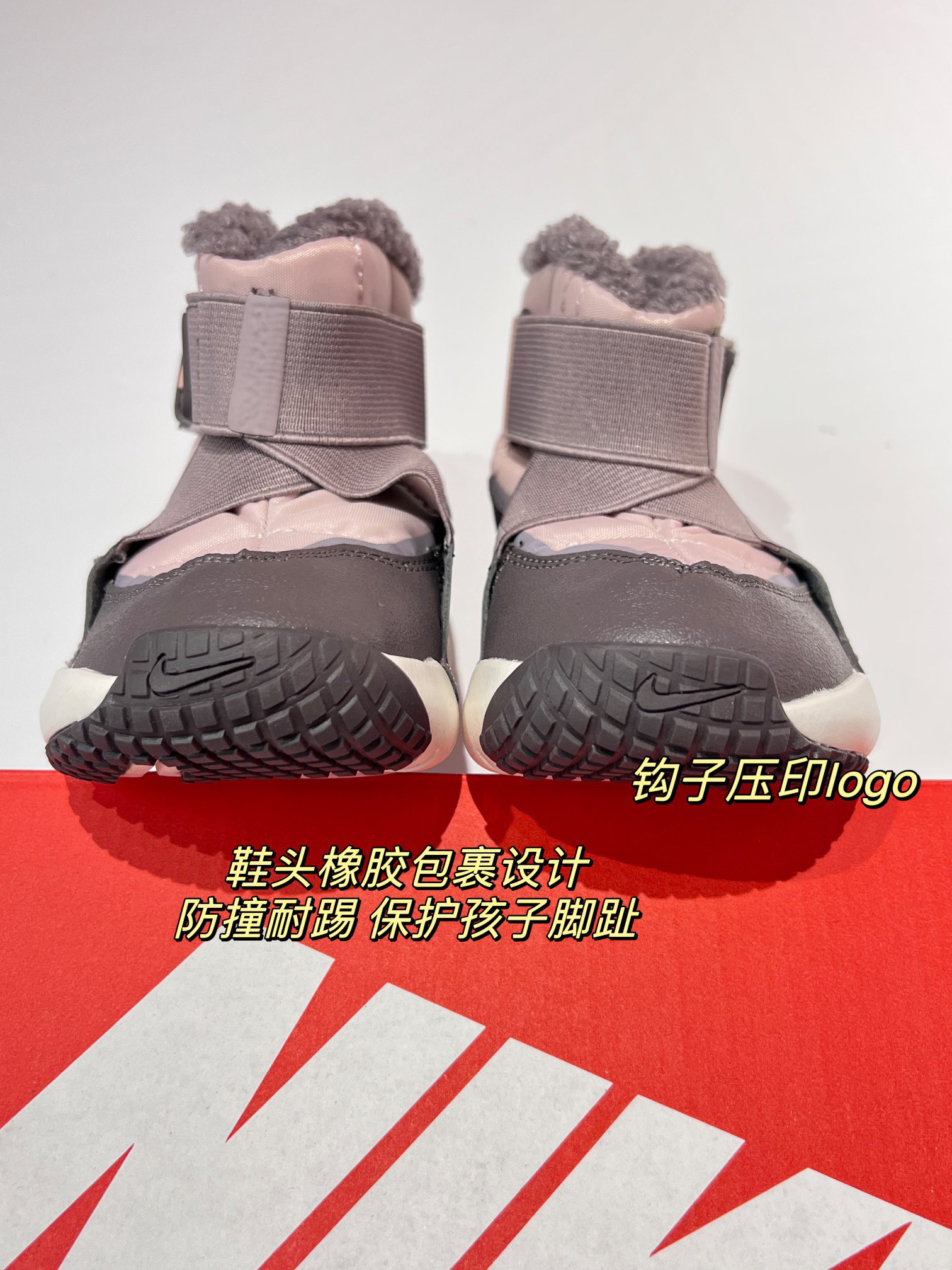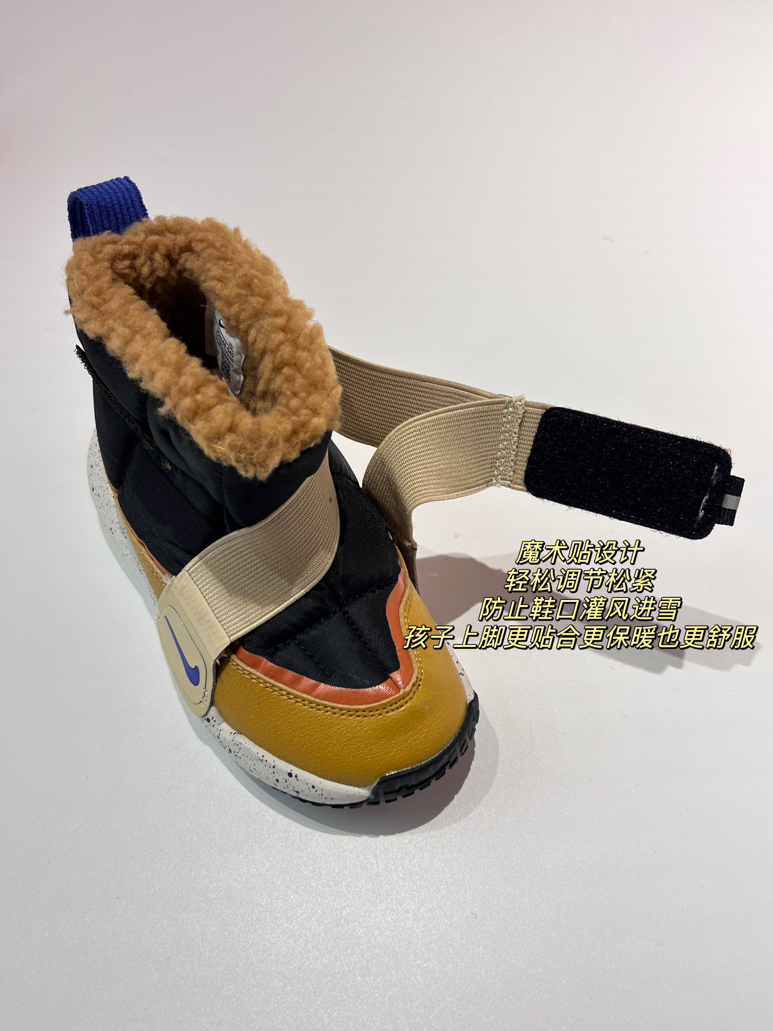鞋身的魔术贴设计 既能起到装饰作用 又能轻松调节松紧 防止鞋口灌风进雪 孩子上脚更贴合更保暖也更舒服!(小童版和中大童版的魔术贴会不太一样哦 大家注意看后面细节图哈)