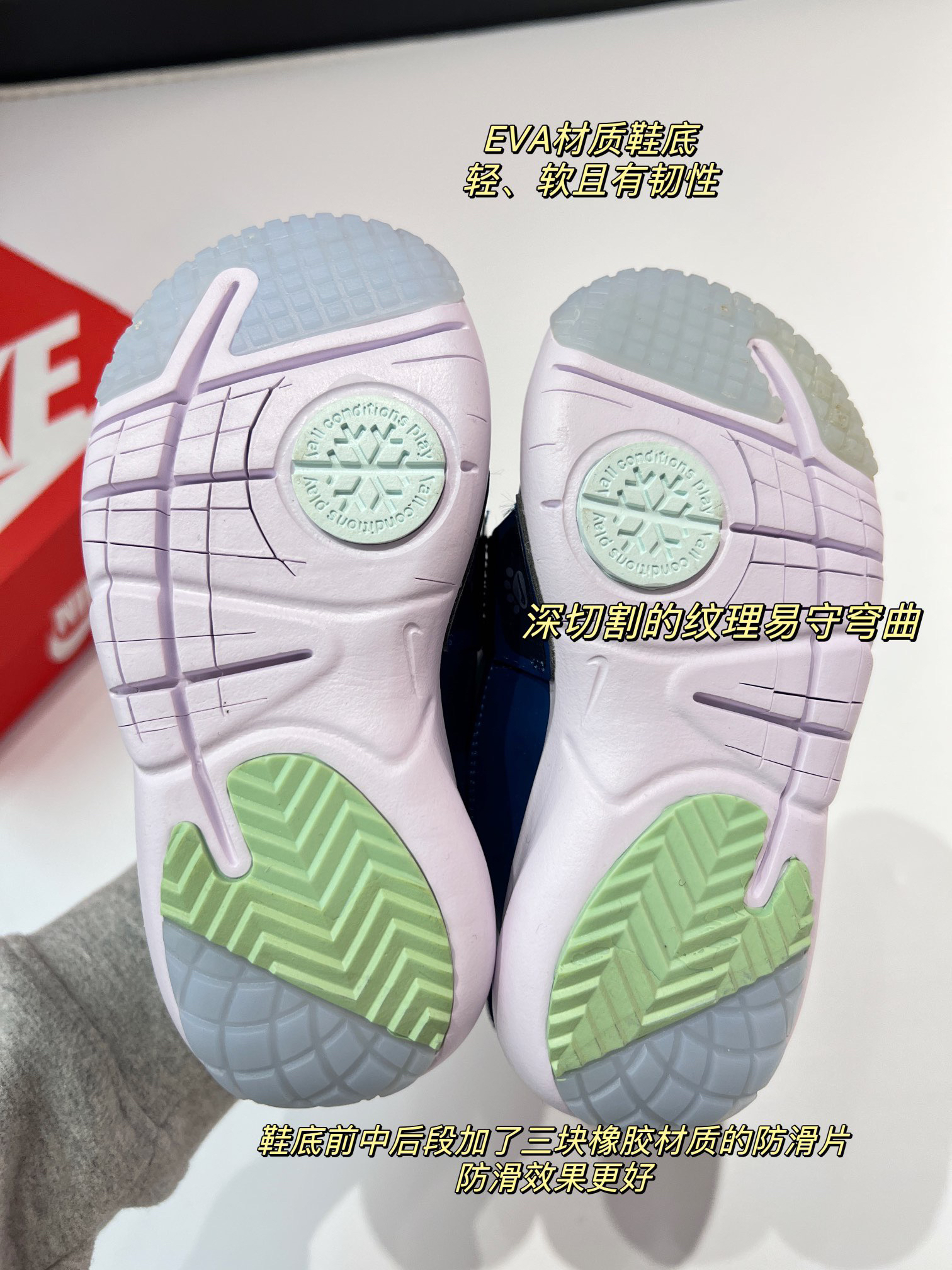 鞋底是EVA材质 轻、软且有韧性 前脚掌还做了深切割的纹理 易于弯曲 三分之一处可以轻松弯折 符合人体工学 确保孩子活动时的灵活性!
