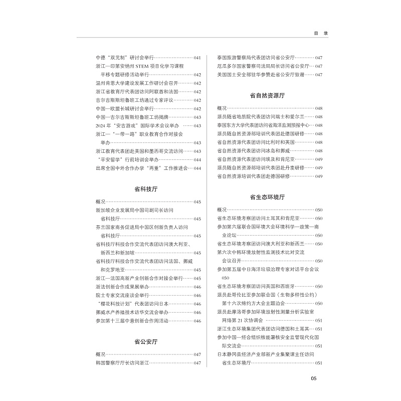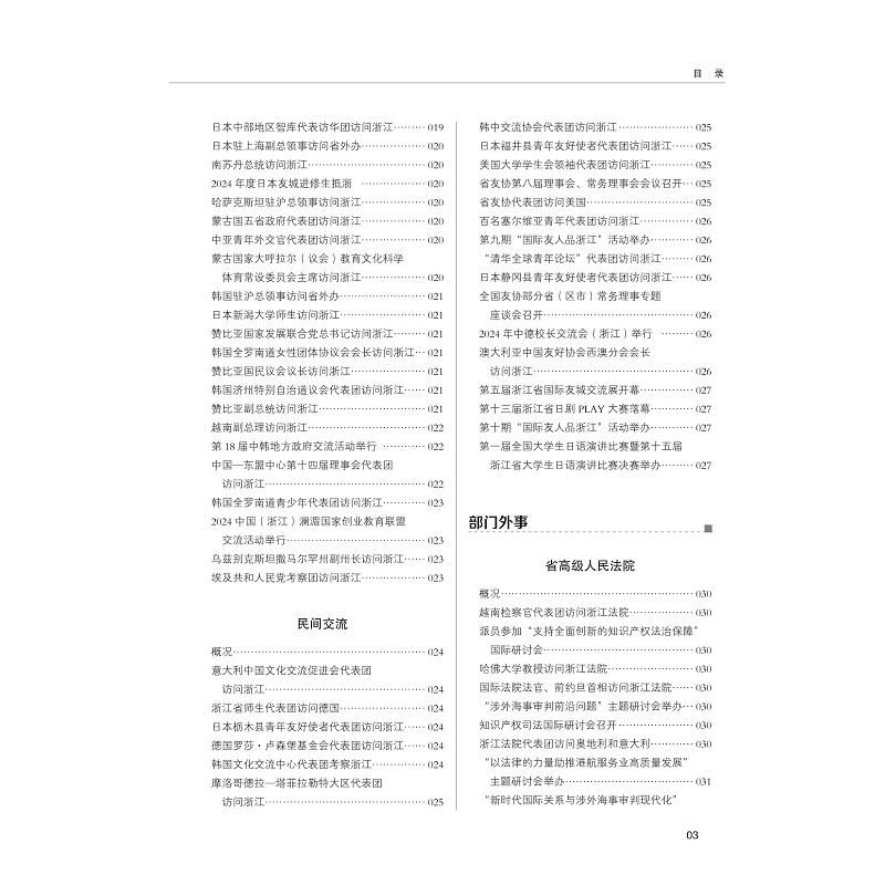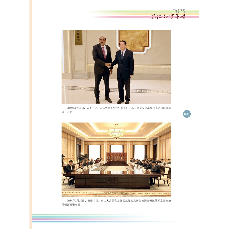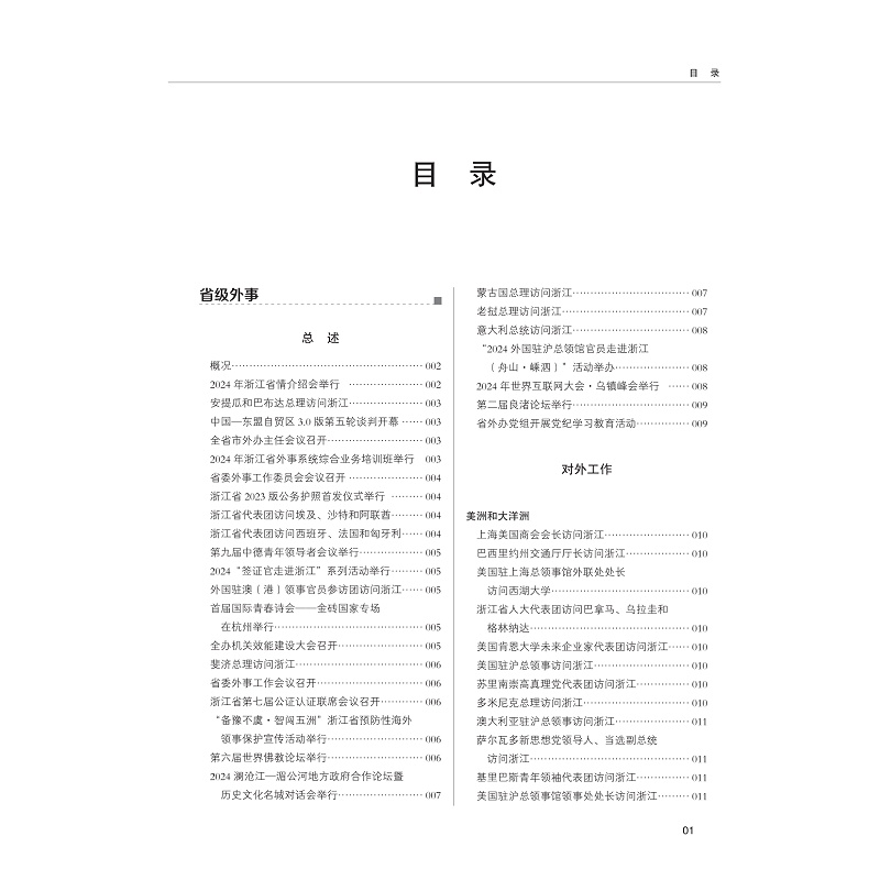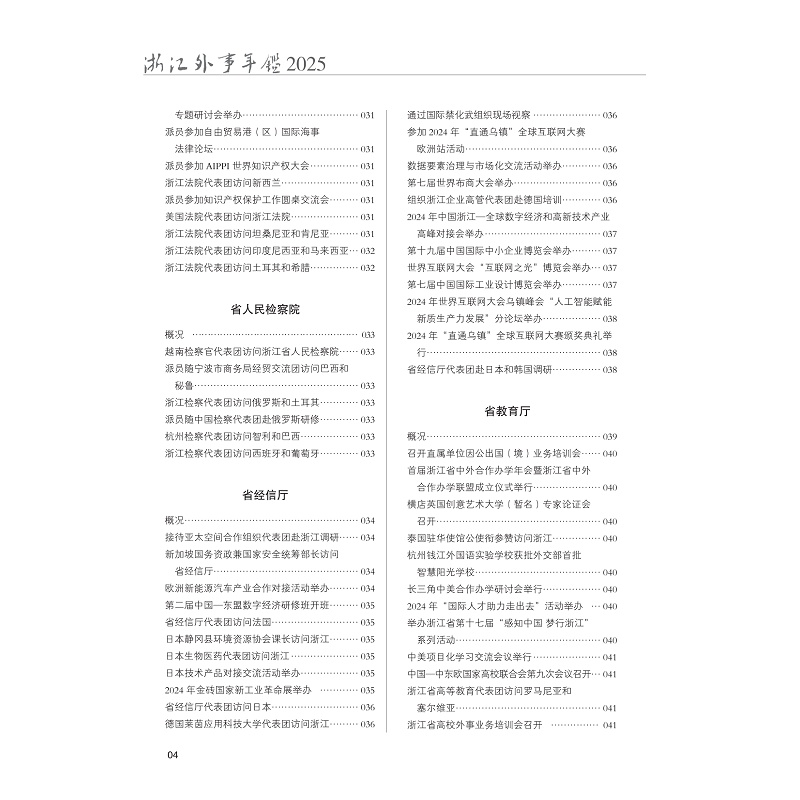 本书由浙江省人民政府外事侨务办公室主持编纂,是浙江省涉外工作年度大事、新闻和要事的信息资料文献。本年鉴全面、系统地记述和反映2024年1月1日至12月31日期间浙江省发生的涉外事件。全书设图记、特载、省级外事、部门外事、高校外事、企业外事、市县外事和附录八大栏目,共有条目1500余条。条目一般按照事件发生时间的先后顺序排列。本年鉴有详细目录。为方便读者保存和查询,配有数字材料。本年鉴所收内容(含图片)均由相关部门提供。