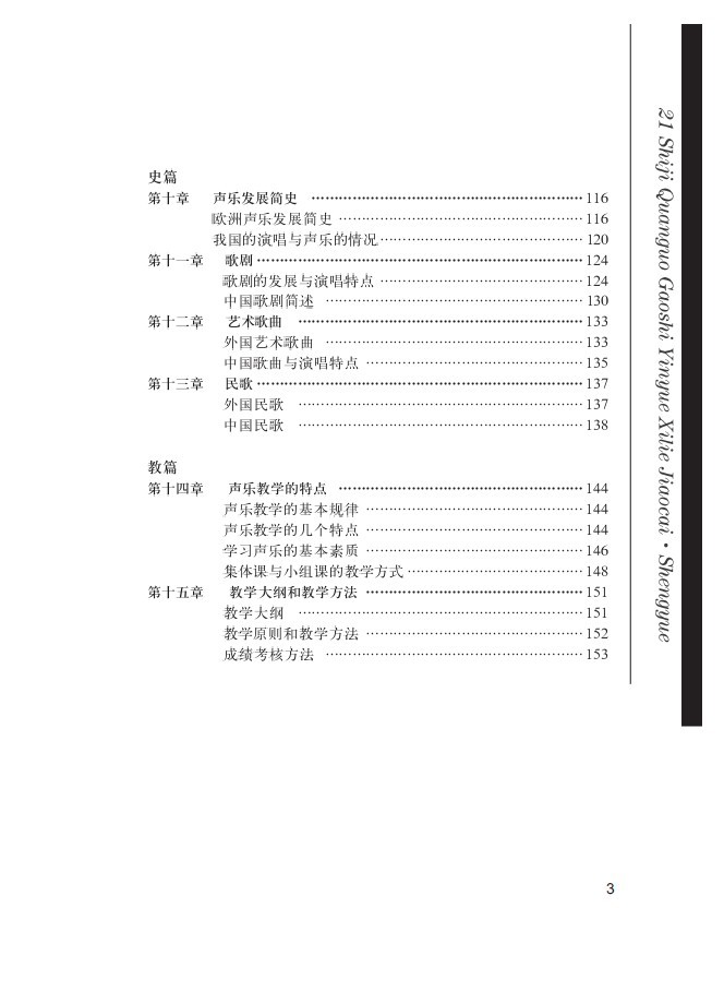 全书分“心”、“技”、“史”和“教”四大部分,从声乐艺术和声乐教学的一些认识问题入手,对声乐艺术和声乐教学、声乐审美进行分析研究,提出可操作性比较强的演唱指导意见,介绍声乐发展的历史,并结合师范院校的声乐教学和师范性等进行研究分析,最后一部分介绍国际大师的教学经验。试图相对完整地、客观地、深入地、认真地、尤其注意结合声乐教学的现实情况,紧紧围绕“教”这个中心,认真地对声乐教学进行全面的研究。