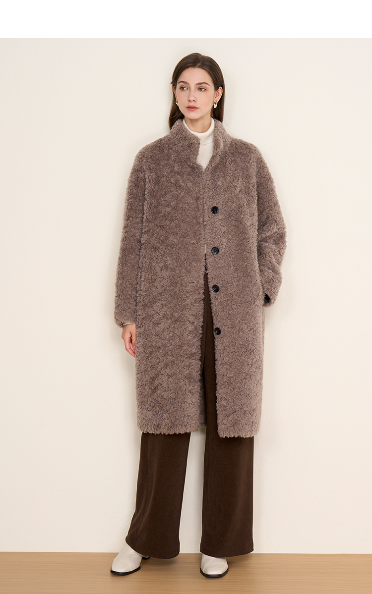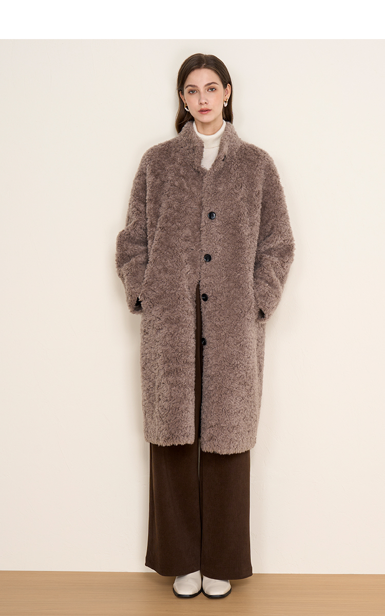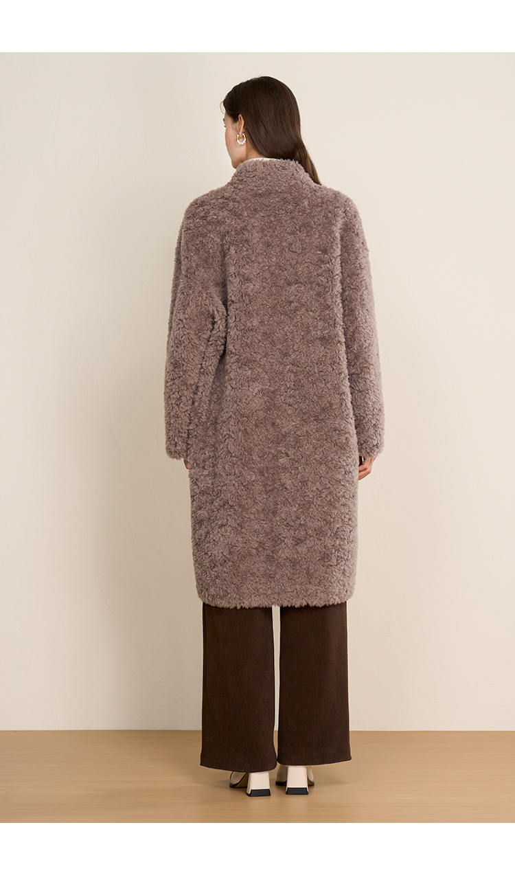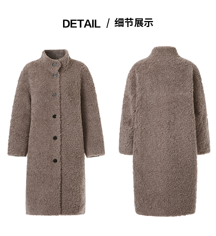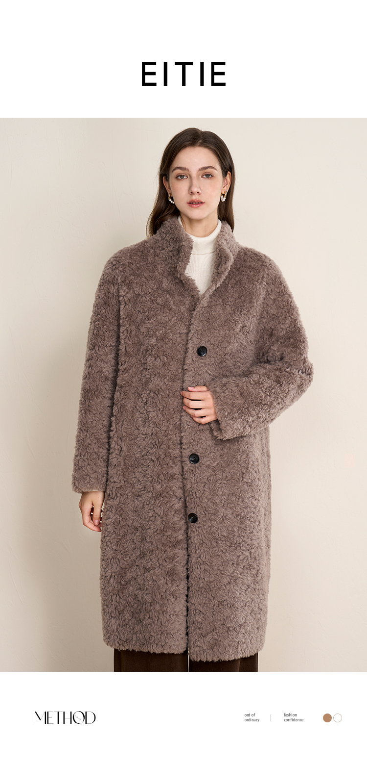 EITIE爱特爱气质立领咖色长款颗粒绒羊剪毛大衣外套冬季新款皮衣D2593925
