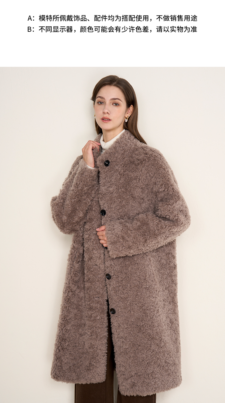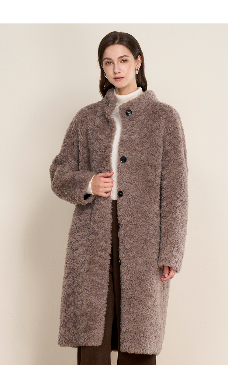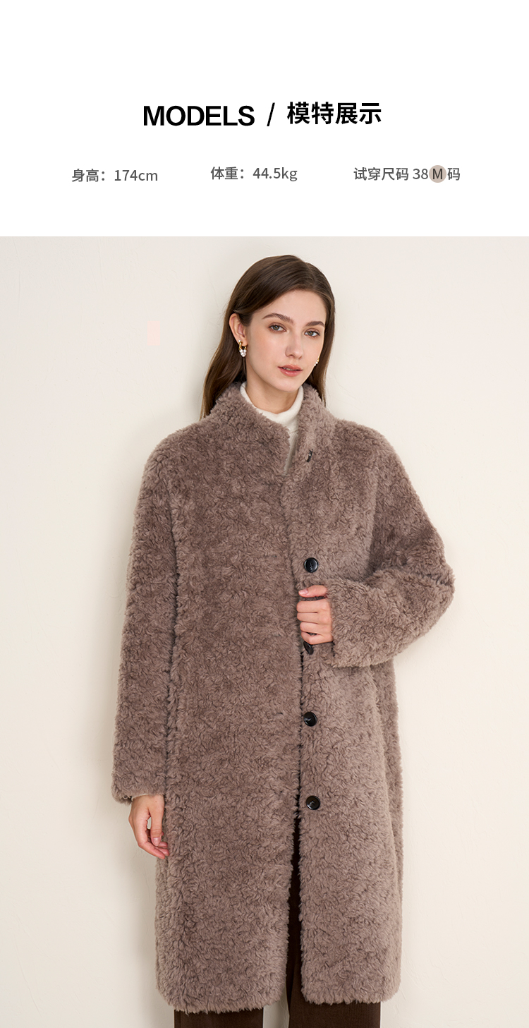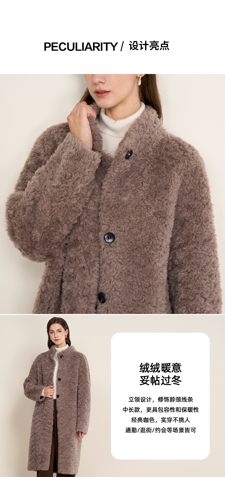EITIE爱特爱气质立领咖色长款颗粒绒羊剪毛大衣外套冬季新款皮衣D2593925