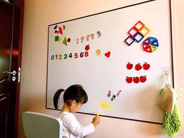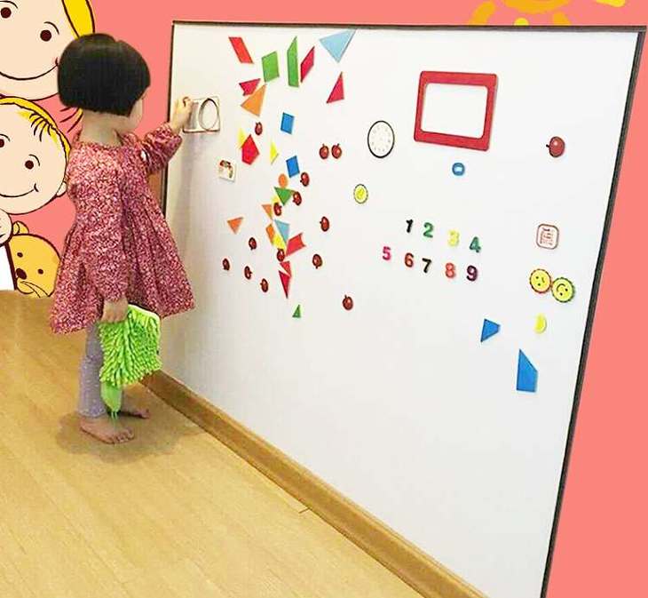 还能用结合磁贴实现“家庭小教室”,帮助孩子分辨大小形状和颜色,开发智力等,绘画面积大、不占地儿,帮你无限省空间~