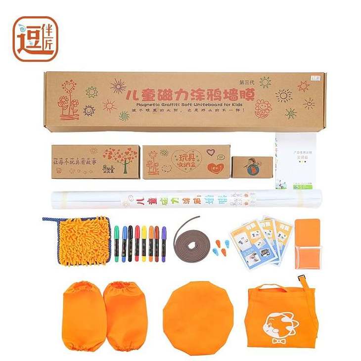 贴在墙上随随随随便画,逗伴匠涂鸦磁力涂鸦墙膜一套搞定。包括墙膜(90*60cm;90*120cm两个尺寸可选)、涂鸦笔、画服、清洁布以及装饰条等贴心礼包,还加送小汽车磁贴一组。满满当当一大箱,1岁半玩到9岁,省心省力100分!