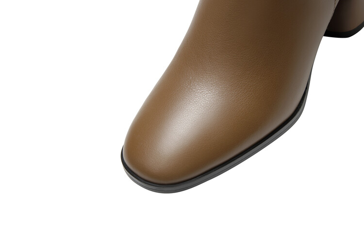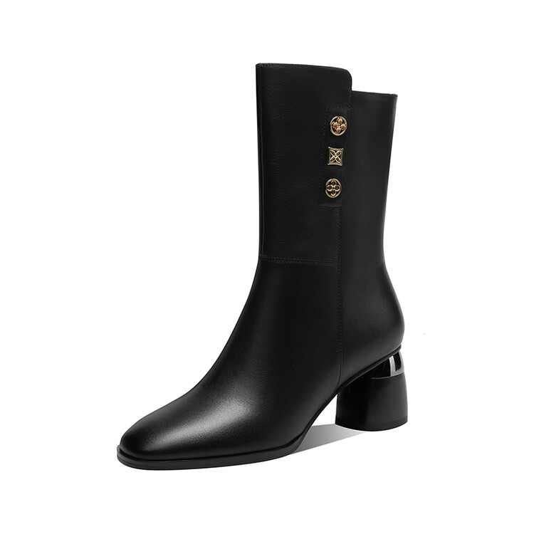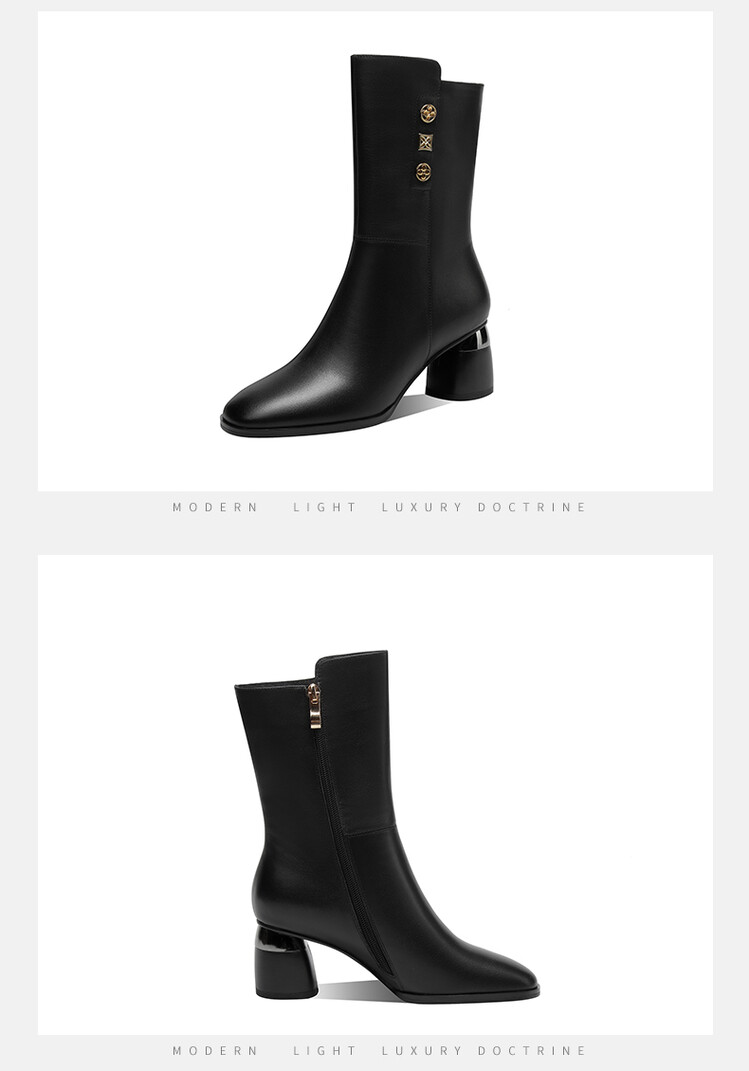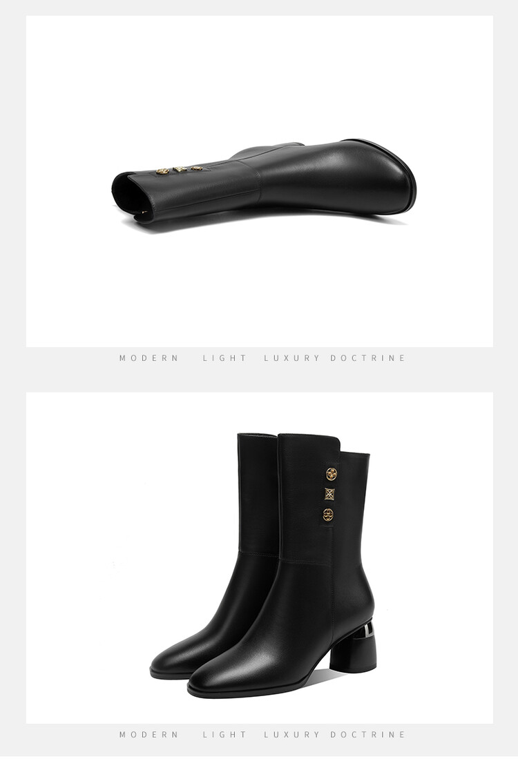 【预售5天】牛皮圆头中筒靴新款舒适真皮加绒高跟半筒靴百搭显瘦粗跟骑士靴DPJ&6028