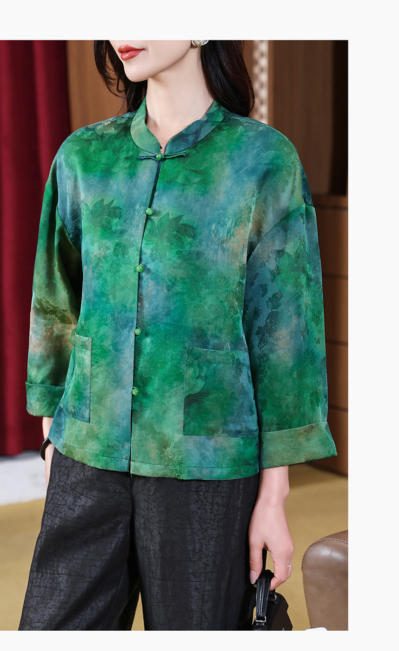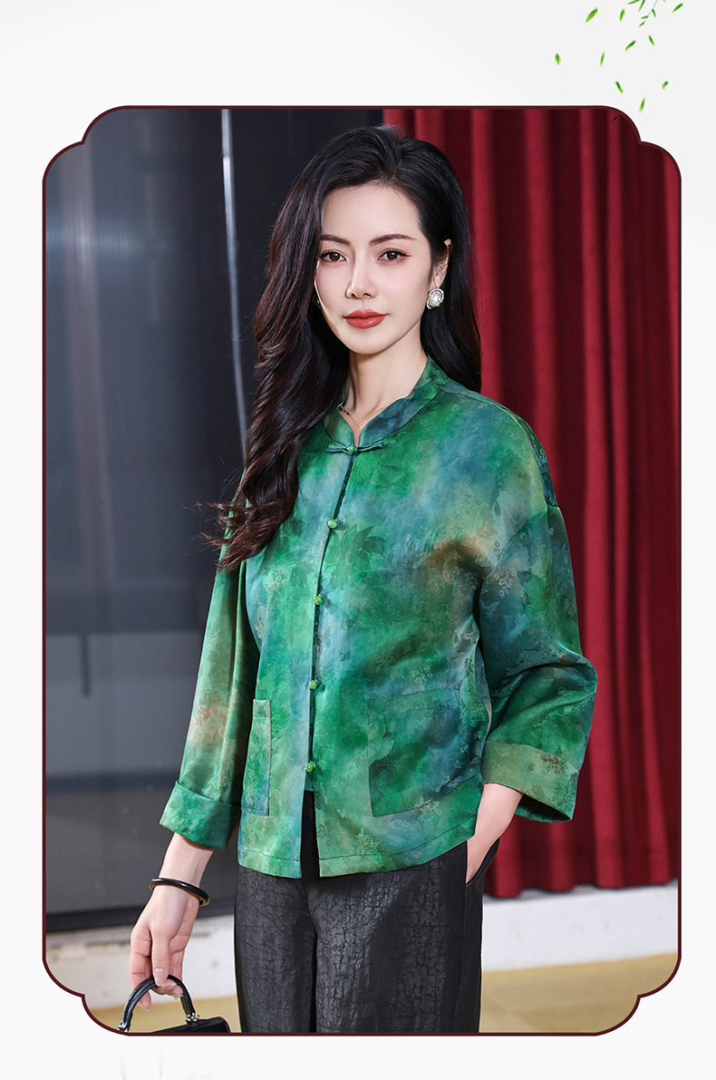 TC 221902真丝国风立领扎染印花香云纱桑蚕丝盘扣上衣两件套装