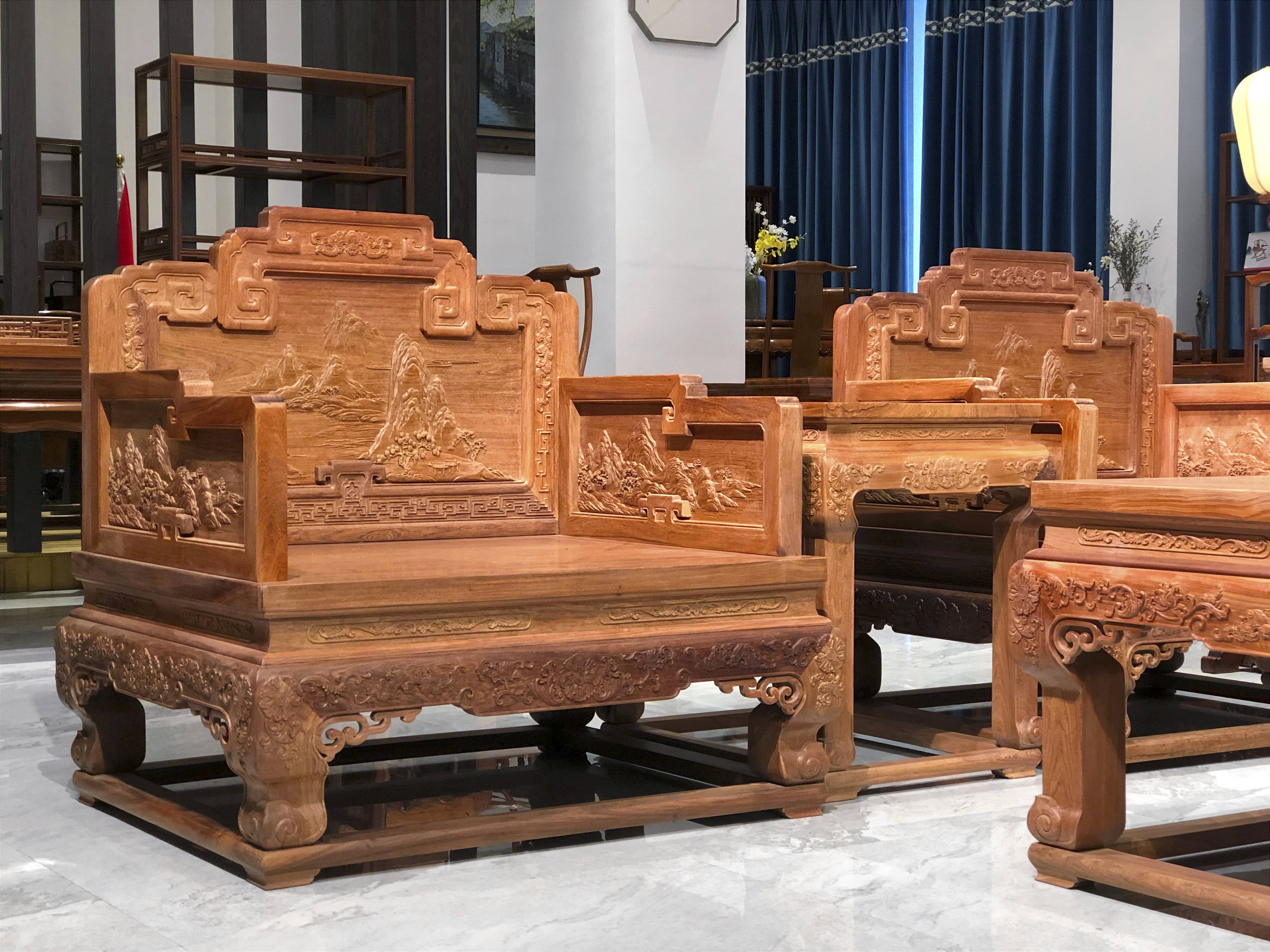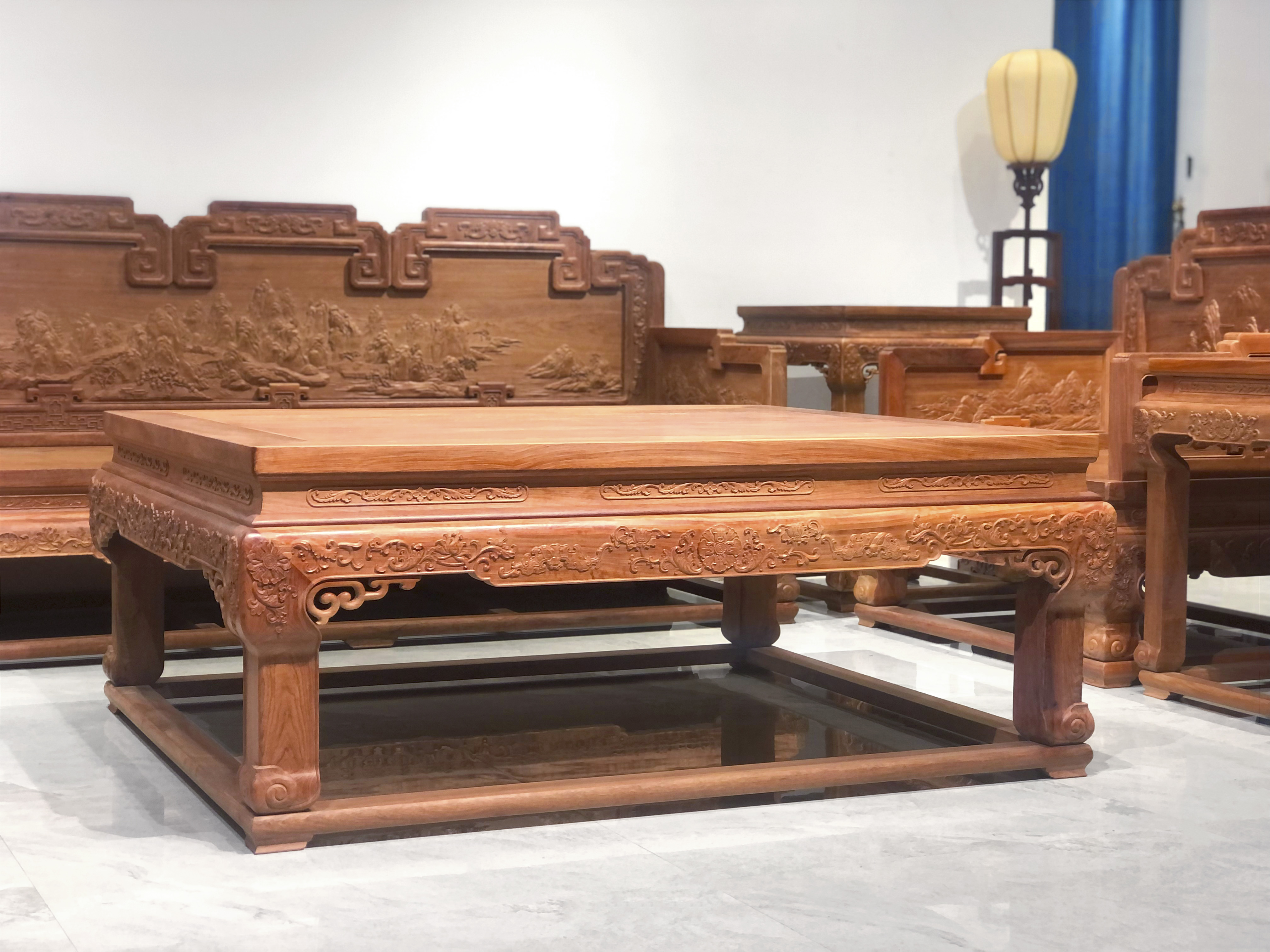 宝座沙发三屏式,如意形搭脑,沙发布满雕刻纹饰,靠背板上部搭脑浮雕雕蝙蝠纹,背板正中及两侧面板浮雕山水纹饰,座面攒框镶板,面下有束腰,直牙条,正中下垂洼堂肚,束腰、腿部及牙板雕饰宝相花纹饰,枝叶卷曲饱满、富丽华贵,安透雕拐子纹托角牙,三弯式腿,外翻云纹足,敦厚腿足直落于托泥之上,托泥下有龟脚,小茶几隐藏式抽屉,增加储存空间,轻松收纳。