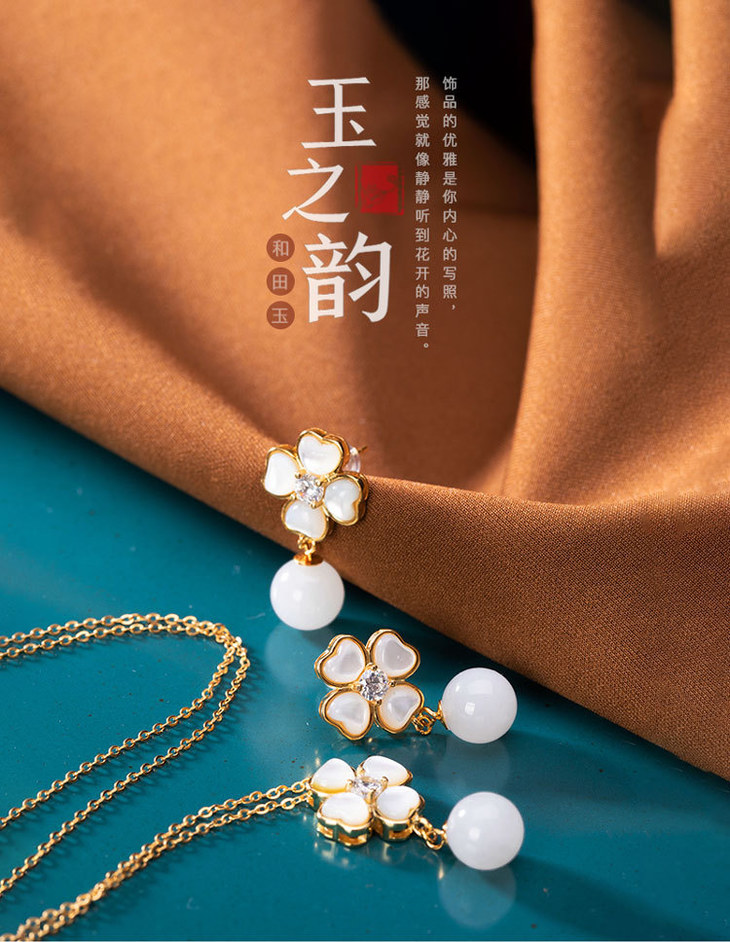 YLY-001S925纯银镶嵌和田白玉四叶草圆珠耳钉