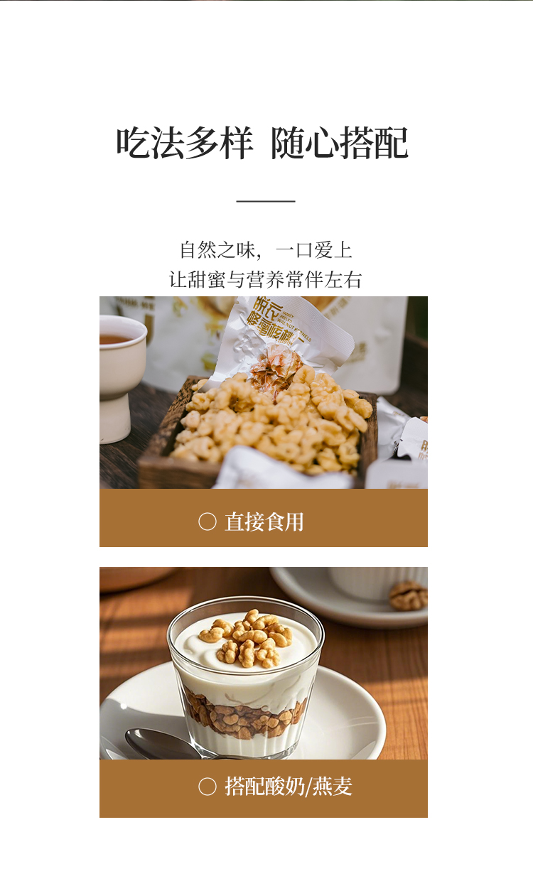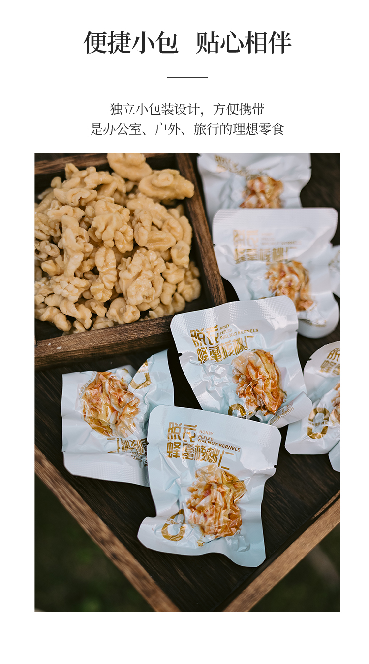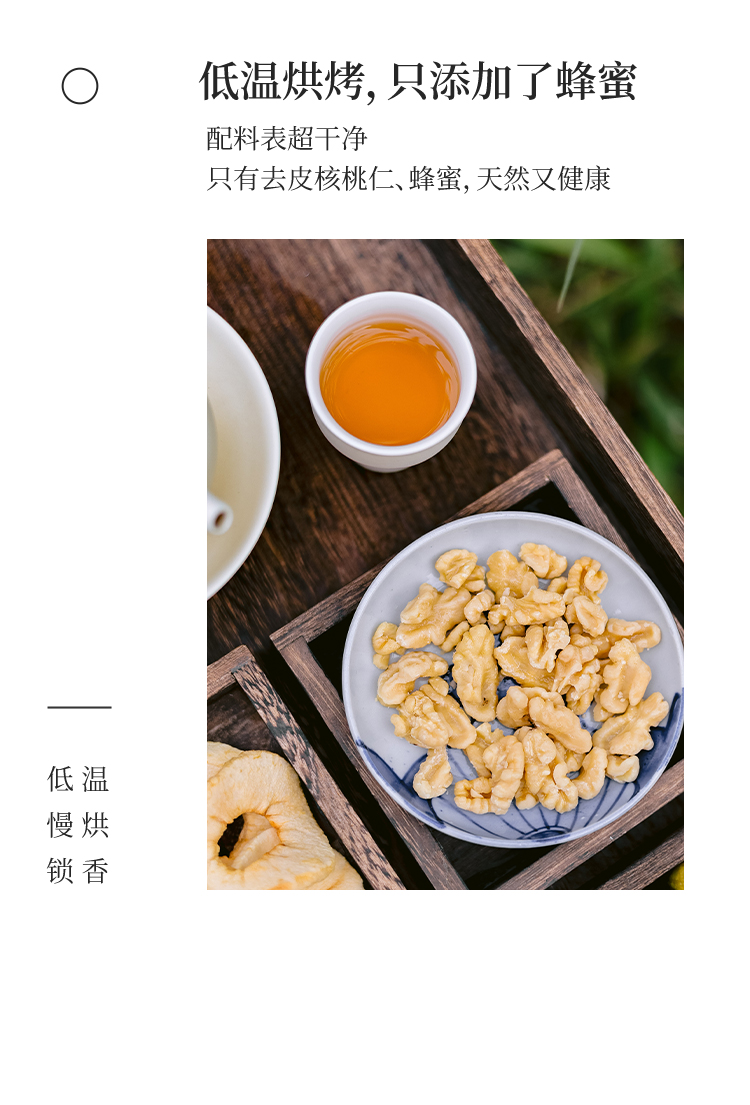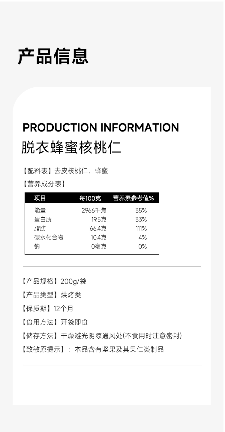 【规格】:200g/袋【发货地】:河北、新疆乌鲁木齐【产地】:河北保定、 新疆乌鲁木齐【发货快递】:韵达、中通快递【不发货区域】:西藏、港澳台【发货时效】:48小时【储存方法】:干燥避光阴凉通风处(不食用时注意密封)【保质期】12个月【产品标准代号】:GB/T 22165 【食品生产许可证编号】:SC11765010600116/SC11813062600913【条形码】:6972343311133【配料表】:去皮核桃仁、蜂蜜【致敏原提示】:本品含有坚果及其果仁类制品