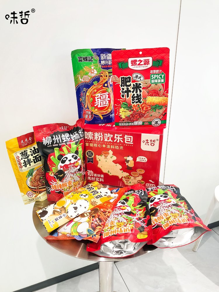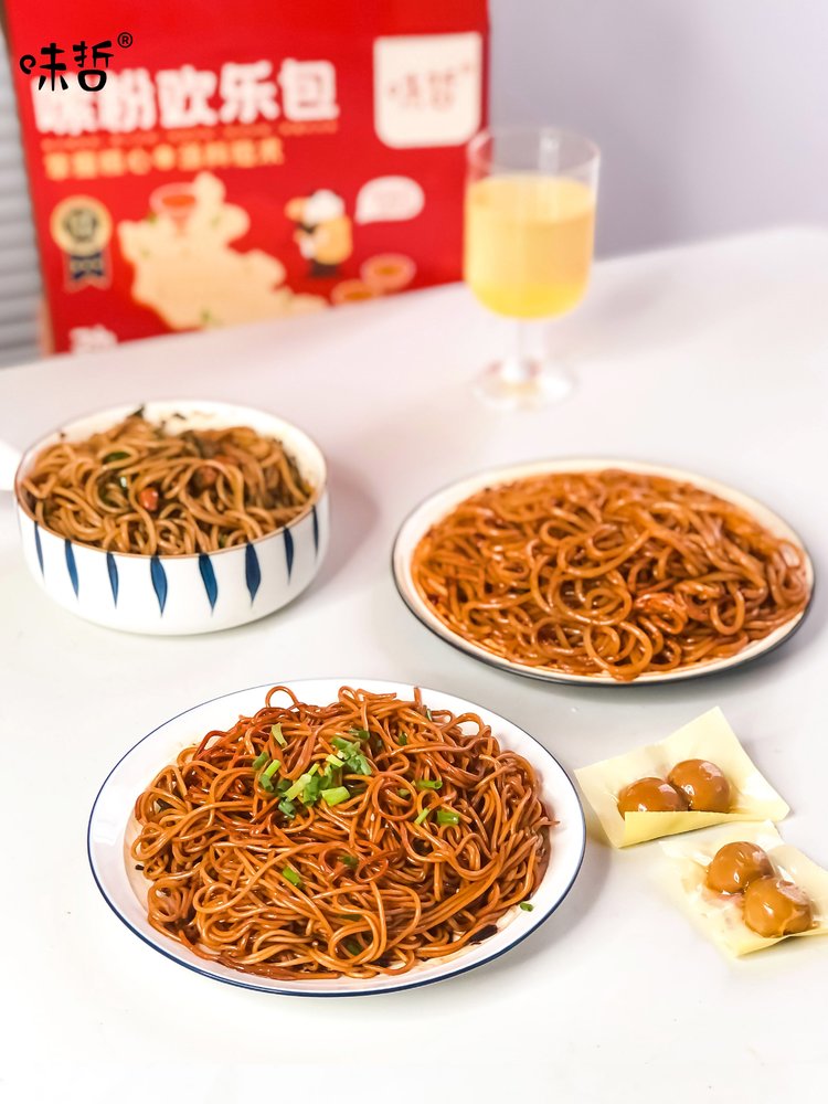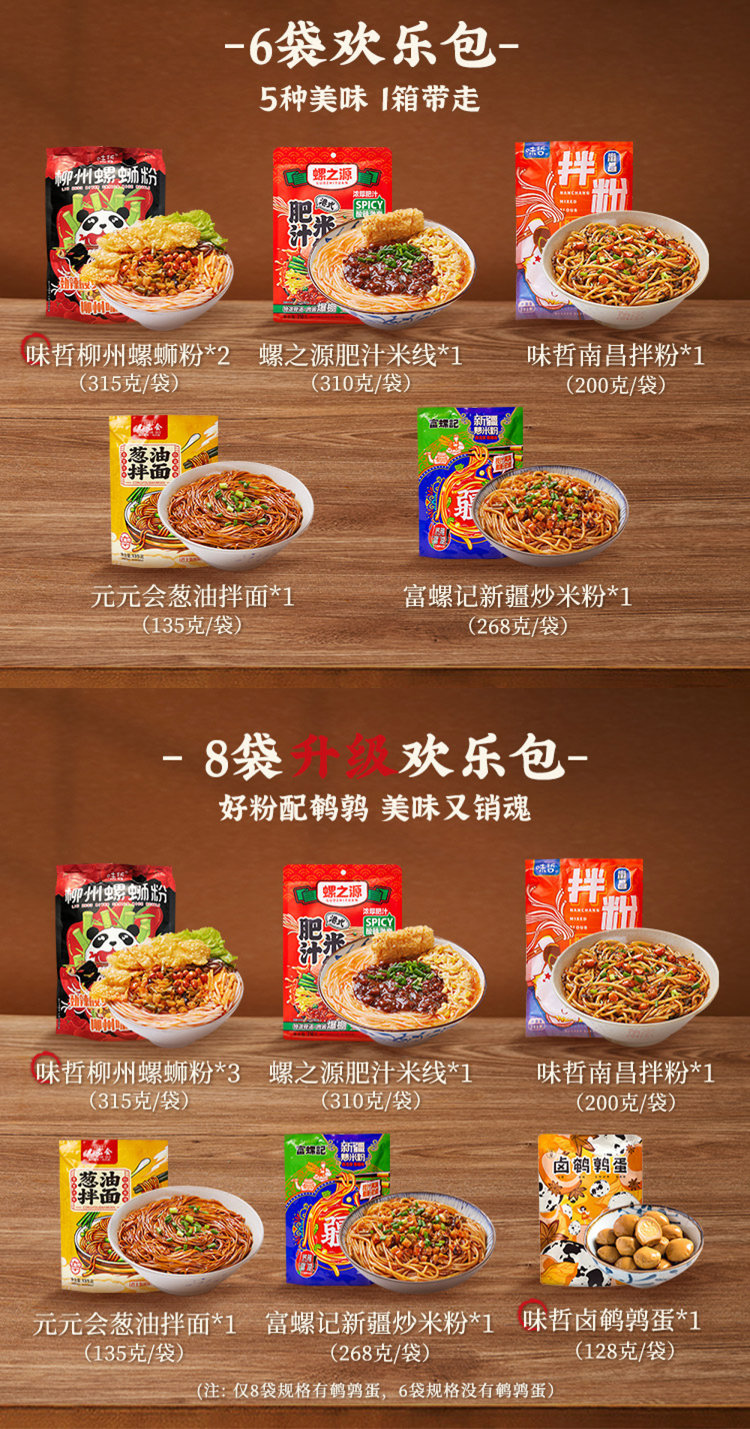 味哲柳州螺蛳粉*3(315克/袋)+螺之源肥汁米线*1(310克/袋)+味哲南昌拌粉*1(200克/袋)+元元会葱油拌面*1(135克/袋)0+富螺记新疆炒米粉*1(268克/袋)+味哲卤鹌鹑蛋*1(128克/袋)