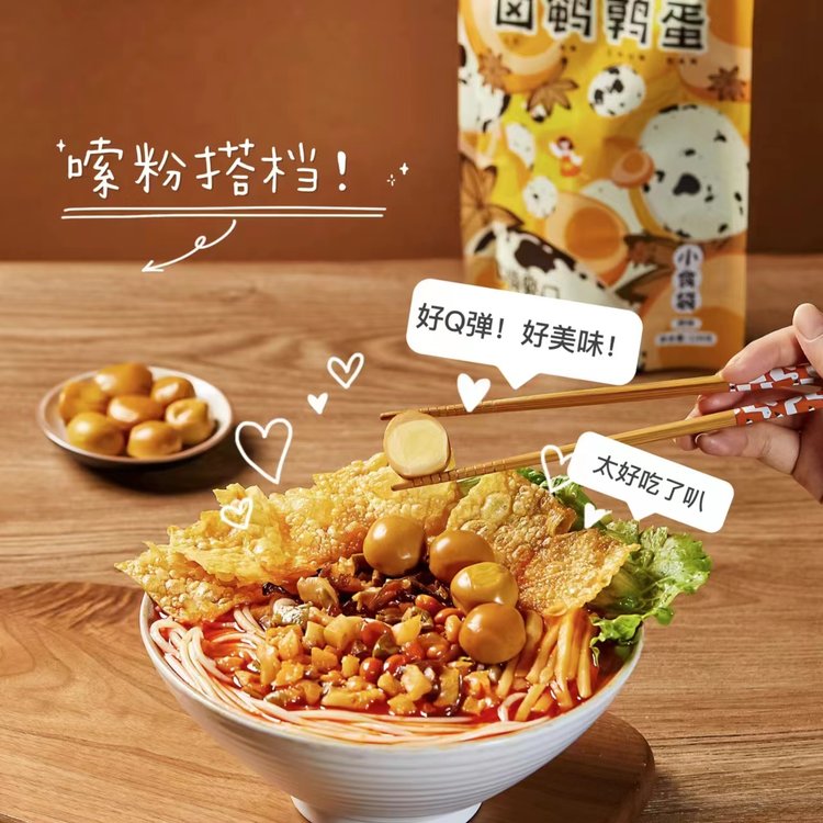 甄选新鲜、优质鹌鹑蛋,新鲜卤制,地道卤水超够味!每一颗都Q弹爽口、劲道十足!好粉配鹌鹑,宵夜更销魂!