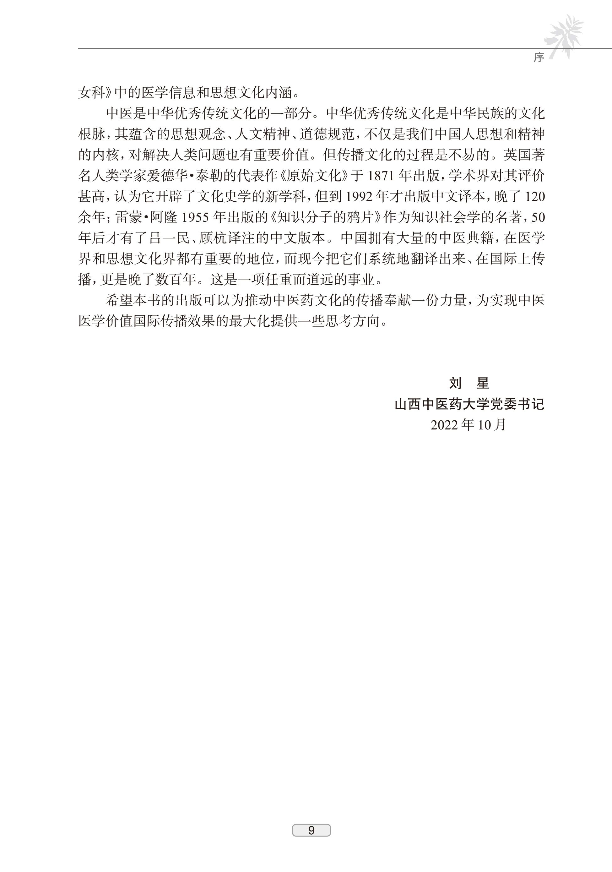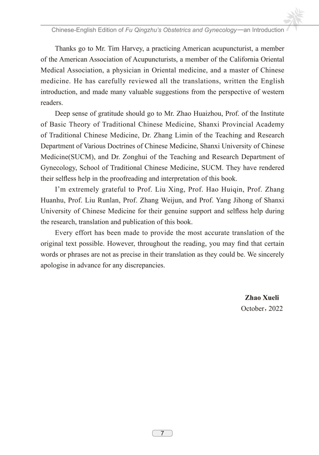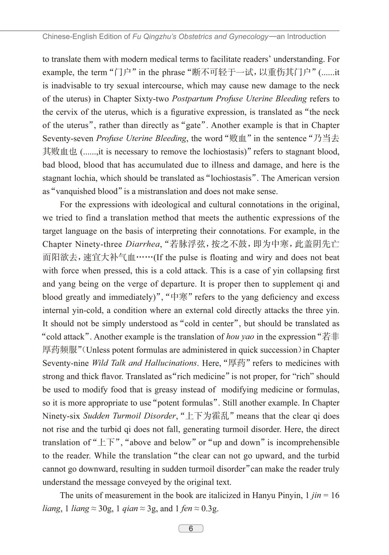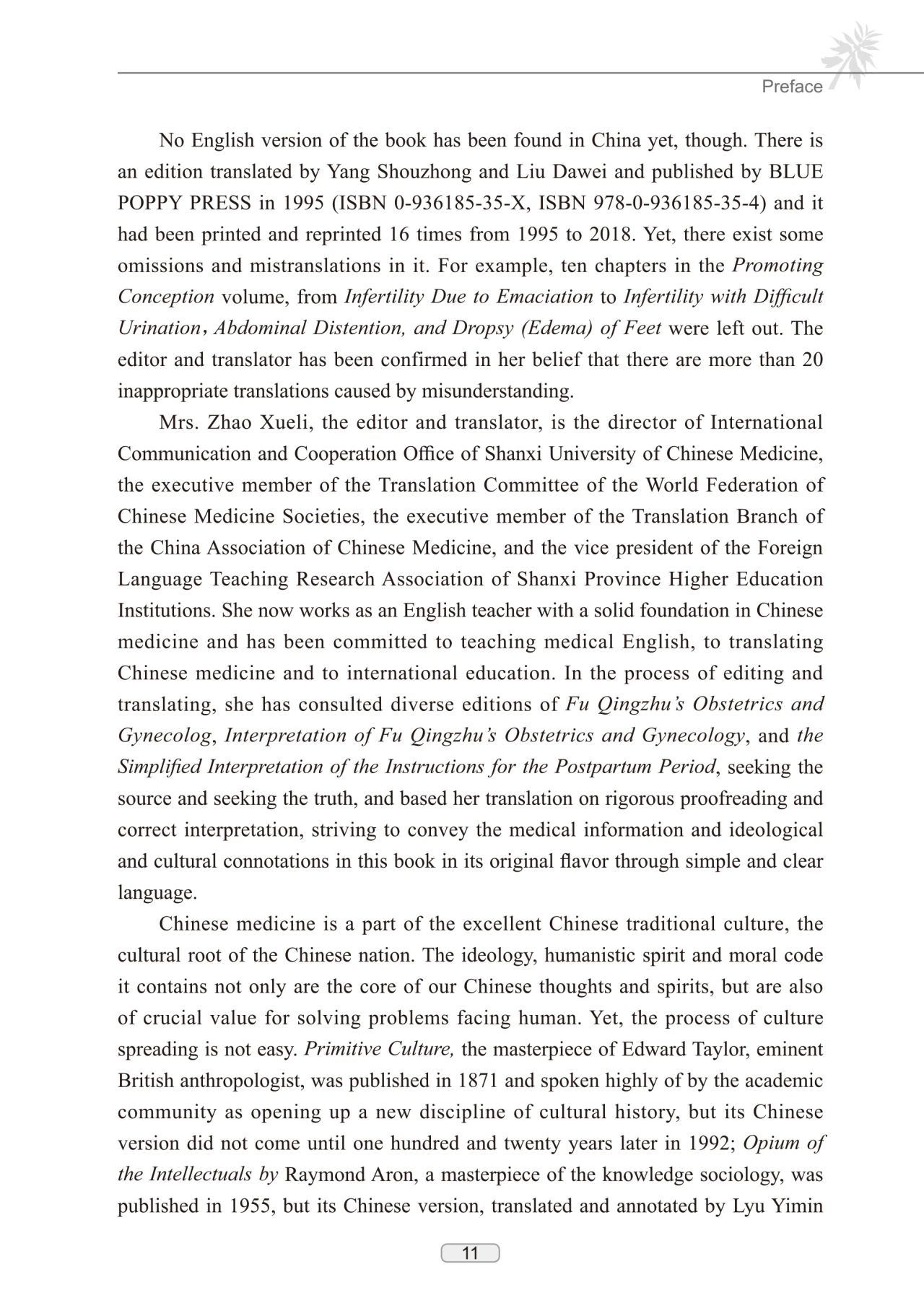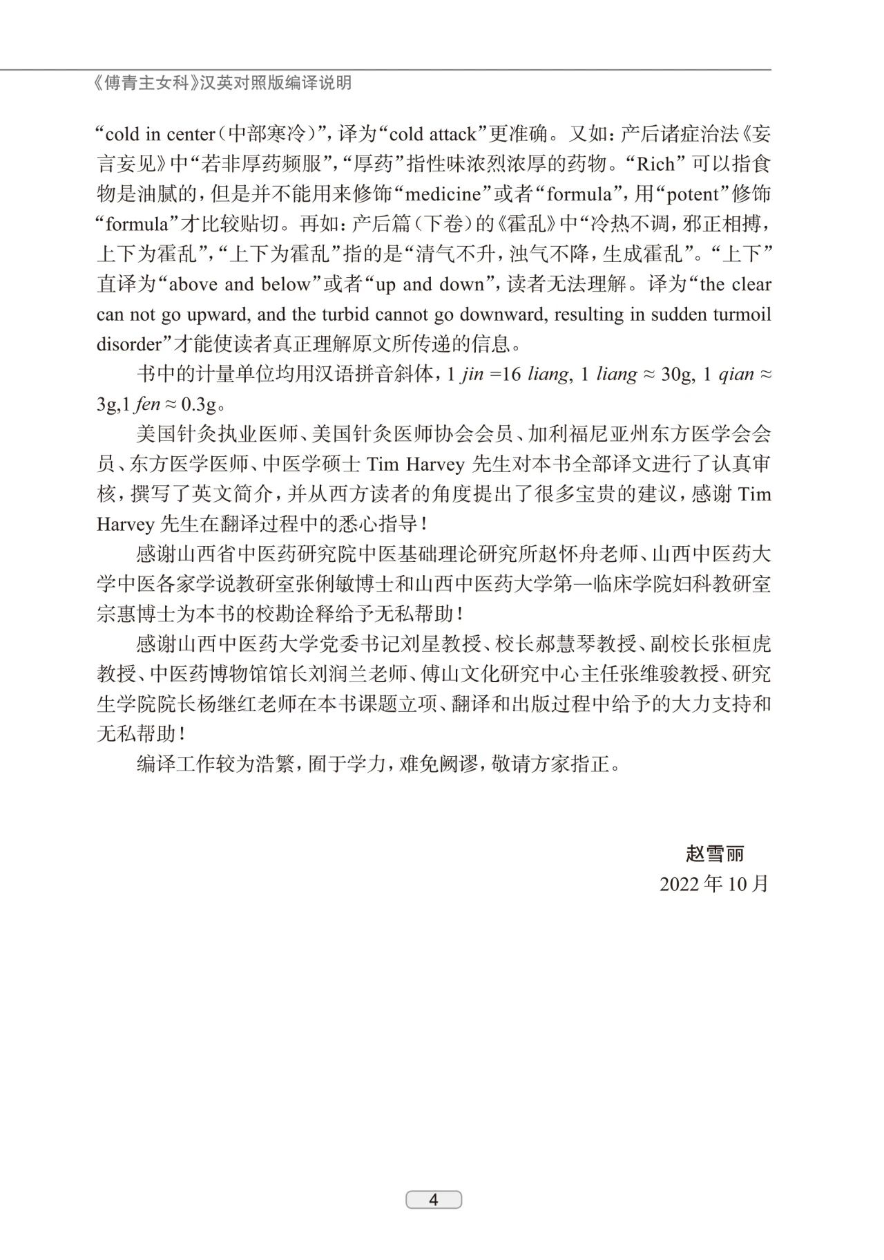 1. 目前《傅青主女科》只有一部英译本,以全英文形式在美国出版发行。但其翻译内容不完整,对原文个别术语的翻译有待商榷。在国内尚未有《傅青主女科》的英译本出版。本书是国内第一部《傅青主女科》汉英对照本,有助于中医文化海外传播,促进中医药国际交流与发展。