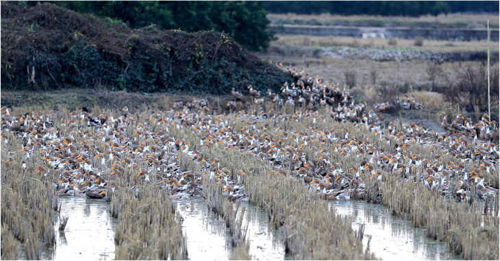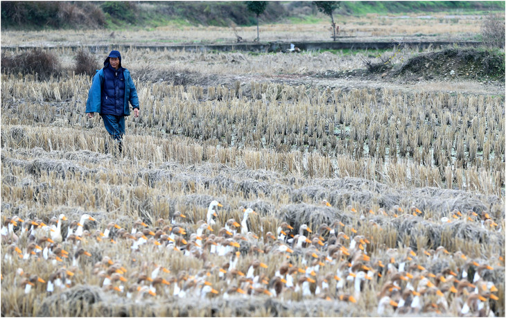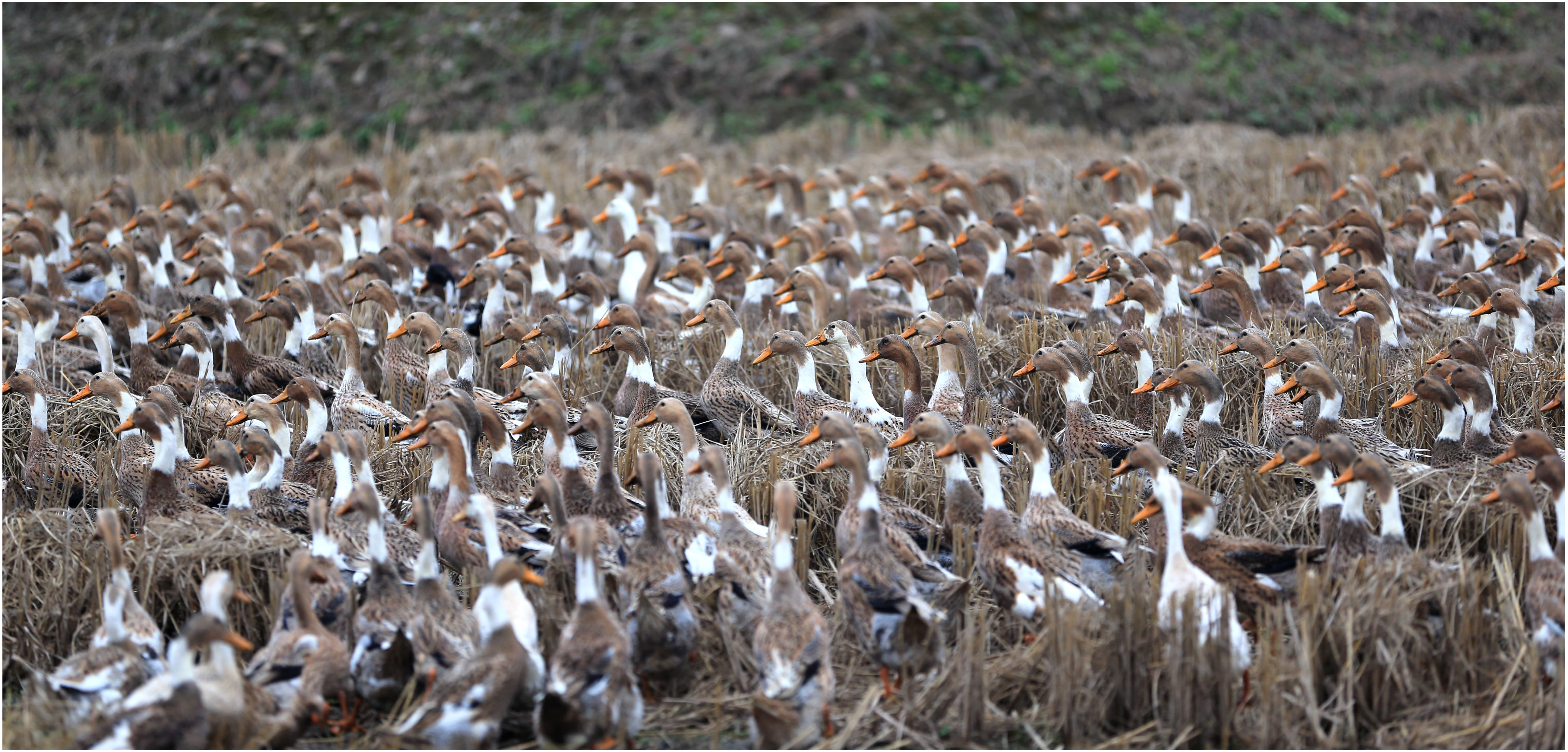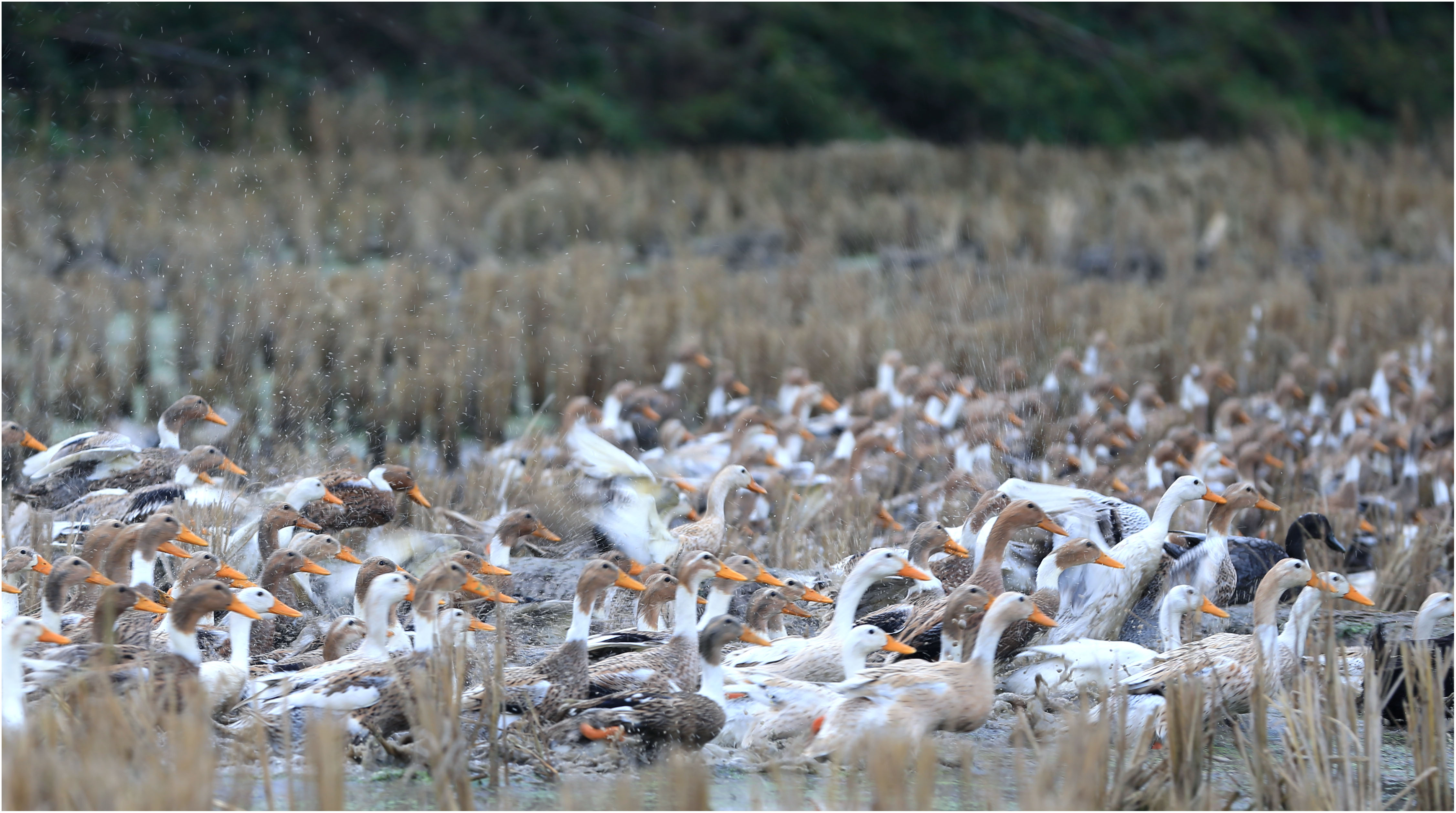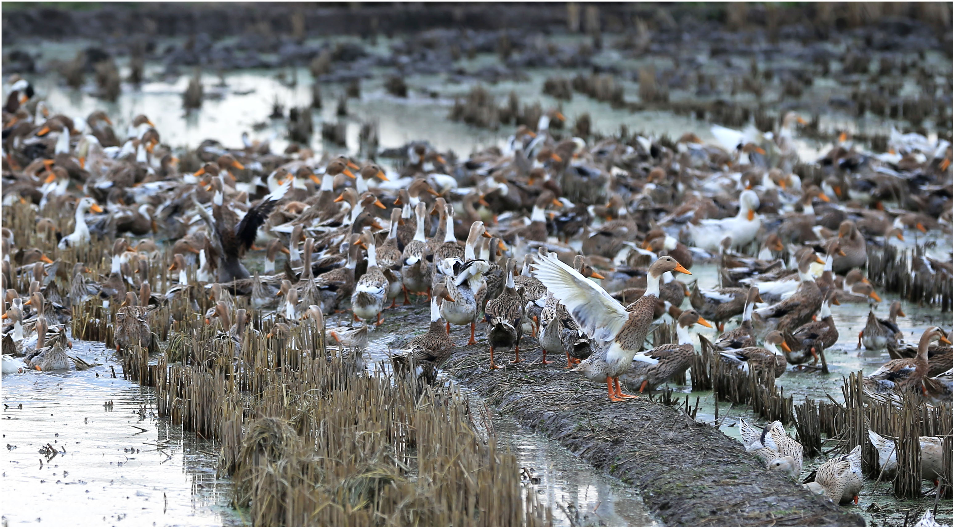 稻子收割后,这里就是鸭子的天堂,稻穗、田螺、泥鳅、都是它的美食