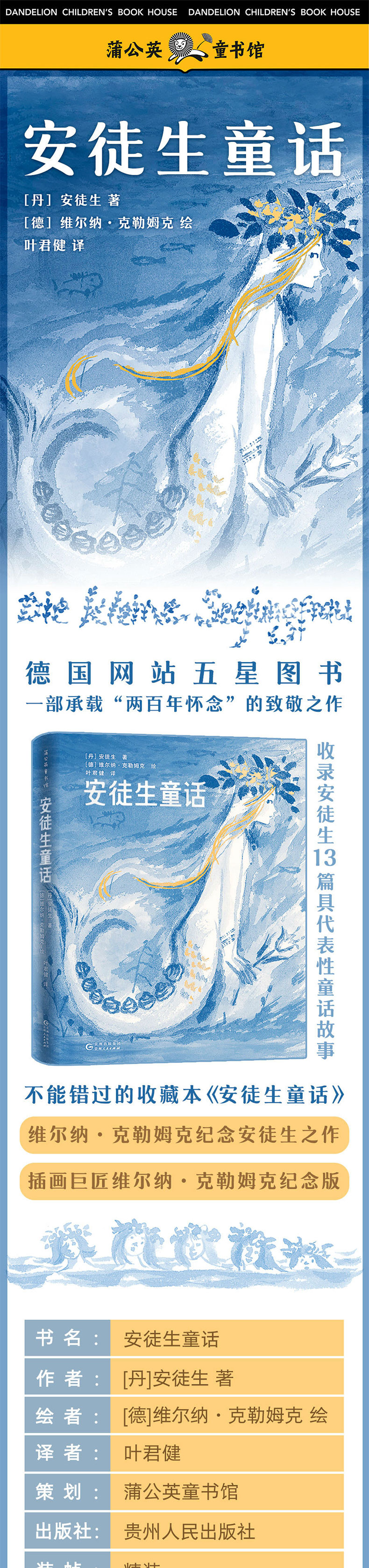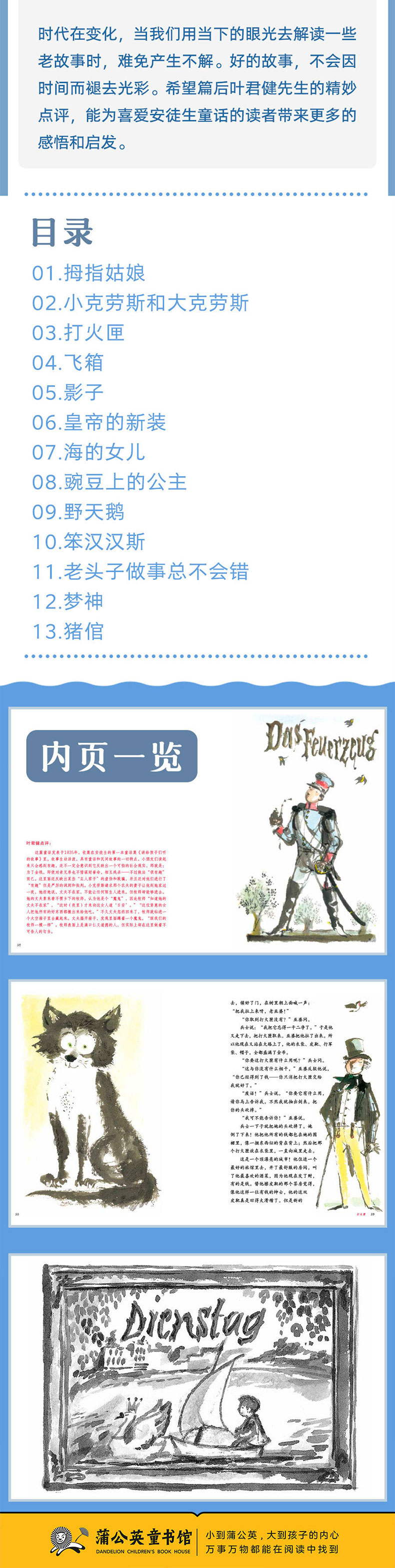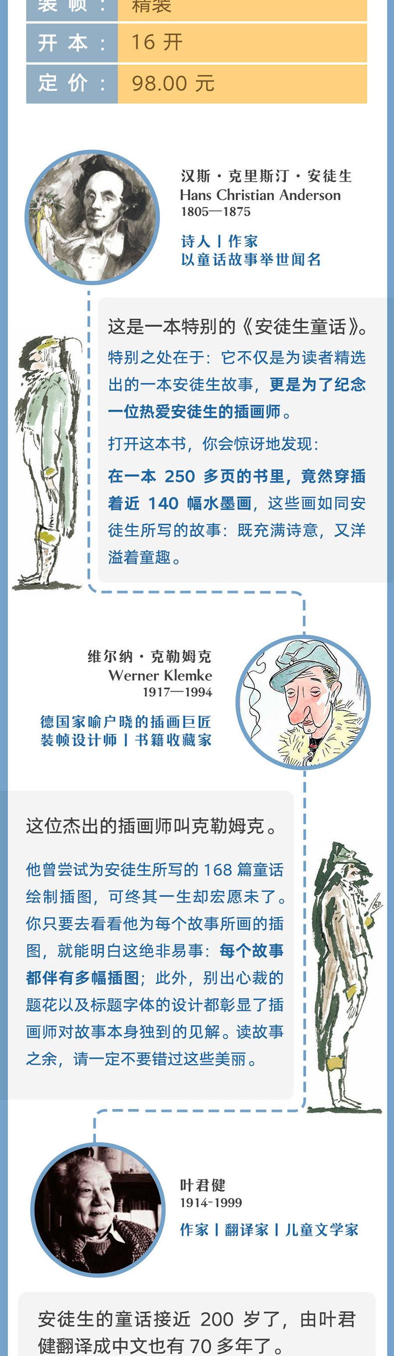 这本安徒生童话选包含了安徒生不同时期所创作的13篇童话故事。有大家熟知的《海的女儿》《豌豆上的公主》《拇指姑娘》,也有如《小克劳斯和大克劳斯》《影子》等情节生动、发人深省的童话故事。打开这本散发着浓郁诗情与幽默的《安徒生童话》,小读者还将看到浪漫的《野天鹅》,充满异域幻想的《打火匣》《飞箱》,取材自丹麦民间故事的《梦神》《老头子做事总不会错》等。这些故事,连同德国插画师维尔纳·克勒姆克散发浪漫与艺术气息的水墨画插图,将构成孩子们童年阅读里的金色回忆。