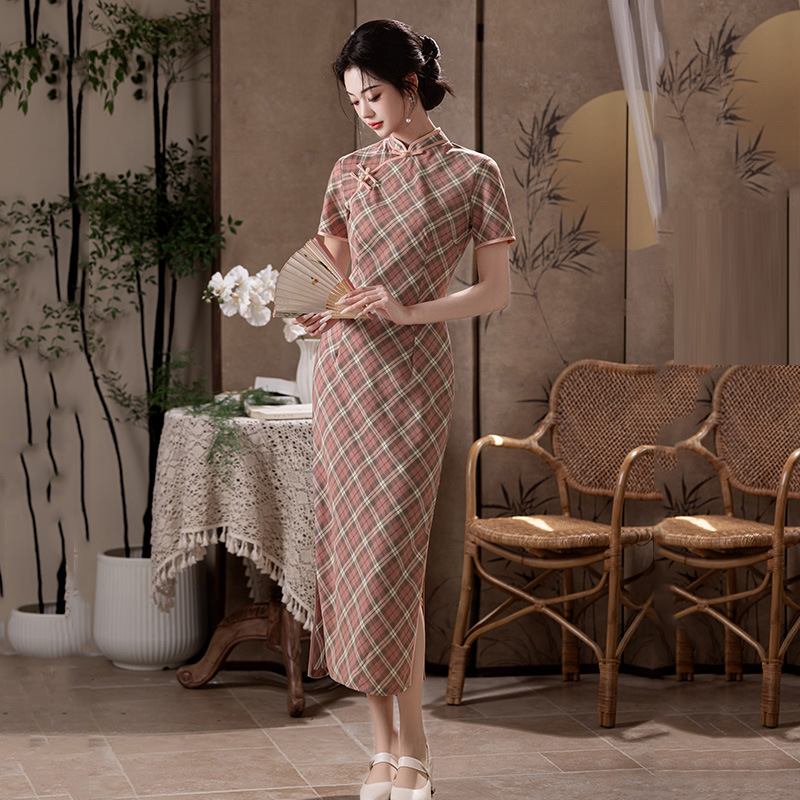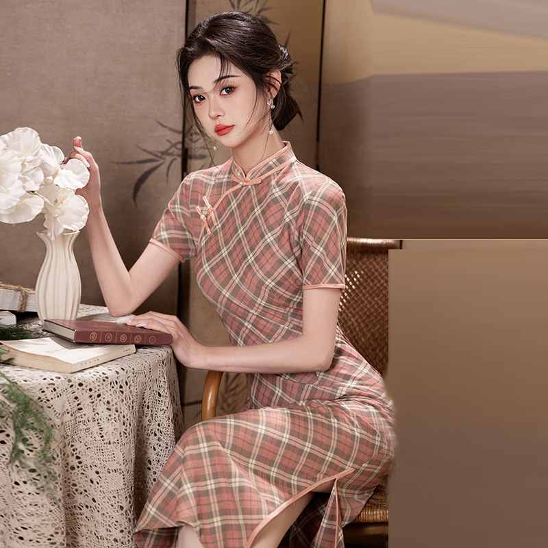 SC21874温柔风粉色格子旗袍2025春夏新款修身显瘦改良少女中式连衣裙女装 商品图1