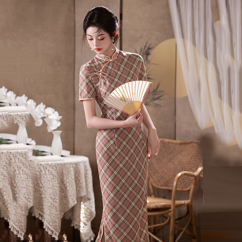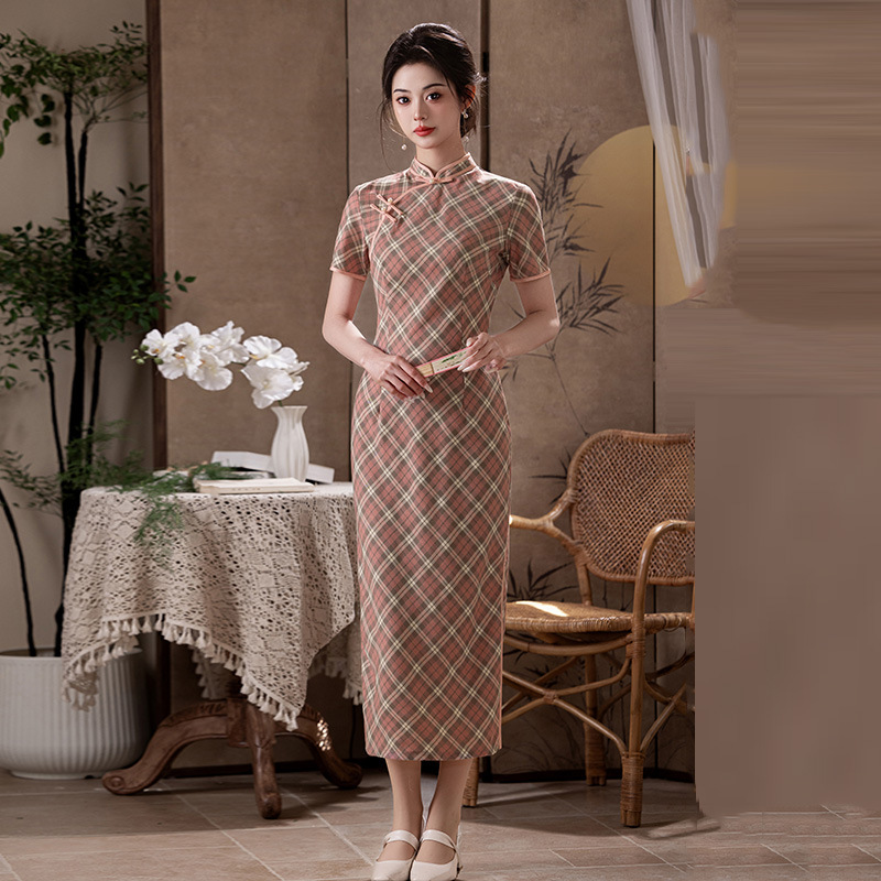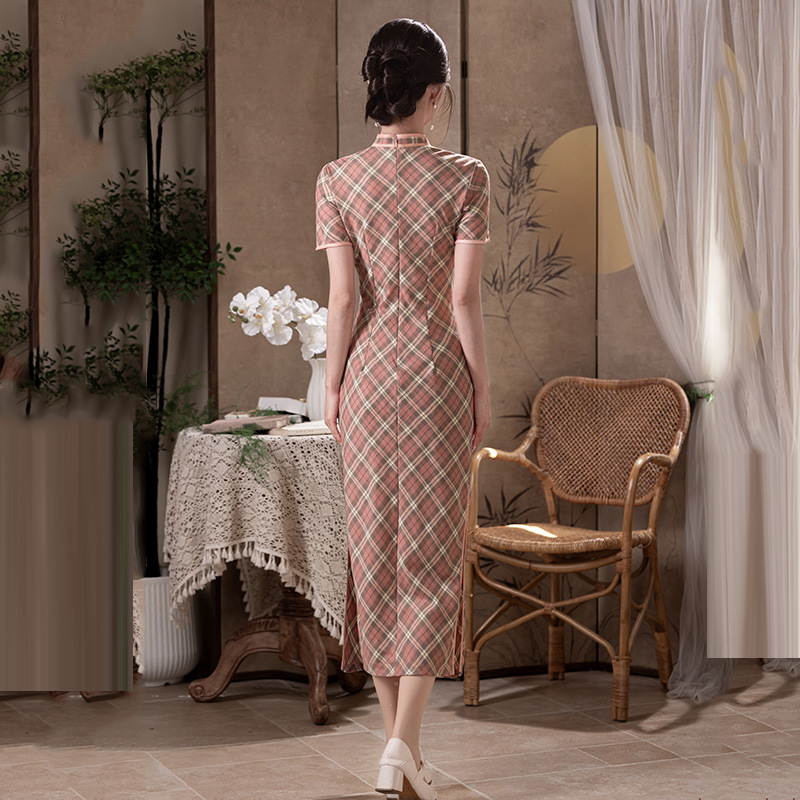 SC21874温柔风粉色格子旗袍2025春夏新款修身显瘦改良少女中式连衣裙女装