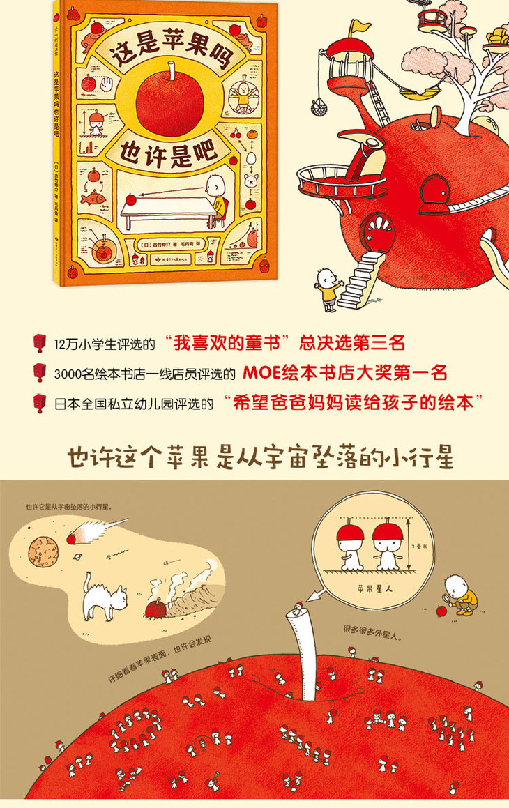 在成为两个孩子的爸爸之后,吉竹伸介 40 岁时出版了首部绘本作品《这是苹果吗也许是吧》,孩子能从中感受到“自由想象”的乐趣,一个人也可以乐呵呵地读下去。这部绘本获得 3000 位日本一线店员评选的“MOE 绘本书店大奖”第-一-名、12 万日本小学生评选的“我喜欢的童书”总决选第三名、日本产经儿童出版文化奖·美术奖。由此,吉竹伸介成为绘本界备受瞩目的作家。