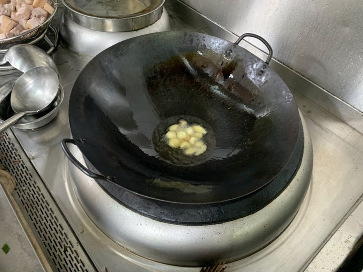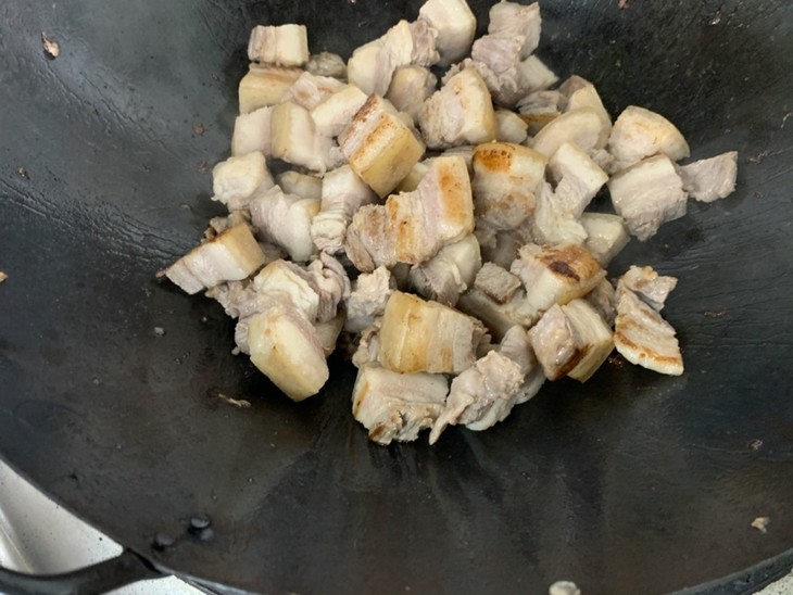 2. 热油中加入大蒜和姜,炸到香味溢出后捞起,加入五花肉煎至两面金黄起锅备用;