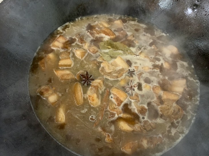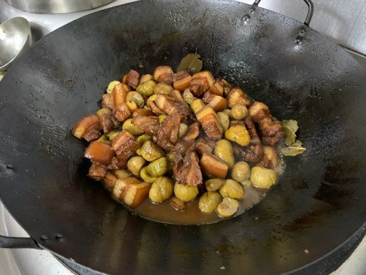 4. 最后加入八角、桂皮、香叶和水末过五花肉,炖煮30分钟后加入栗子再炖煮20分钟即可起锅。