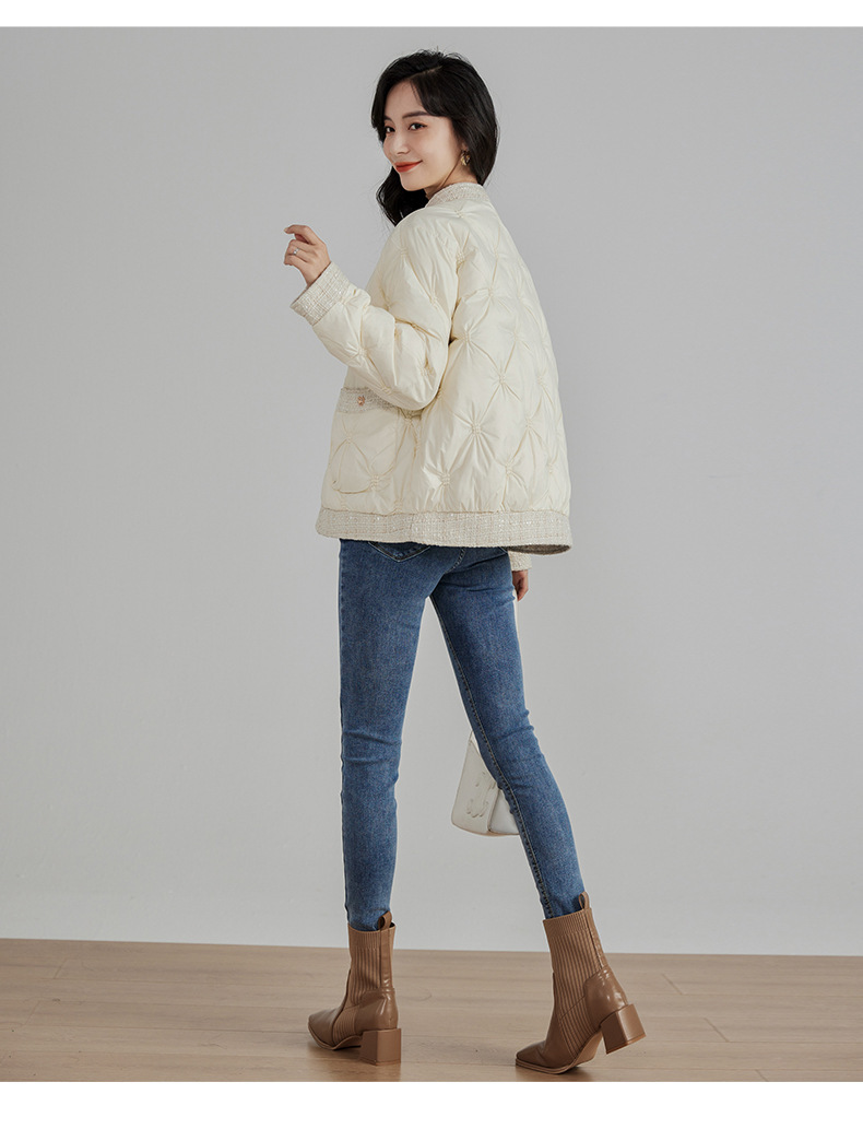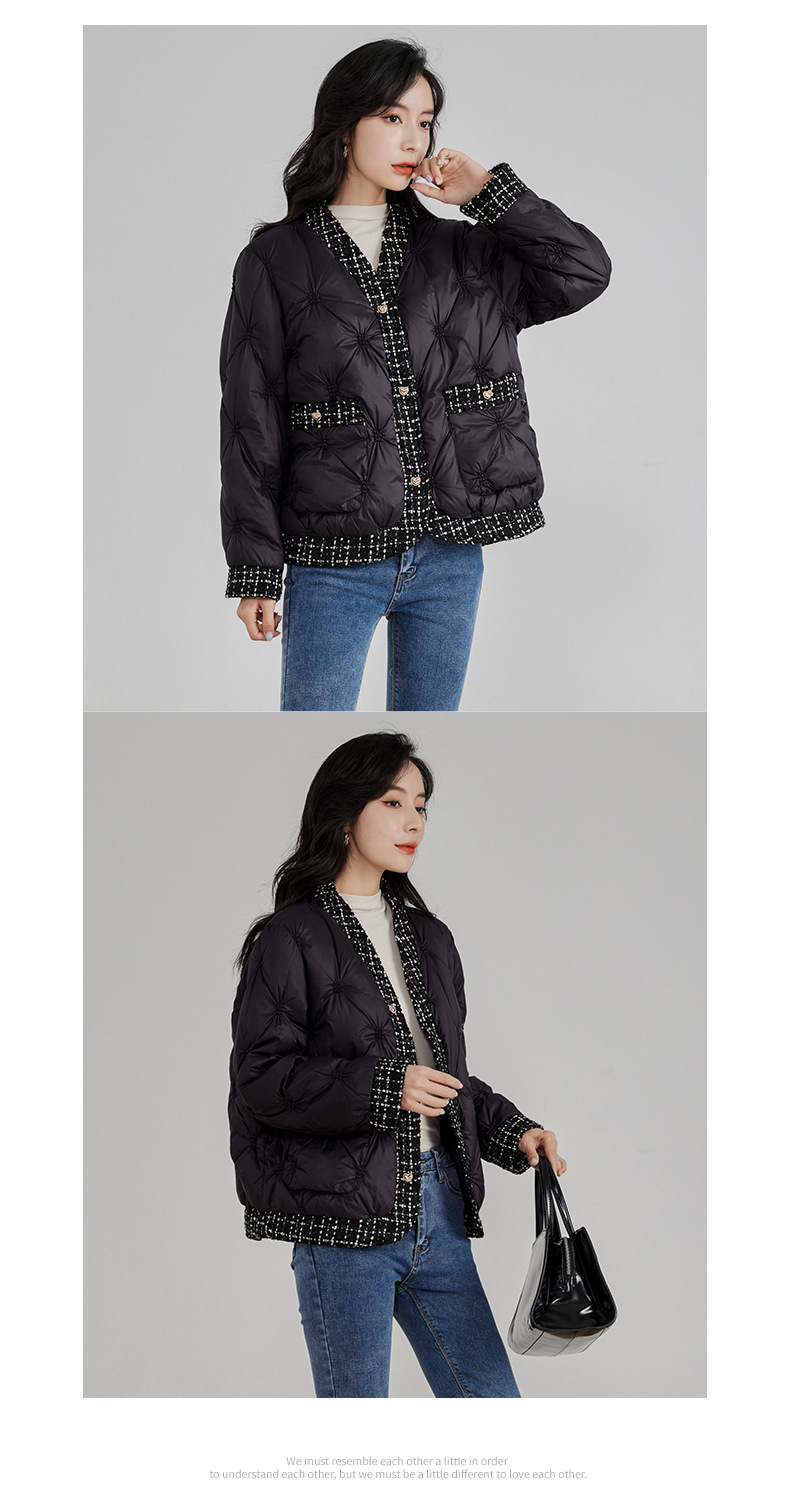 百媚生 格子边V领粗花呢花边小香风羽绒服女F6145