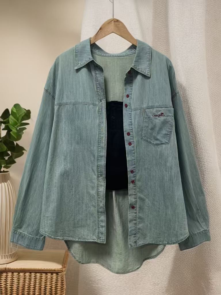 【时装系列】ME TOWN'S (软料)做旧水洗牛仔翻领前短后长全棉衬衫-喜出