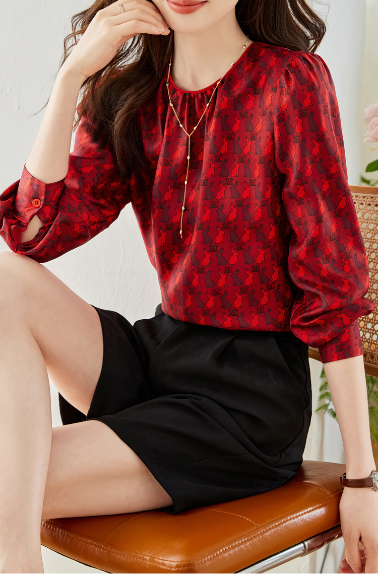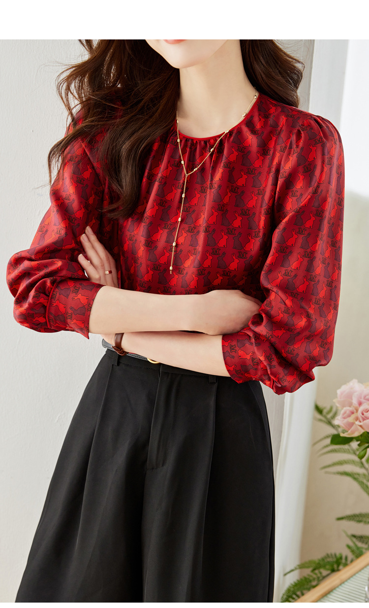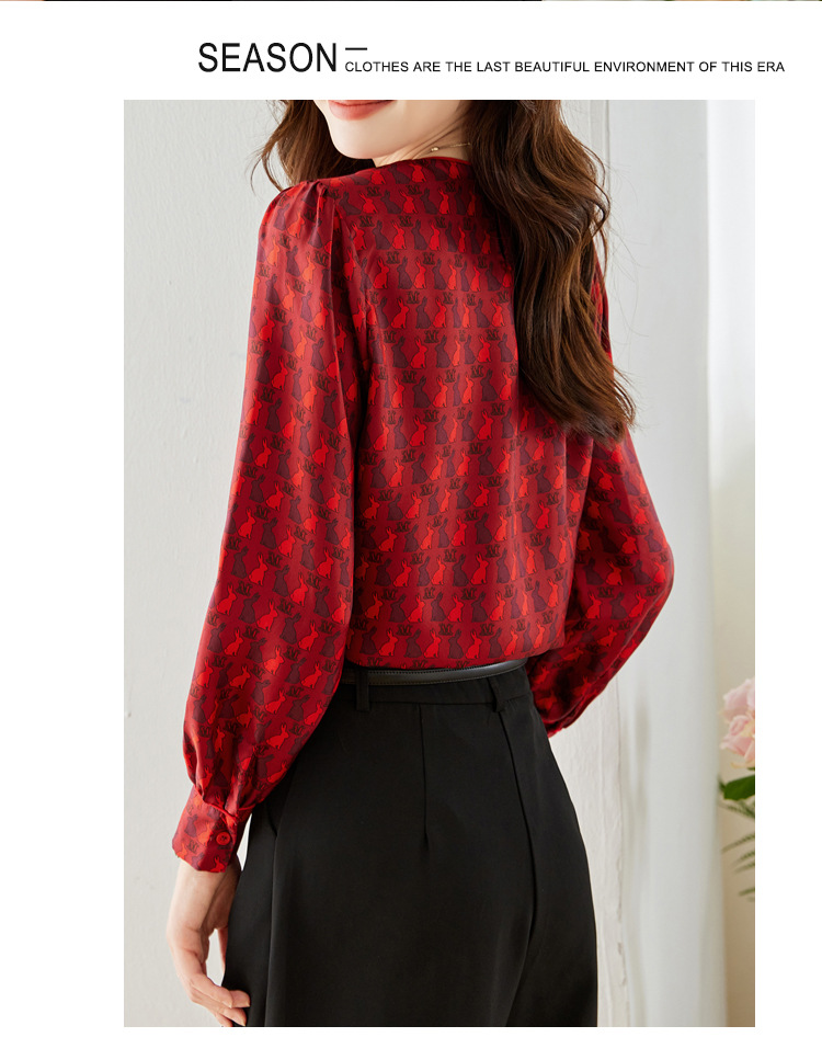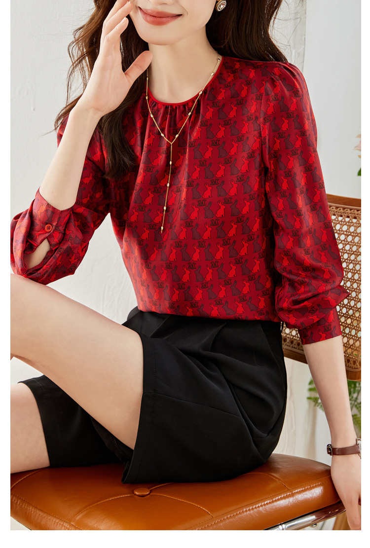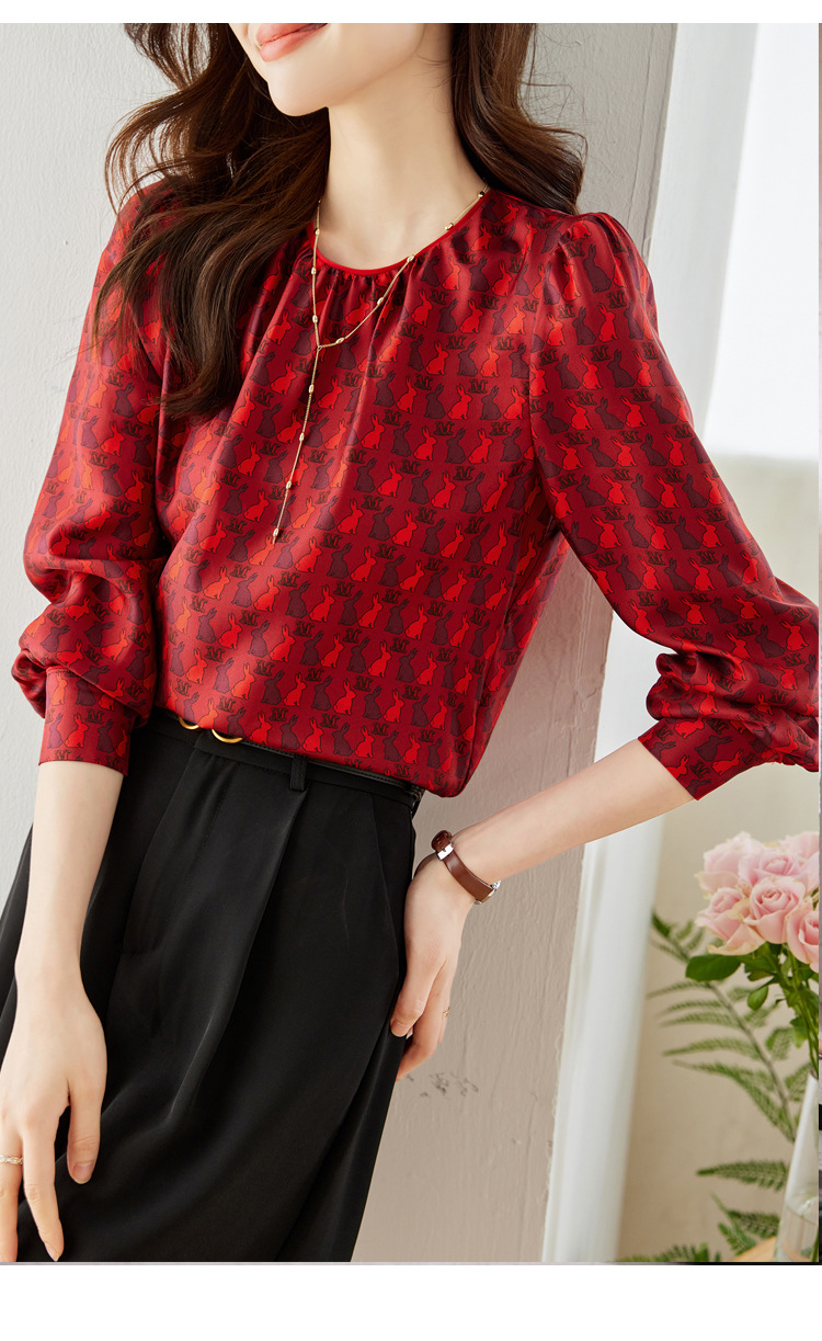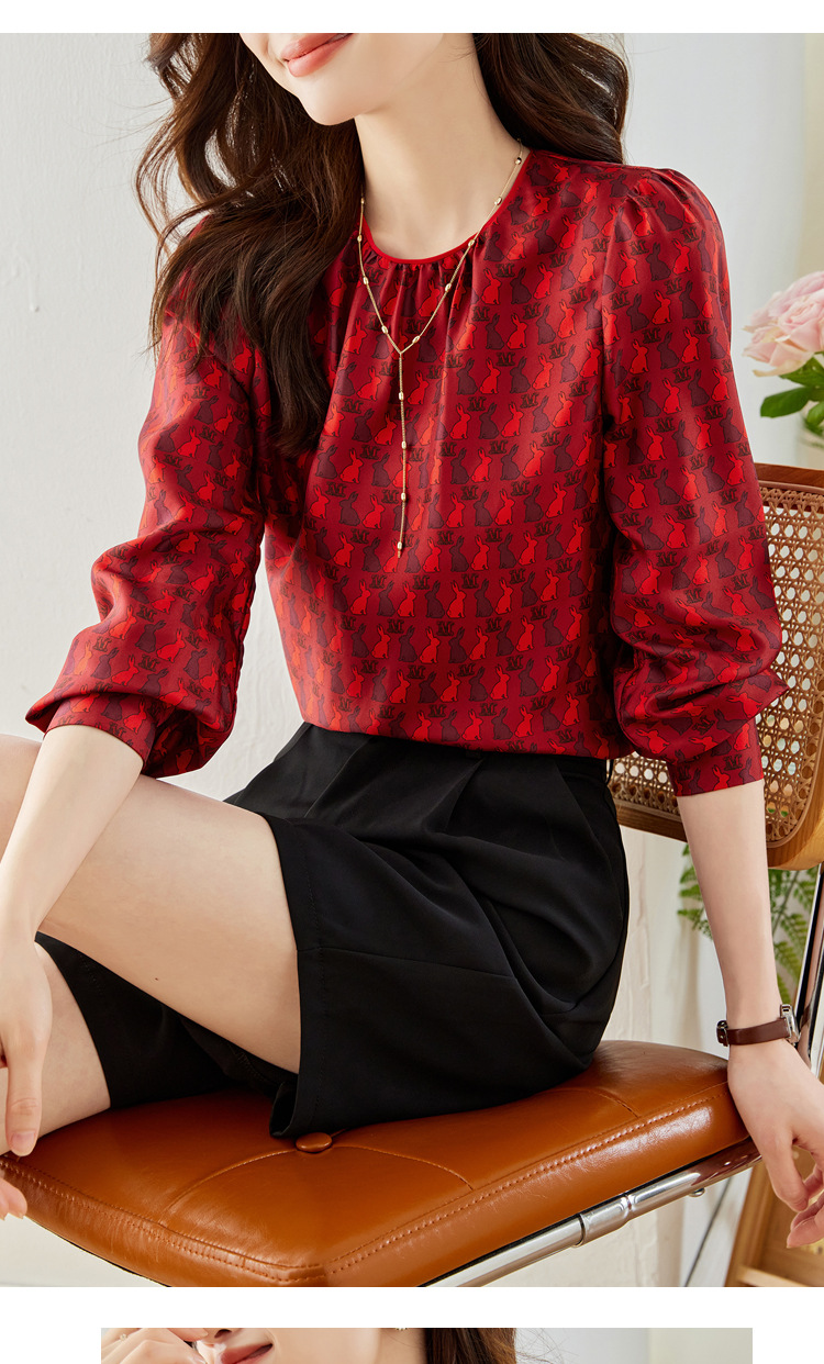 KQL 638T8692印花斜纹仿真丝衬衫气质通勤圆领衬衫