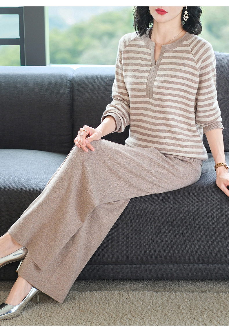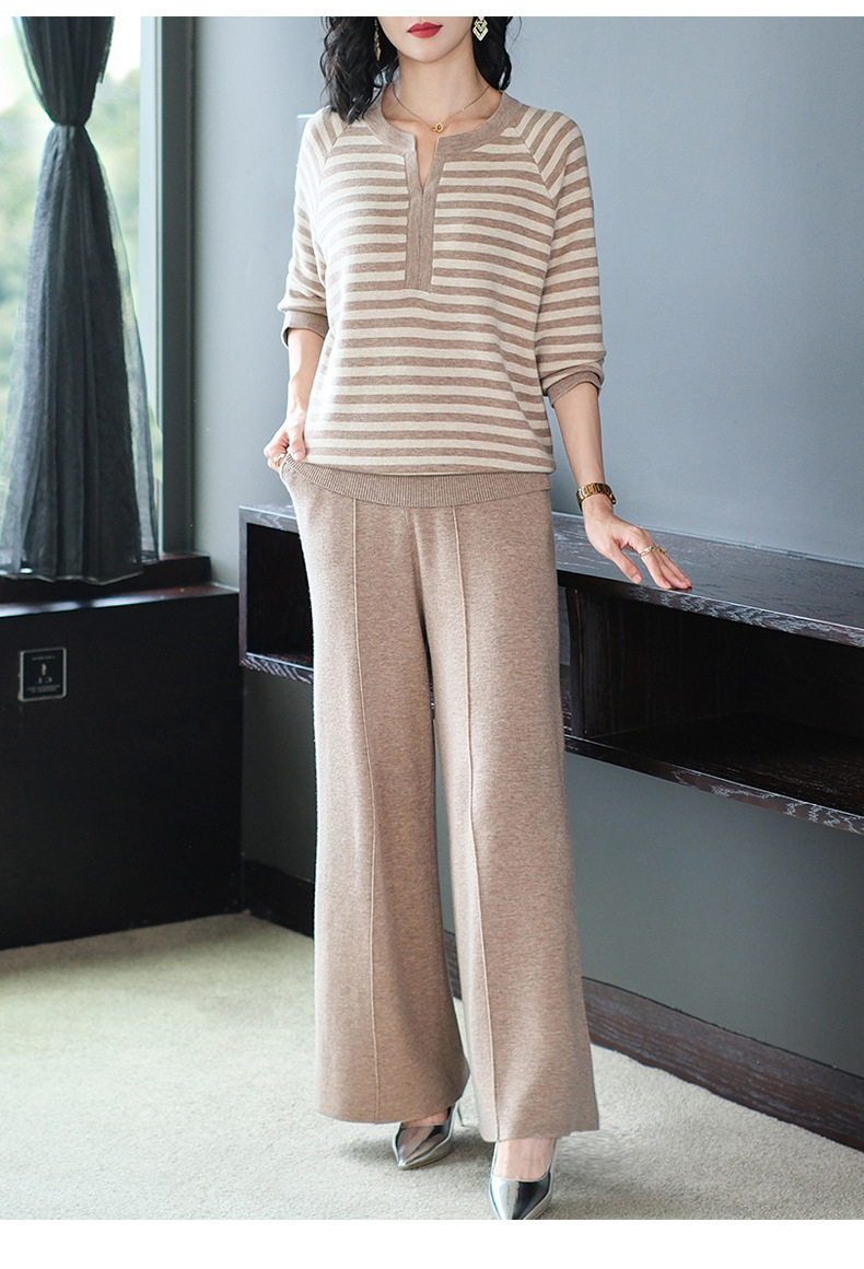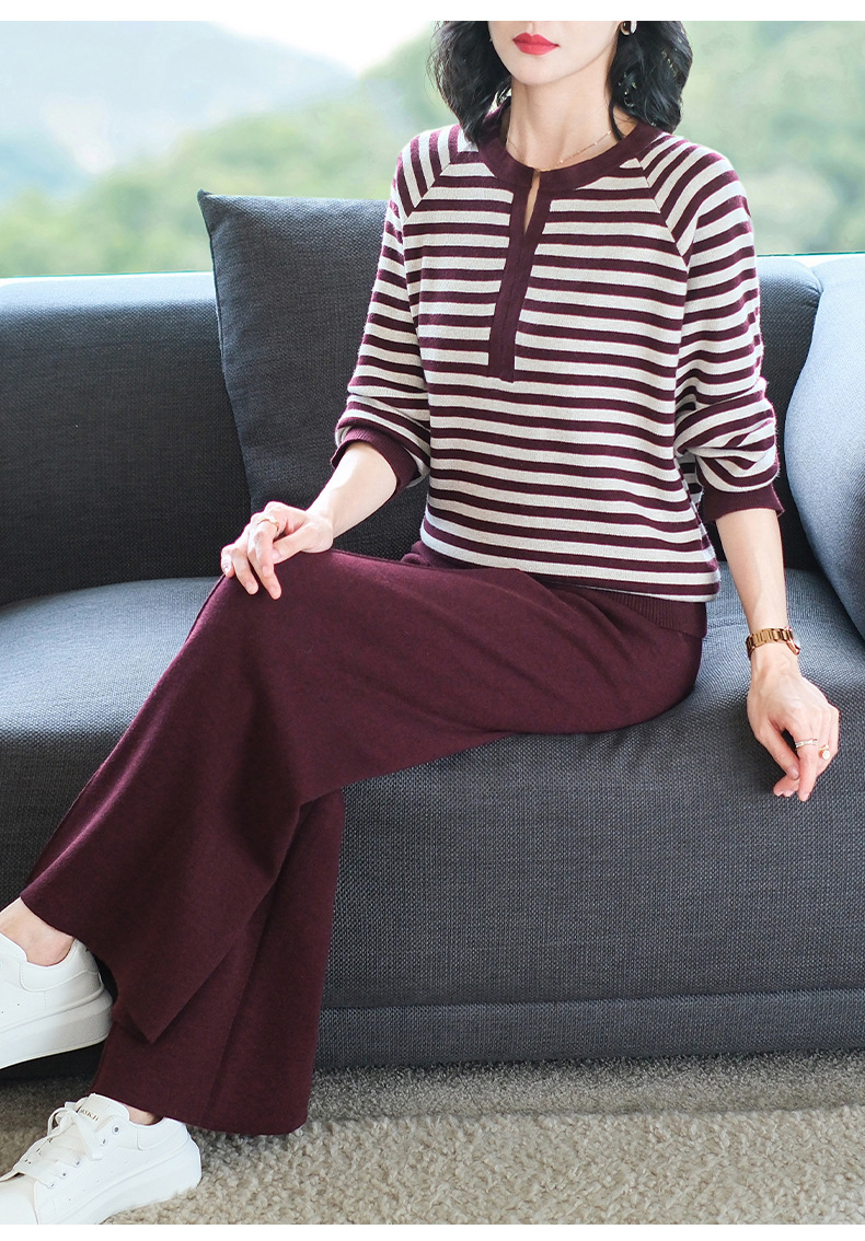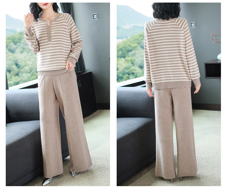OSL 9321套装时尚洋气横条羊毛上衣阔腿裤两件套针织套装