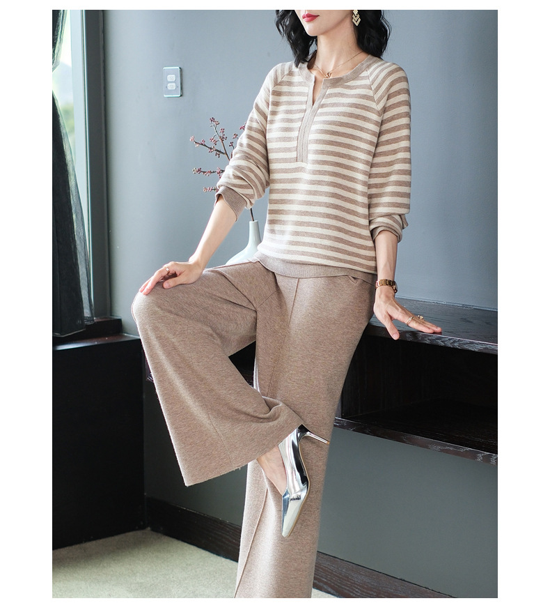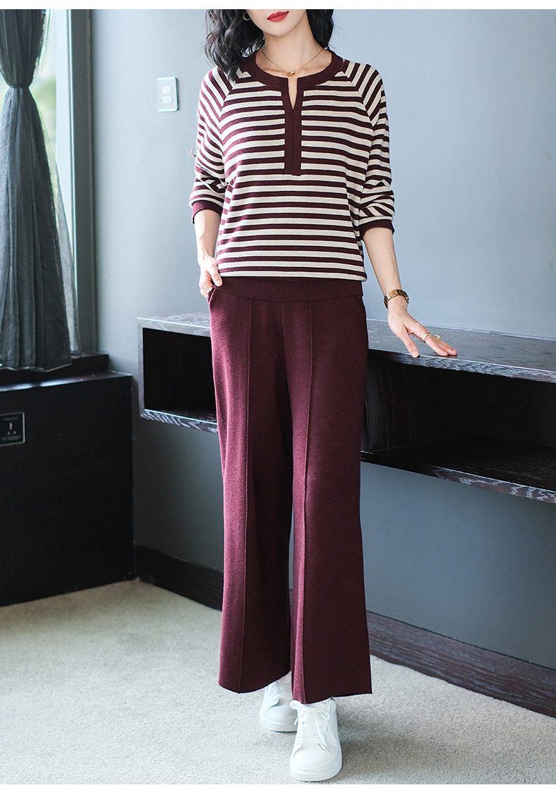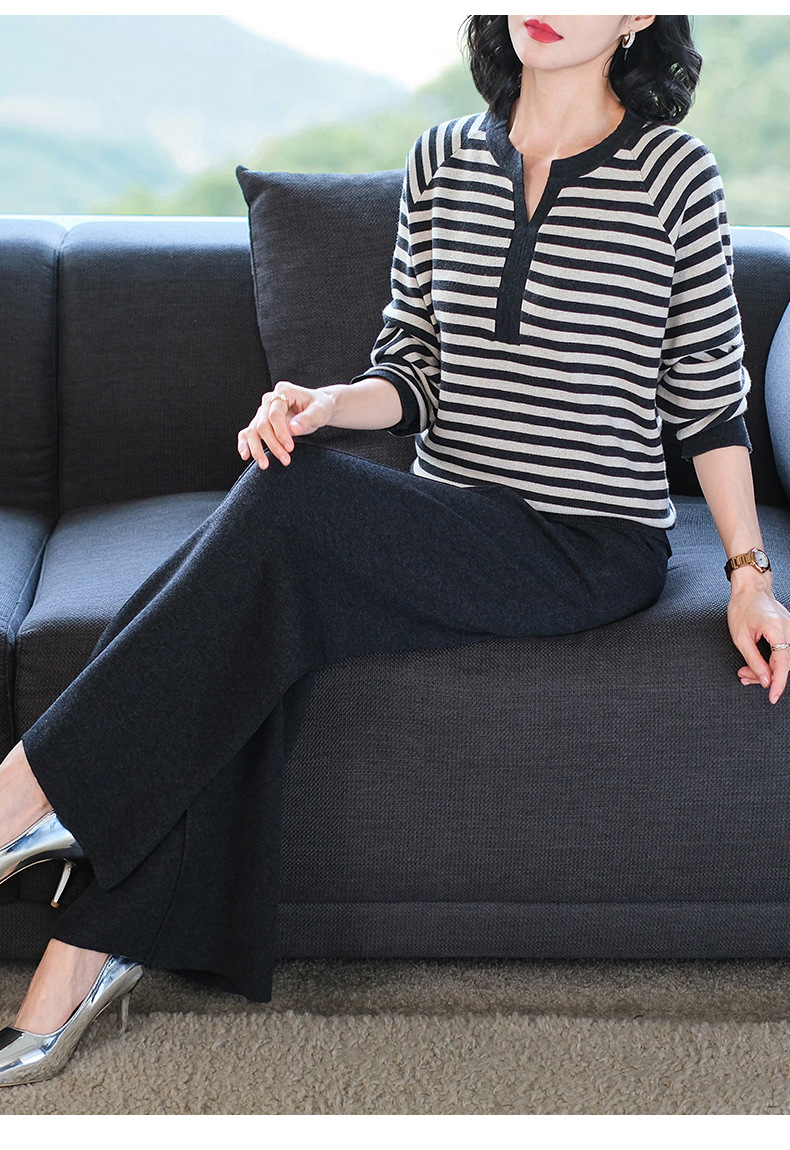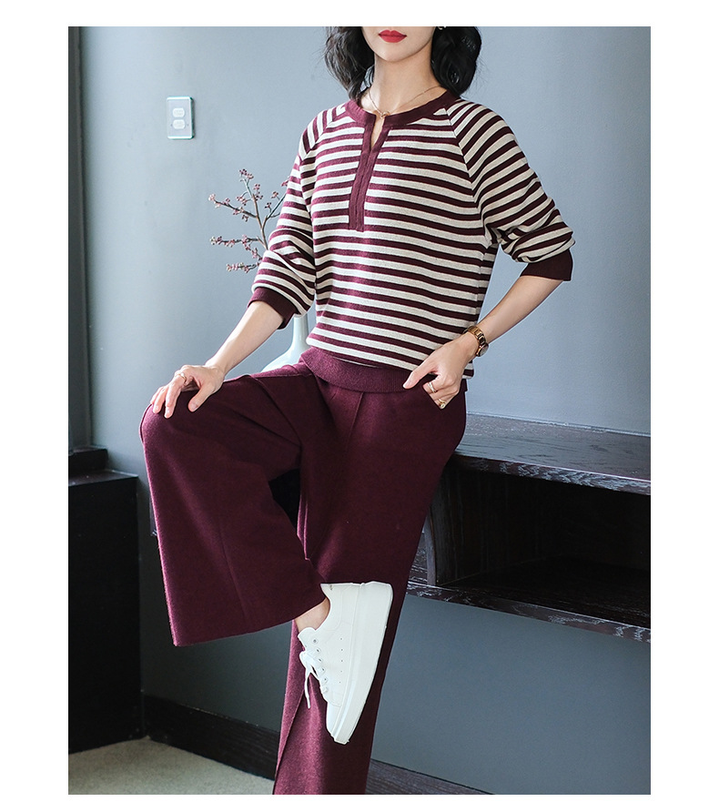 OSL 9321套装时尚洋气横条羊毛上衣阔腿裤两件套针织套装