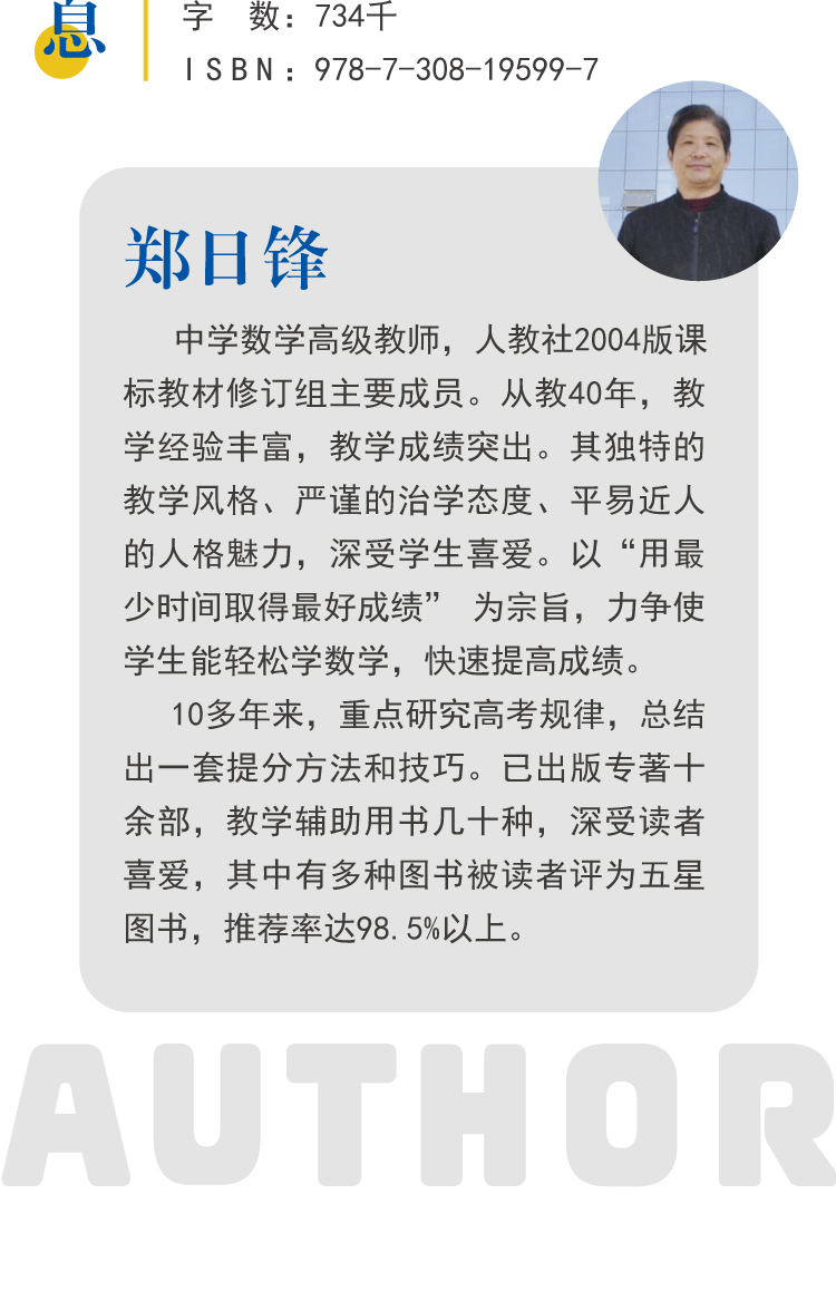 许永忠,男,1961年10月出生,1980年于临沂师专专科毕业,1982年于曲阜师范大学本科函授毕业,2001年曲阜师大研究生课程进修班结业。从事高中和师范数学教学30多年。自1981年起在各级正规报刊发表论文20余篇;自1984年起,开始参加市、省教研室相关教学配套资料的编写工作。2005年,论文在中国数学专业委员会组织的论文评奖中依次获得省、全国一等奖,他被人民教育出版社聘为新课标教材修订组主要成员,为人教A版教材修订做出了很大贡献。先后出版了多本畅销书,其中《数学是怎样学好的》、《高考数学轻松突破120分》、《高考抢分36计》等在没有修订的情况下畅销多年,每种总销量均在10万册以上,在DD网、卓越网等大型网站多年排在同类图书榜榜首,被读者评为五星级图书,且名列前茅,受到广泛好评,读者推荐率达到98%以上。他以“用最少的时间,取得最好的成绩”为宗旨(即以提高数学学习效率和学生考试成绩为目标),并把这一宗旨贯穿到教学和图书的创作中,实践证明,效果显著,这也正是他受到学生和读者充分认可的主要原因。