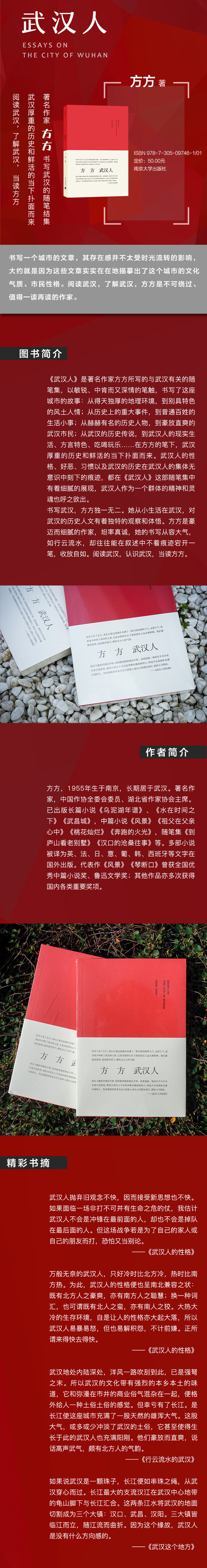 《武汉人》是著名作家方方所写的与武汉有关的随笔集,共收入37篇文章,大致可分为历史篇、环境篇、风土人情篇和少年记忆篇。《武汉人》内容涉及对武汉历史(尤其是近代史)、城市规划、城市性格等有深刻影响的人物、事件等,武汉的地理环境,武汉的大学,武汉的天气、别具特色的风土人情,武汉人的方言、吃喝玩乐,以及生活在武汉五十多年的作者方方与武汉的故事等。类似于叶兆言之于南京,方方是武汉作家中写武汉这个城市极具代表性的作家,从小生活在武汉,对武汉的历史人文有着独特的观察和体悟。本书文笔从容,叙述简洁,且收放自如,增添了不少阅读的乐趣。