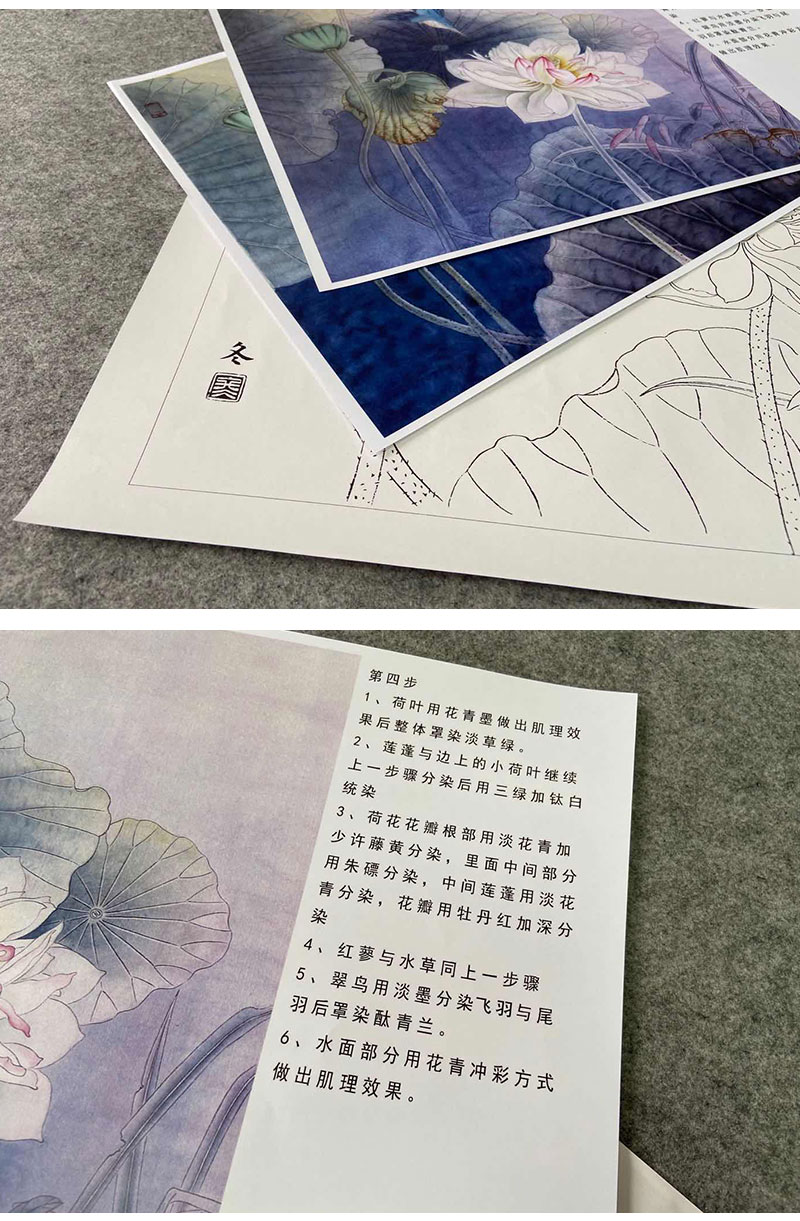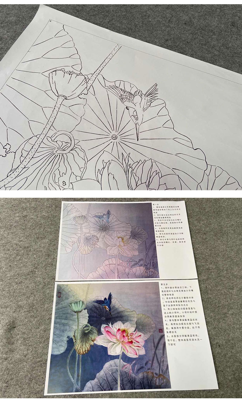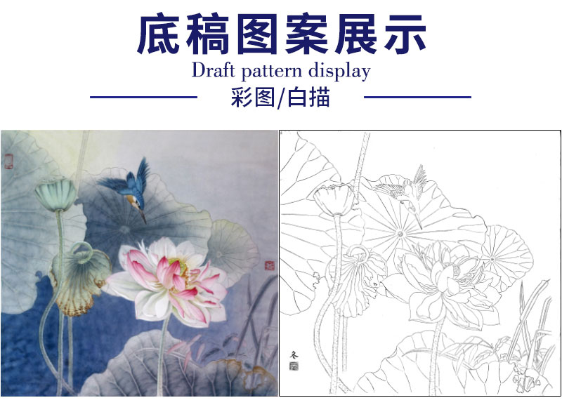 【有步骤、大彩图】杨冬冬工笔画白描底稿斗方小品《烟雨微香》荷花翠鸟初学者临摹花鸟线稿HD50