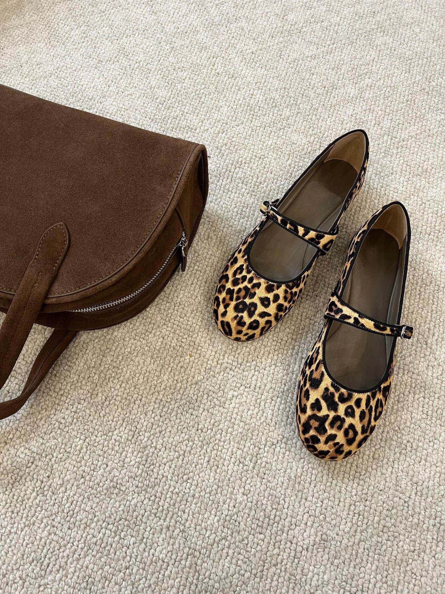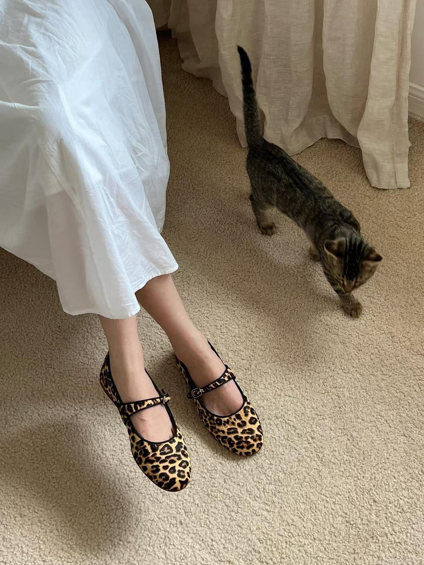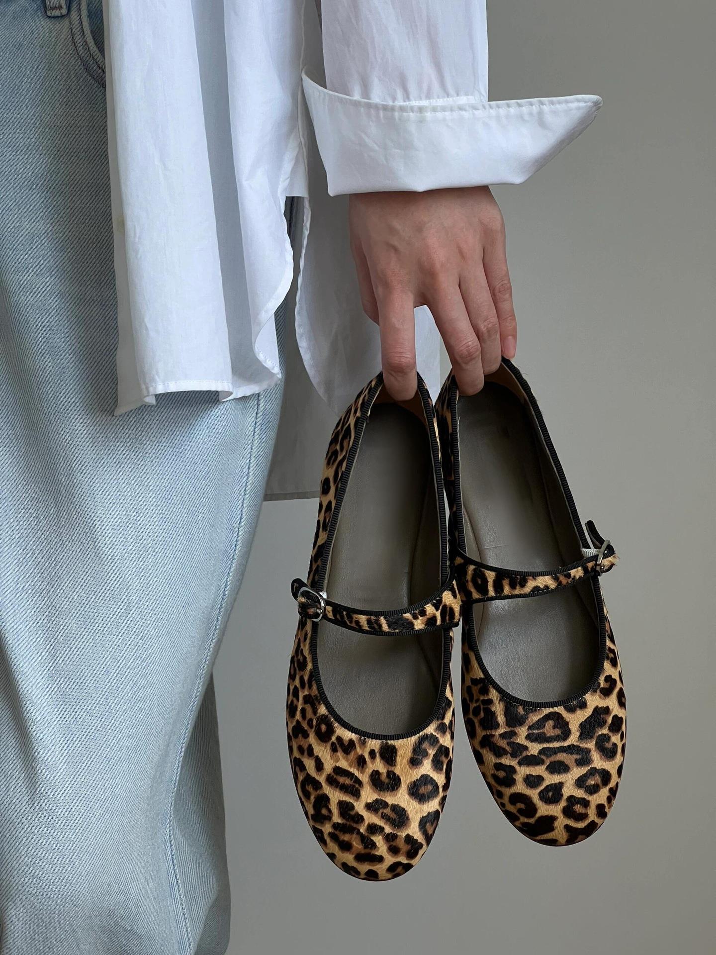 【秒杀】真皮豹纹玛丽珍单鞋女一字带平底女芭蕾女鞋奶奶鞋瓢鞋