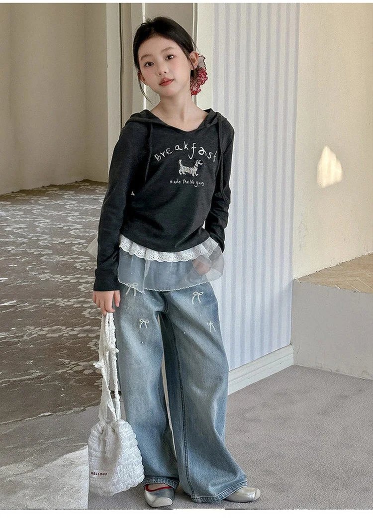 少女心设计:手工缝制珍珠蝴蝶结,搭配精致蕾丝丝边,甜妹氛围感拉满,告别牛仔单调感