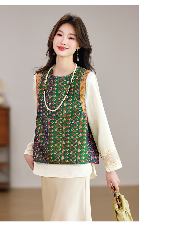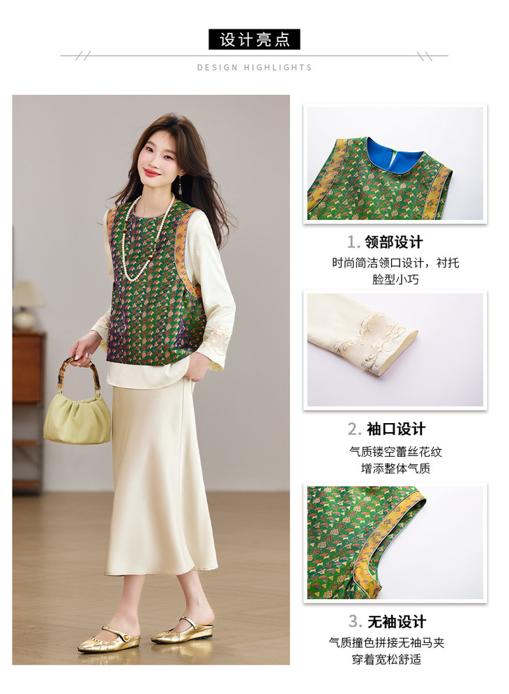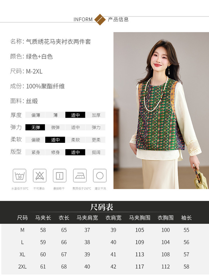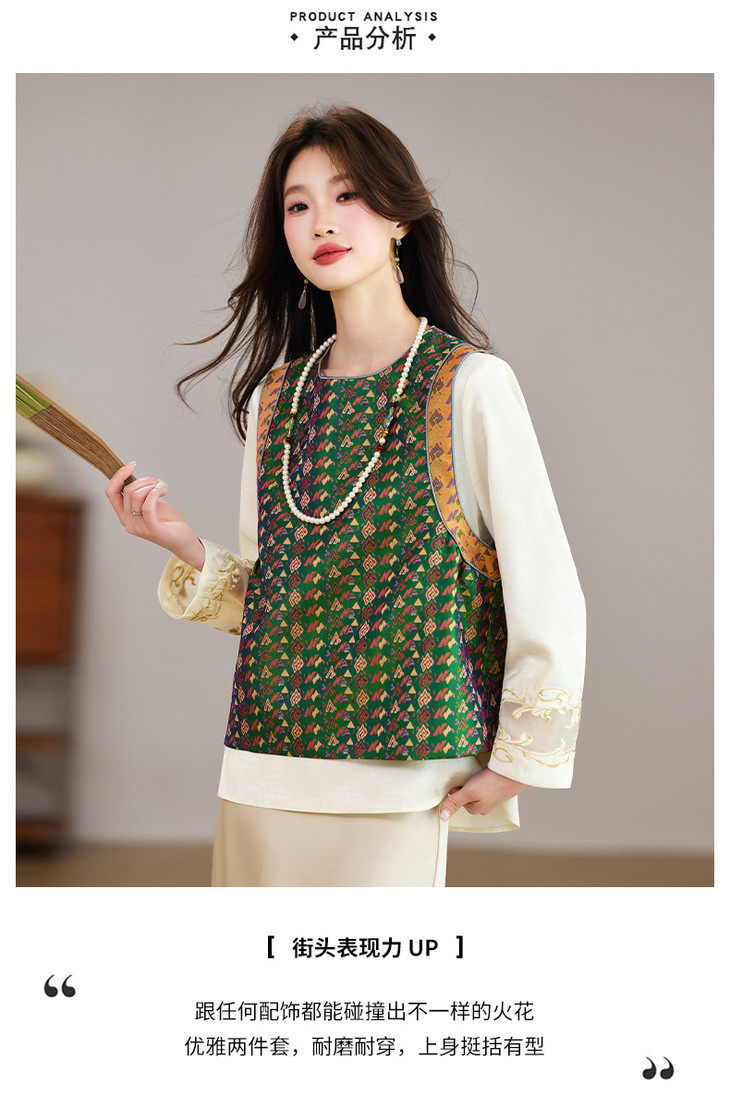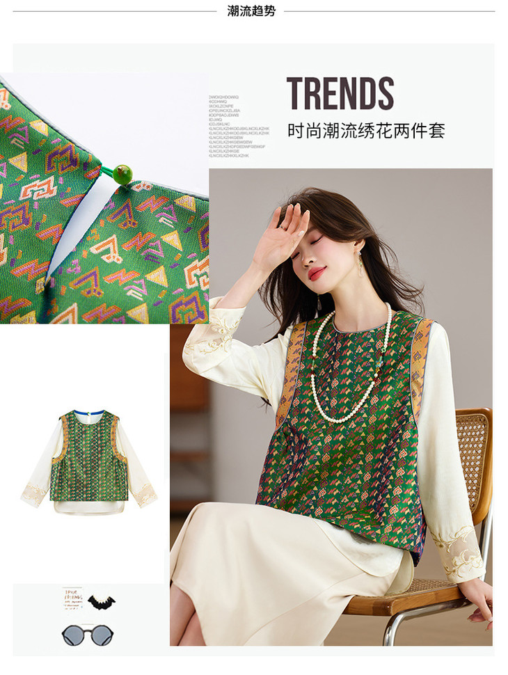 新中式减龄百搭圆领撞色马甲+刺绣衬衫打底两件套
