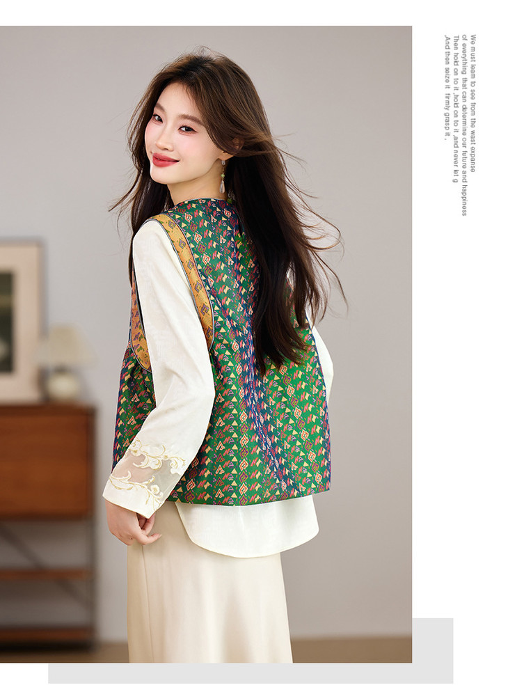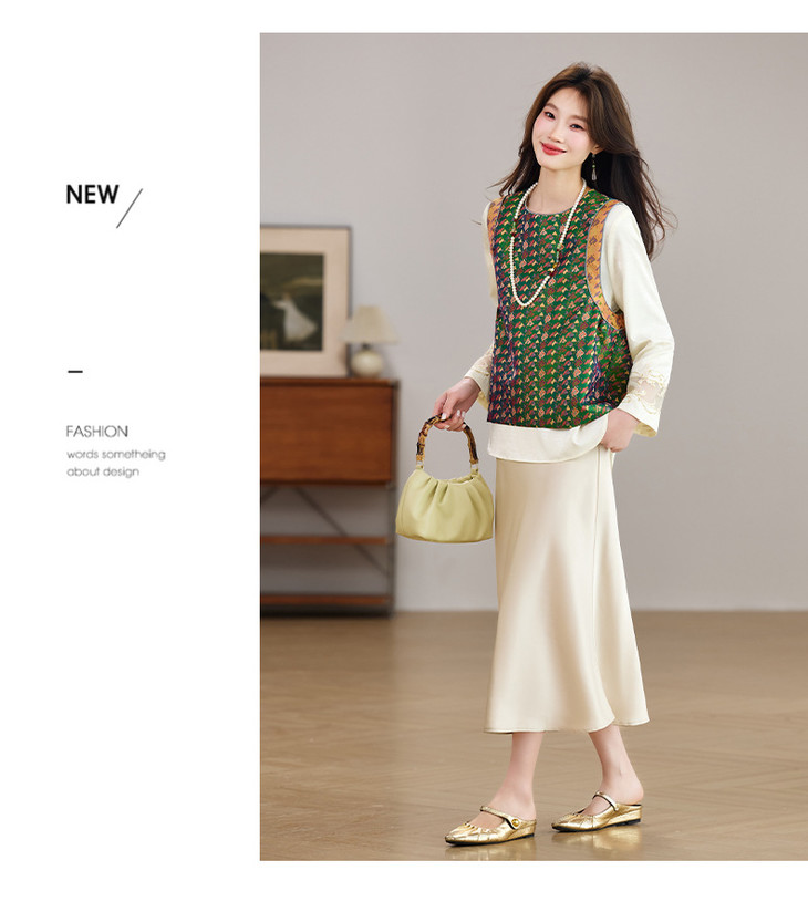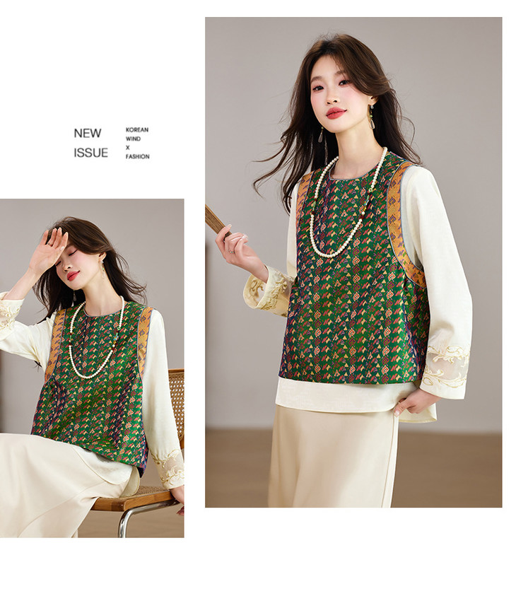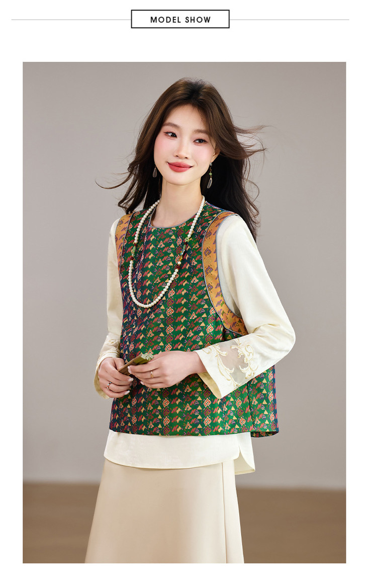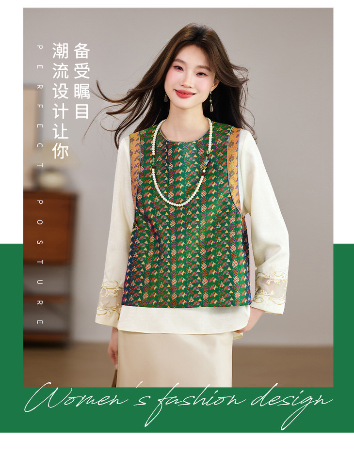 新中式减龄百搭圆领撞色马甲+刺绣衬衫打底两件套