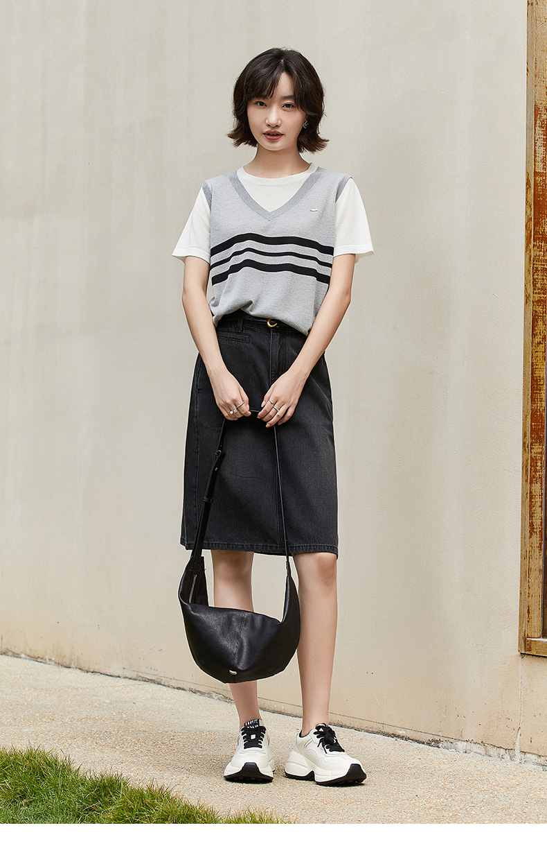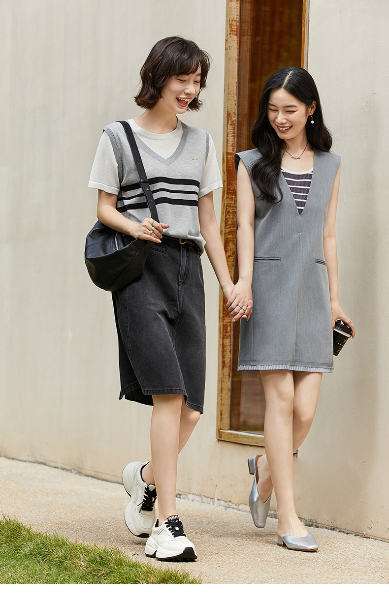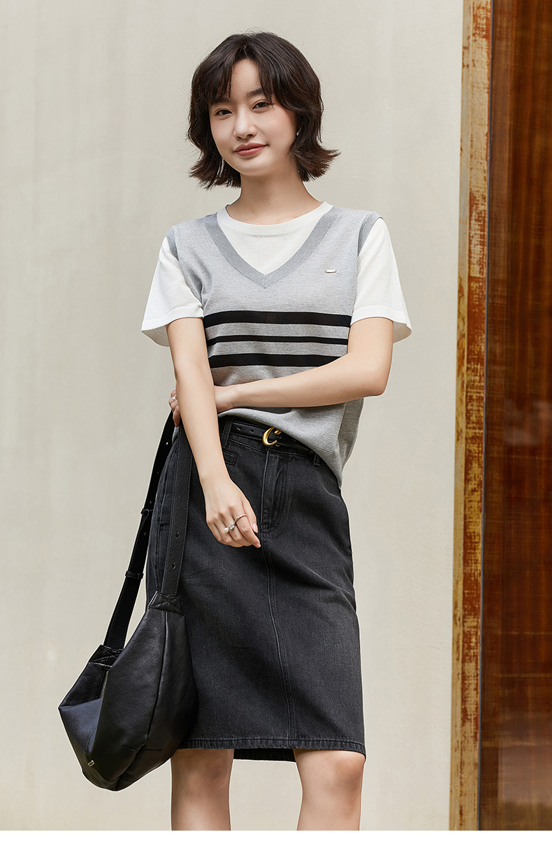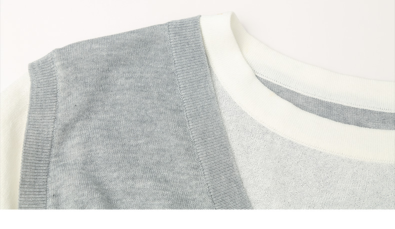 学院风假两件条纹针织衫 背心拼接短袖设计 复古减龄显瘦上衣