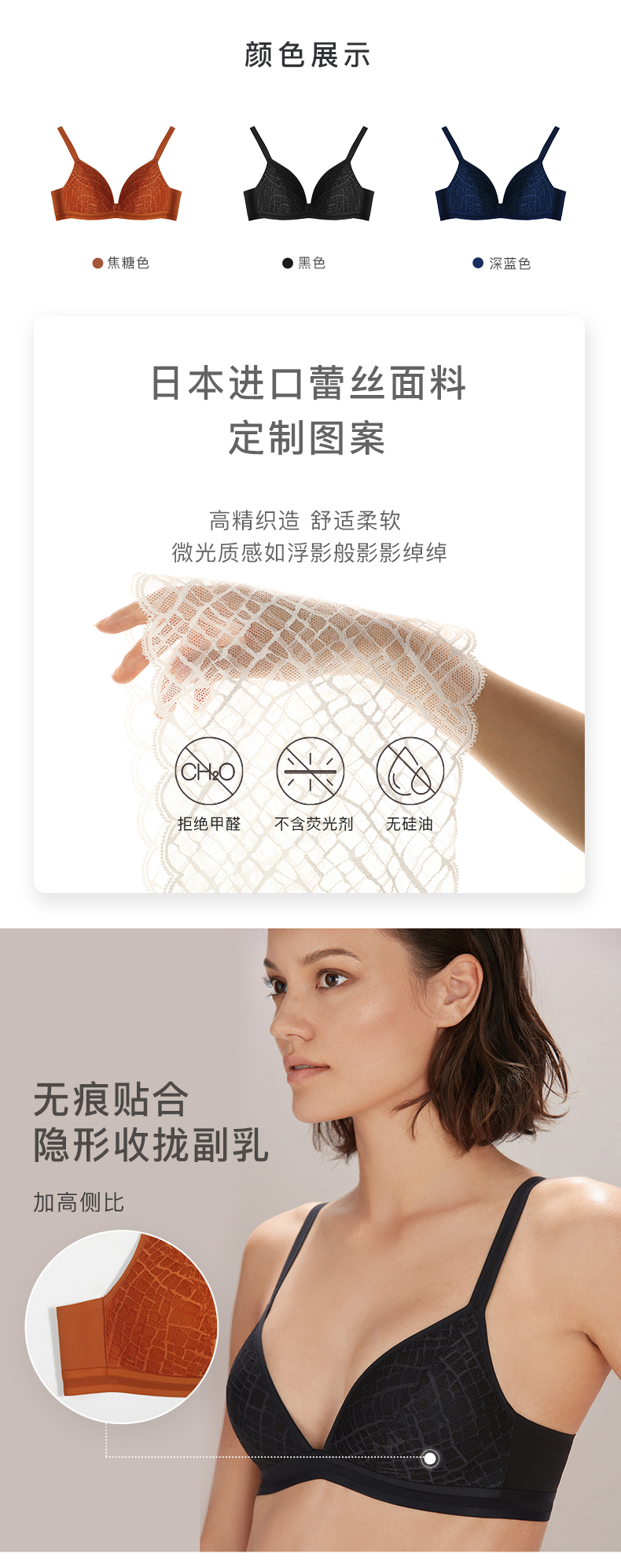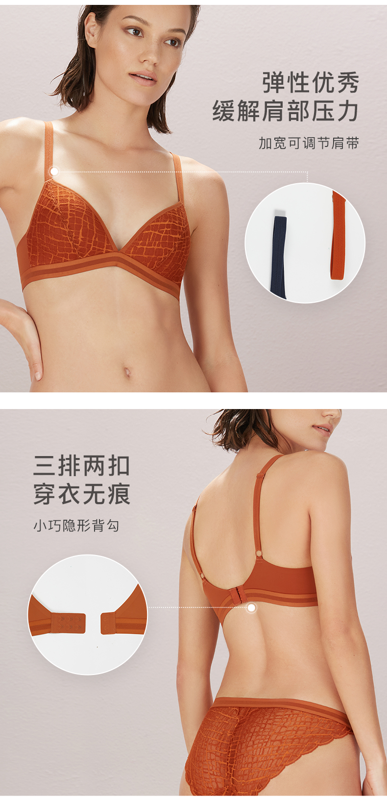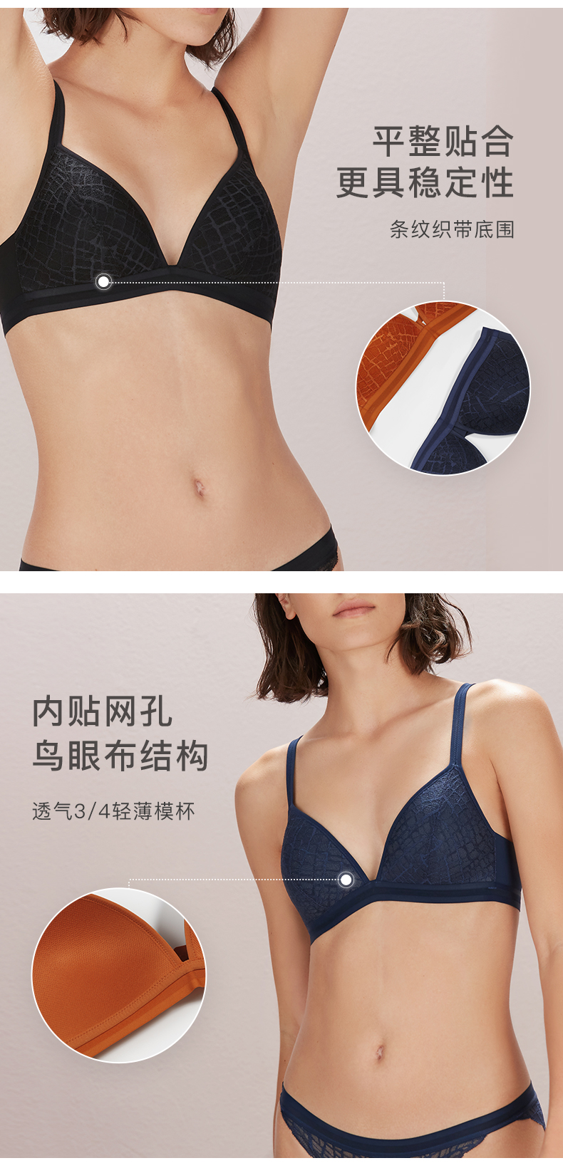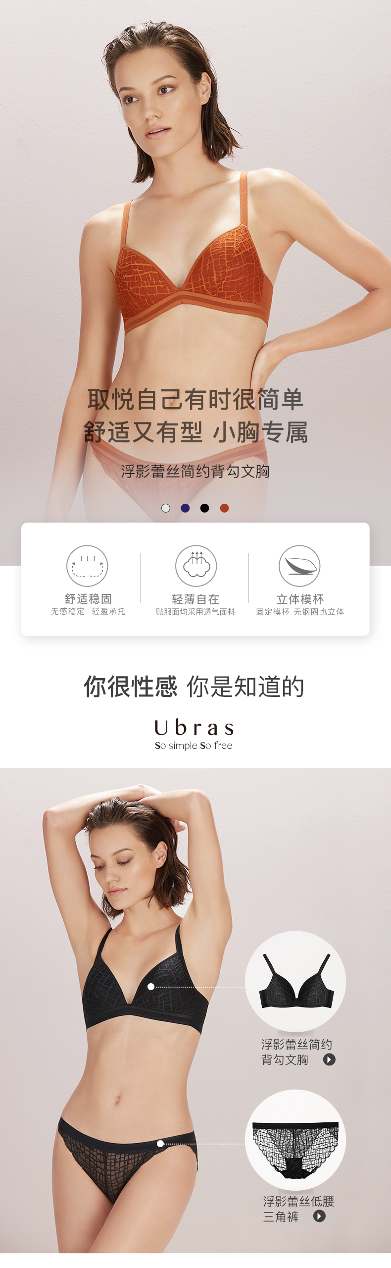 Ubras浮影蕾丝简约背勾文胸无钢圈薄款条纹织带透气3/4杯胸罩女