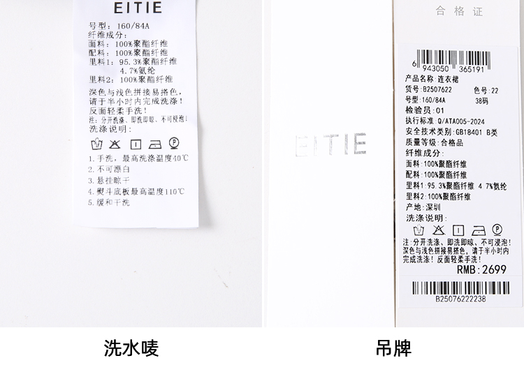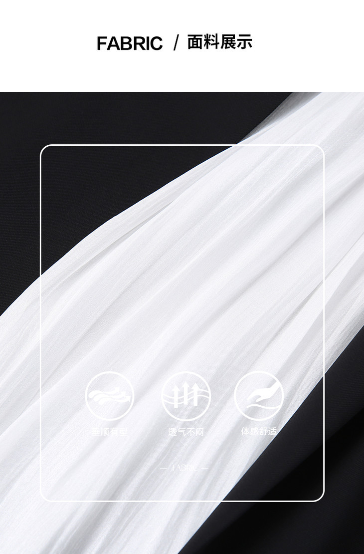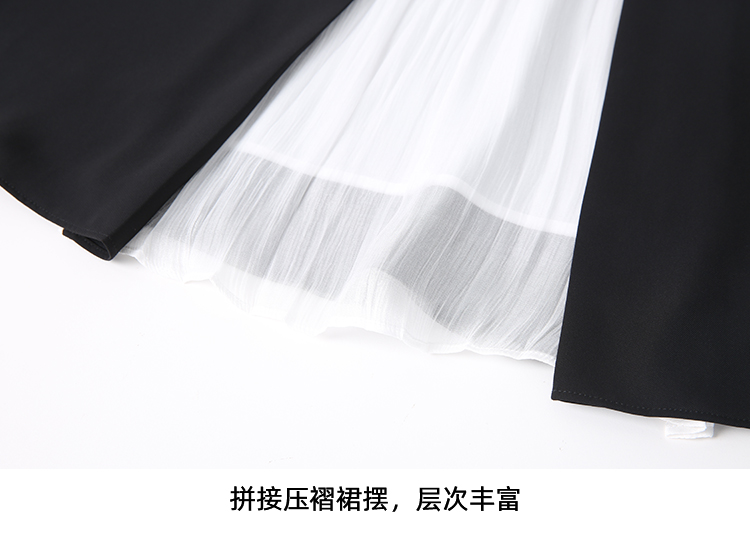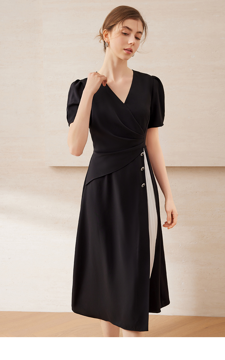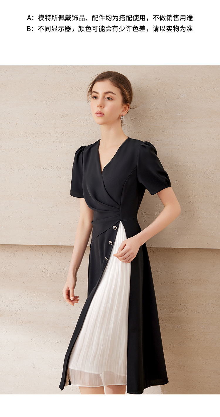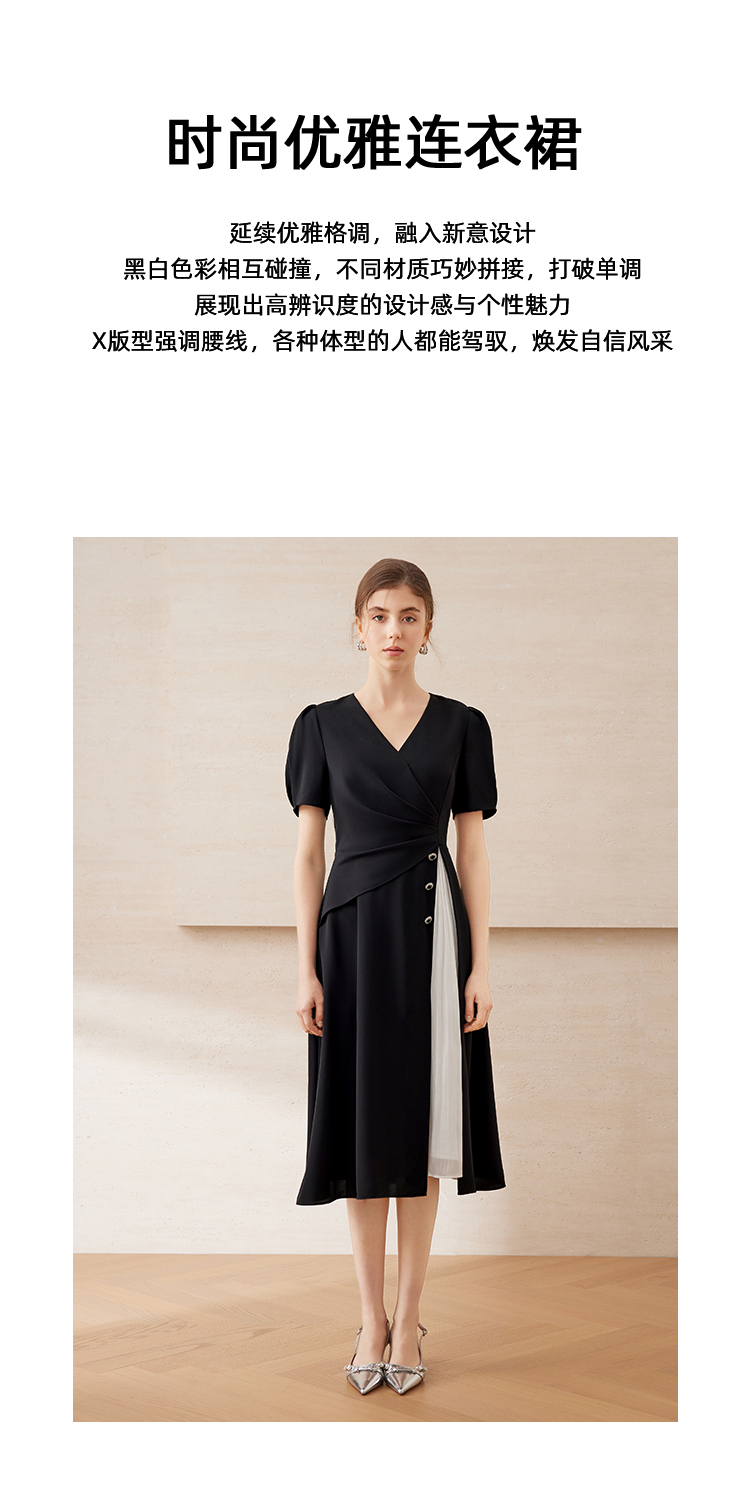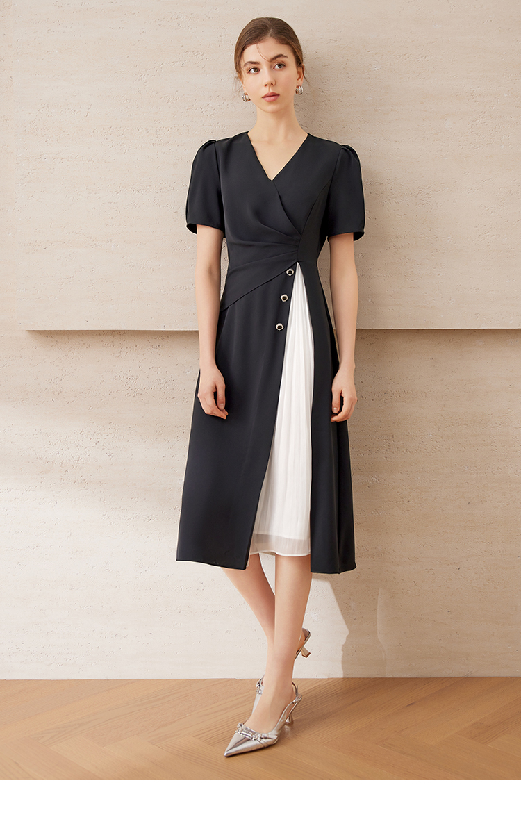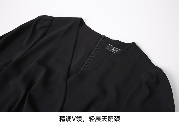 EITIE爱特爱气质V领百褶拼接收腰显瘦黑色连衣裙2025夏季新款B2507622