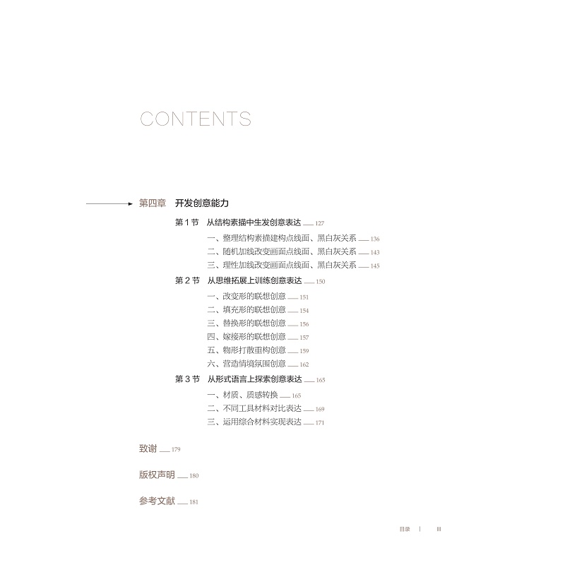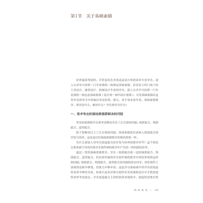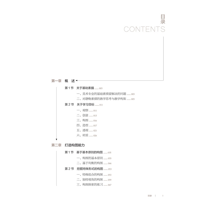 《静物素描》是浙江省十三五规划教材项目视觉美育“综合设计基础”系列教材之一。本教材适合综合性大学美术专业一年级学生。教材在常规的静物素描的基础上,加入了一定的创造性能力培养的环节,这也是与常见的基础素描教材最大的不同。力图使学生在基础课就接触到创造性思维的训练,使基础课和专业课课程之间形成互为支撑关系。 教材分四大章:第一章概述,是关于素描的基本概念、基础知识、学习目标介绍与学习方法引导。第二章打造构图能力,是以结构素描为切入点展开关于构图的学习、练习。第三章提升造型能力,是关于造型能力的训练,包括结构素描、精微素描两个环节。第四章开发创意能力,是关于在静物素描中融合创造性思维能力训练的学习。