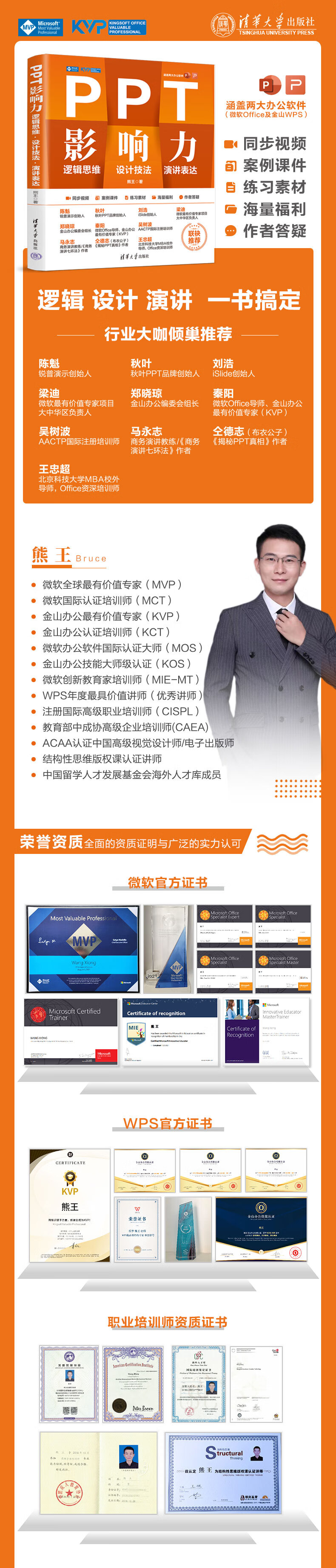 《PPT影响力 : 逻辑思维•设计技法•演讲表达》致力于全方位提升读者的 PPT 逻辑、设计与演讲表达的综合能力。《PPT影响力 : 逻辑思维•设计技法•演讲表达》共 5 章,第 1 章主要讲解 Microsoft PowerPoint 2019 和 WPS Office 2019 的特色功能;第 2 章主要讲解如何提升 PPT 的制作效率;第 3 章主要从图文设计、图表配色、设计排版等方面进行讲解;第 4 章主要讲解如何形成结构性思维的习惯,让 PPT 的内容更有逻辑性;第 5 章结合职场常见演讲需求,全面提升读者的演讲表达能力。通过学习写 PPT(逻辑)、做 PPT(设计)、讲 PPT(表达)的全流程,读者可系统性地提升PPT 制作和表达综合能力。