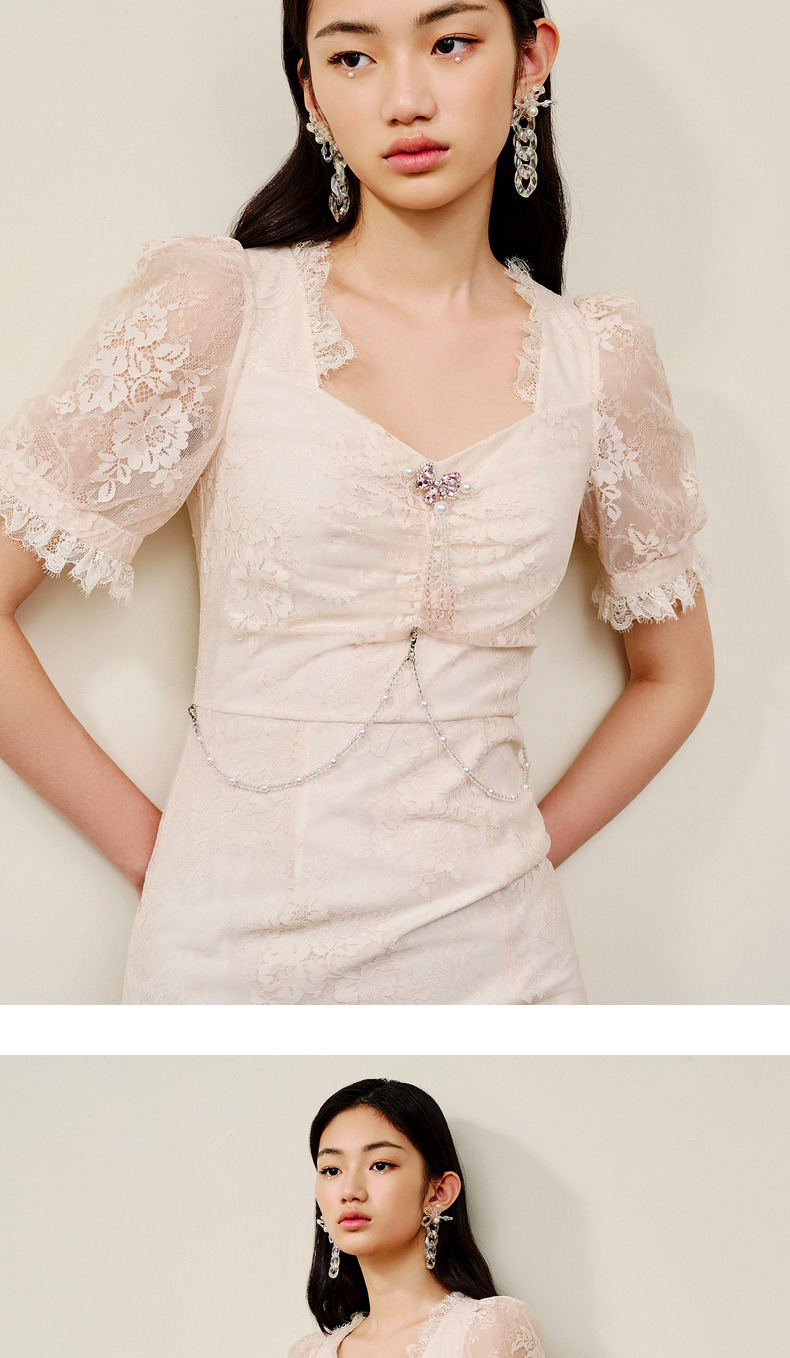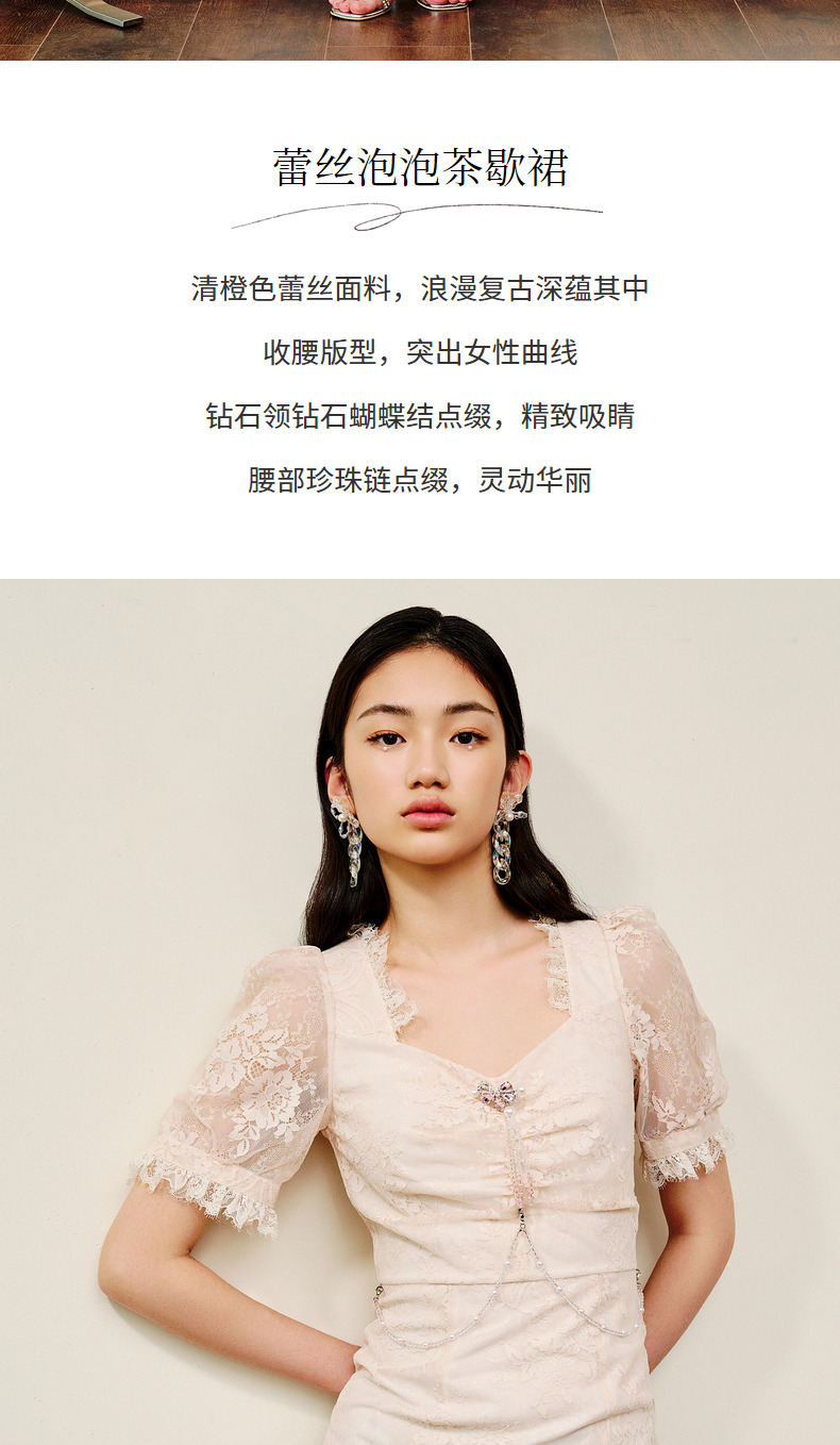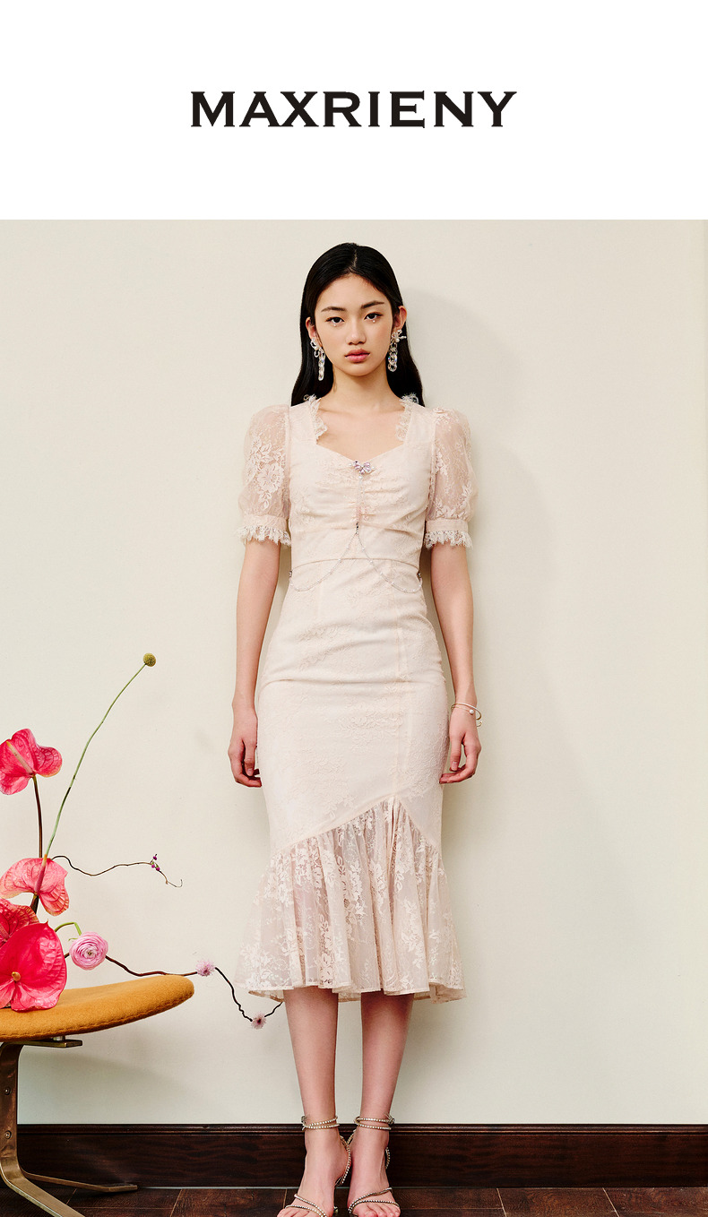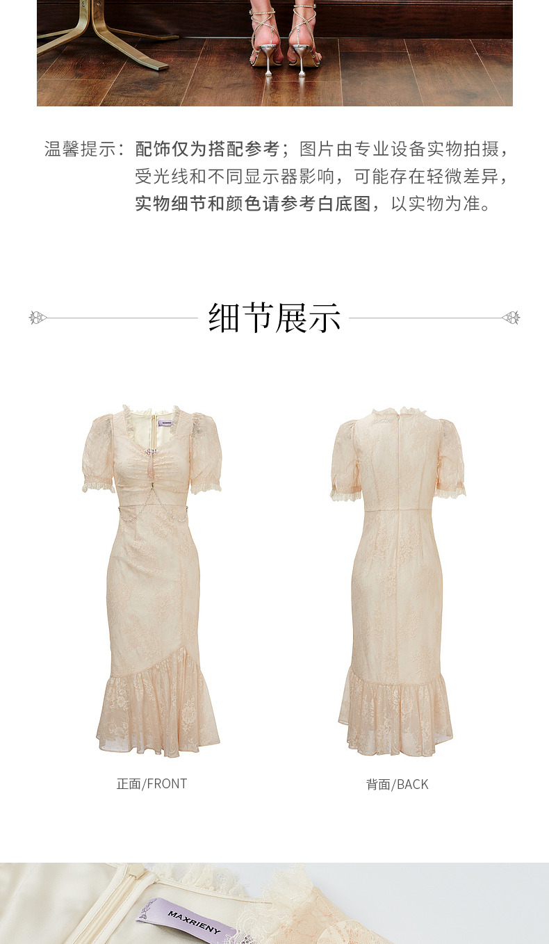 MAXRIENY法式浪漫复古感连衣裙蕾丝泡泡袖茶歇裙(货号:MS88DR293)