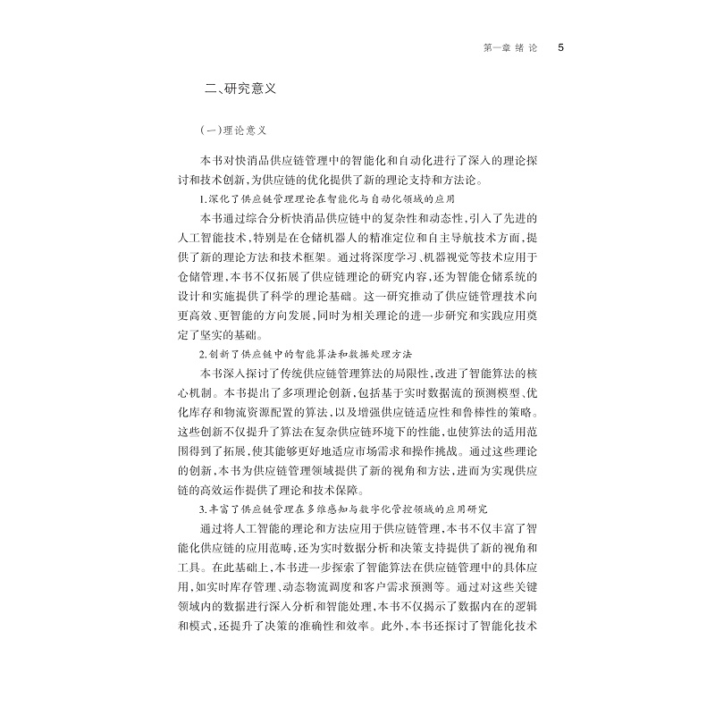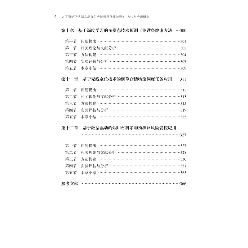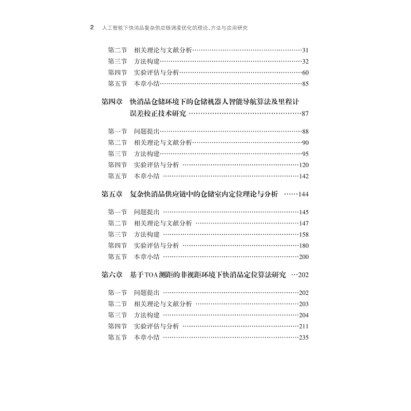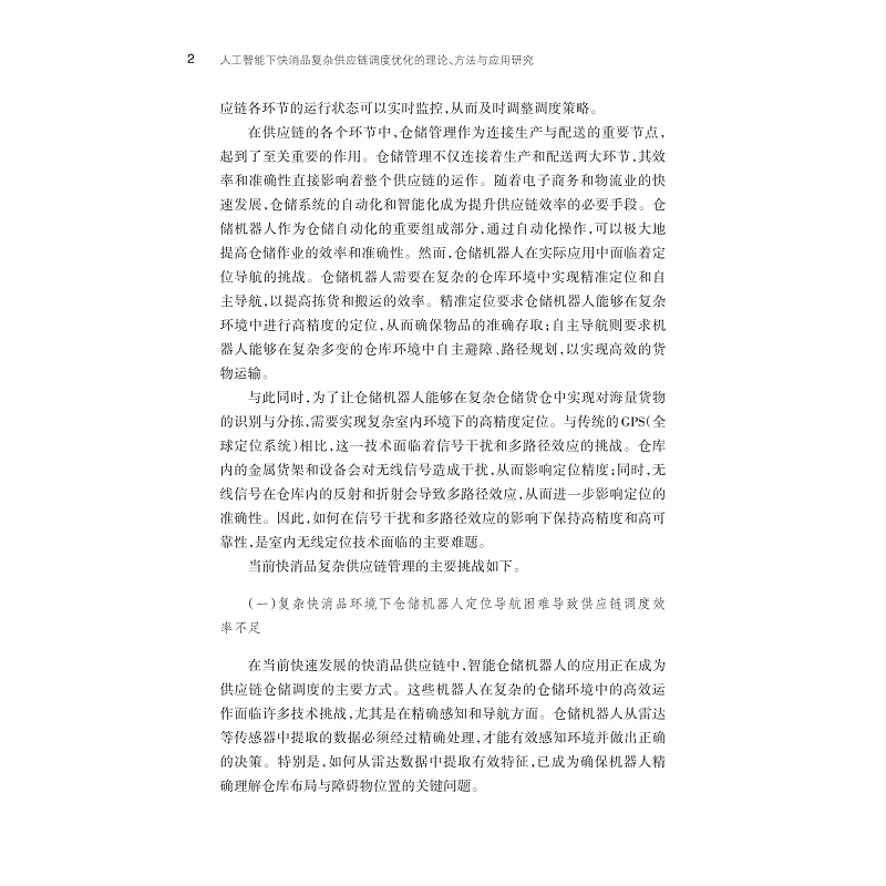 本书系统探讨了人工智能背景下快消品复杂供应链调度优化的理论、方法与应用。首先针对复杂供应链环境下的仓储响应调度慢的问题,讨论影响仓储调度的主要因素:仓储机器人定位与导航的问题。其次针对复杂快消品仓储环境对智能机器人的影响,研究在复杂室内环境下的定位技术,以提高仓储空间利用率和物流效率。最后从实际应用出发,研究了无线定位技术在烟草仓储物流调度中的应用,以及数据驱动的烟用材料采购预测与风险管控方法,并探讨了多模态融合技术在工业系统设备健康检测中的应用。