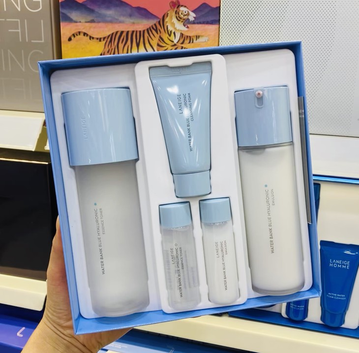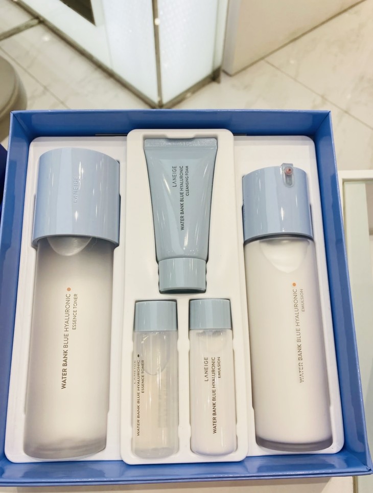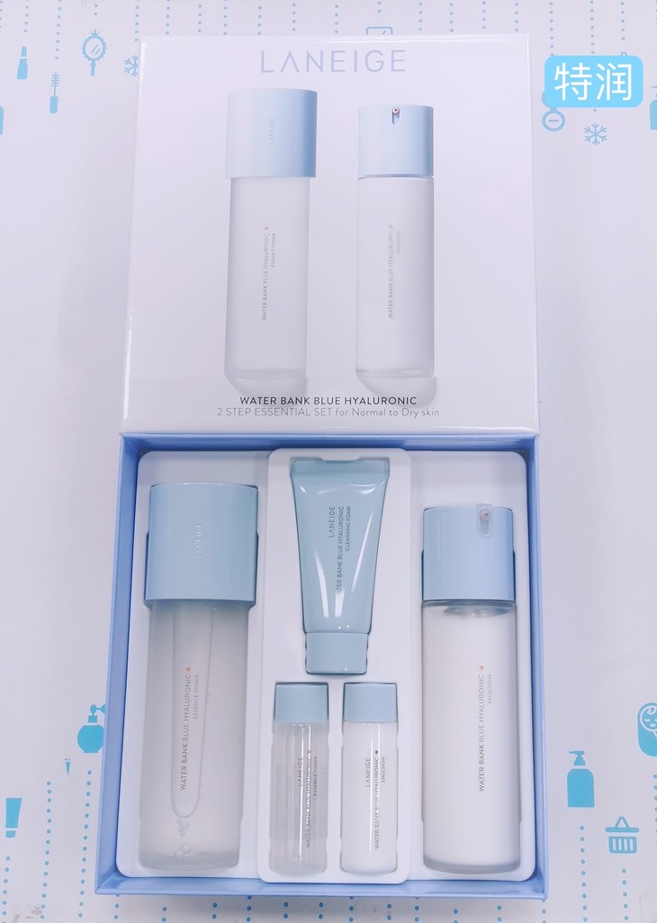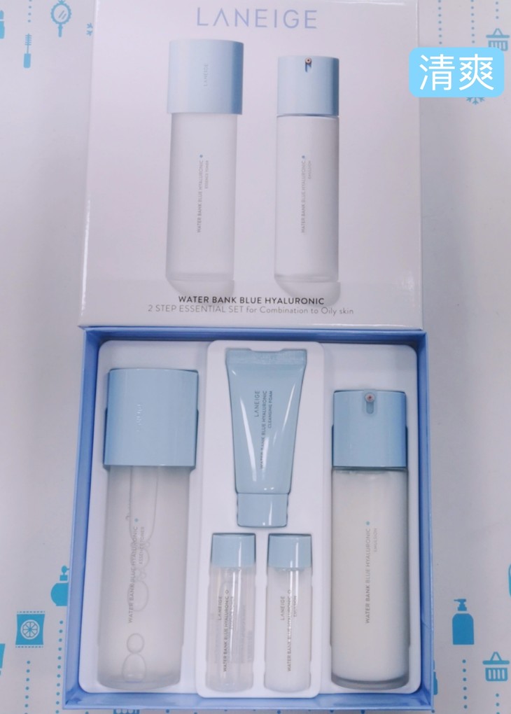 👑兰芝新水酷透明质酸嘭润两件套(特润、清爽) 👍 兰芝新水酷全新升级系列!无论是包装还是功效都更强! 1/2000微分子玻尿酸,更纯更小更吸收快🌿! 🙌含有“森林酵母”、“薄荷叶提取物、β-葡聚糖”等成分,保湿、锁水、维稳更强🌈! 💯可以深层保湿、修护损伤肌肤,还能调节水油平衡,换季泛红、起皮也不在话下! 💋分清爽和滋润提供不同肤质的人群选择使用‼️绝对是干燥、敏感肌的福音💋。 “蓝标”💙:适合油性&混合性肌肤 “粉标”💗:适合干性&中性肌肤 【套盒包括】:水160ml+乳120ml+洁面30g+水25ml+乳25ml