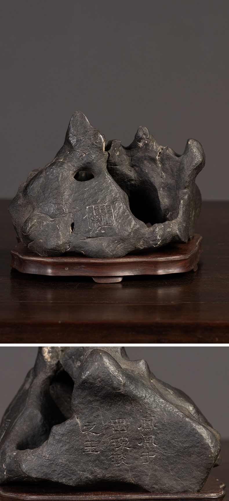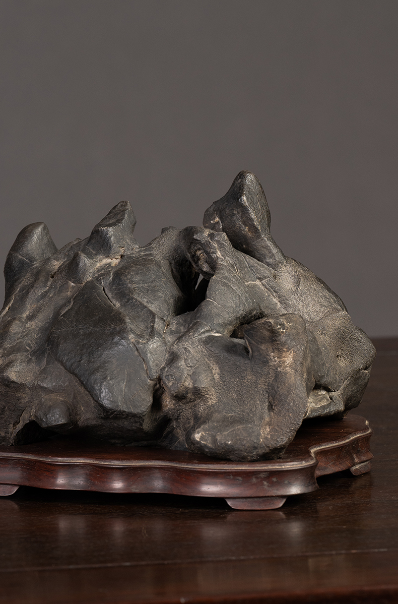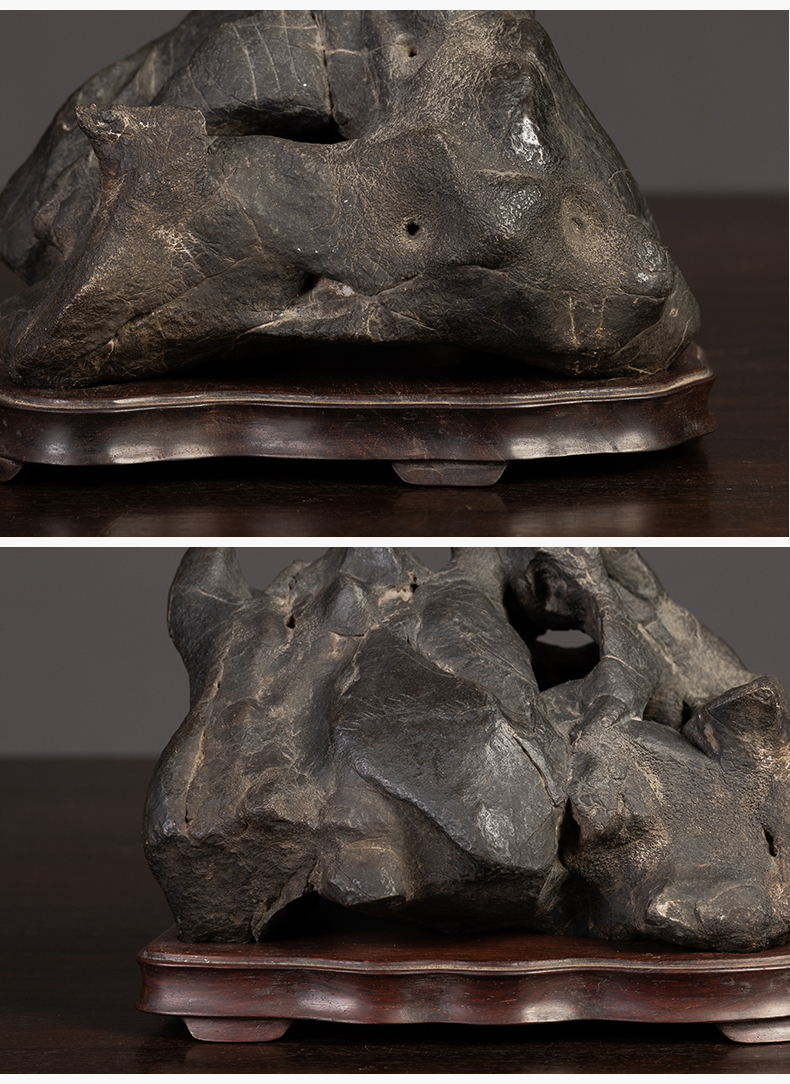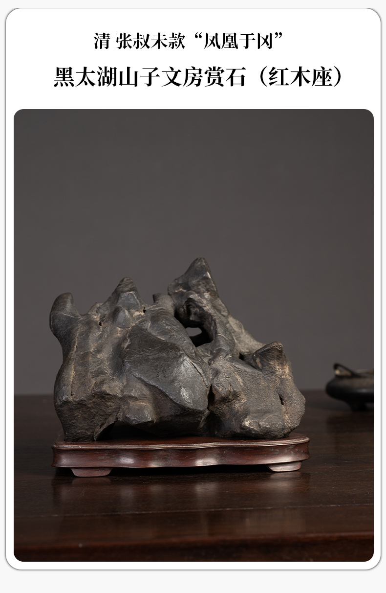 清 张叔未款“凤凰于冈”黑太湖山子文房赏石(红木座)