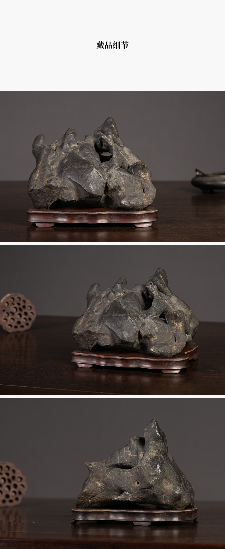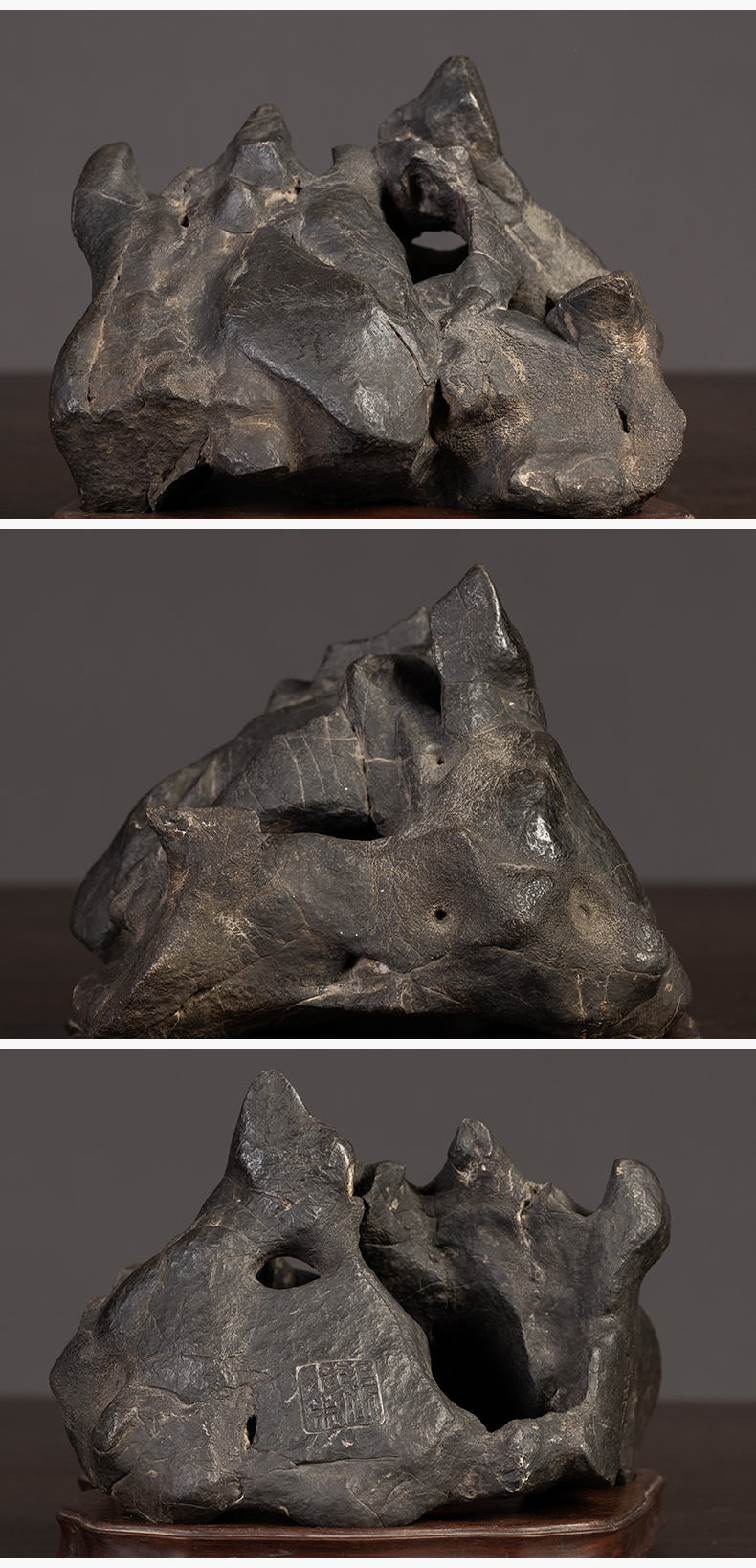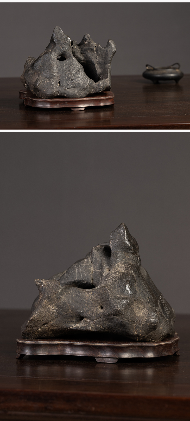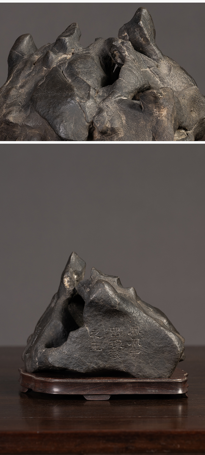 清 张叔未款“凤凰于冈”黑太湖山子文房赏石(红木座)