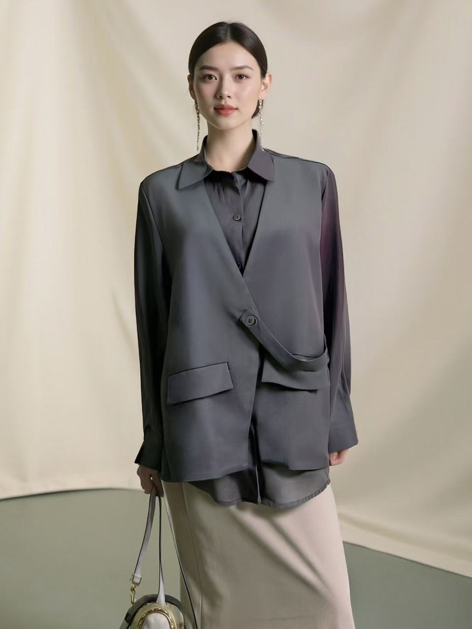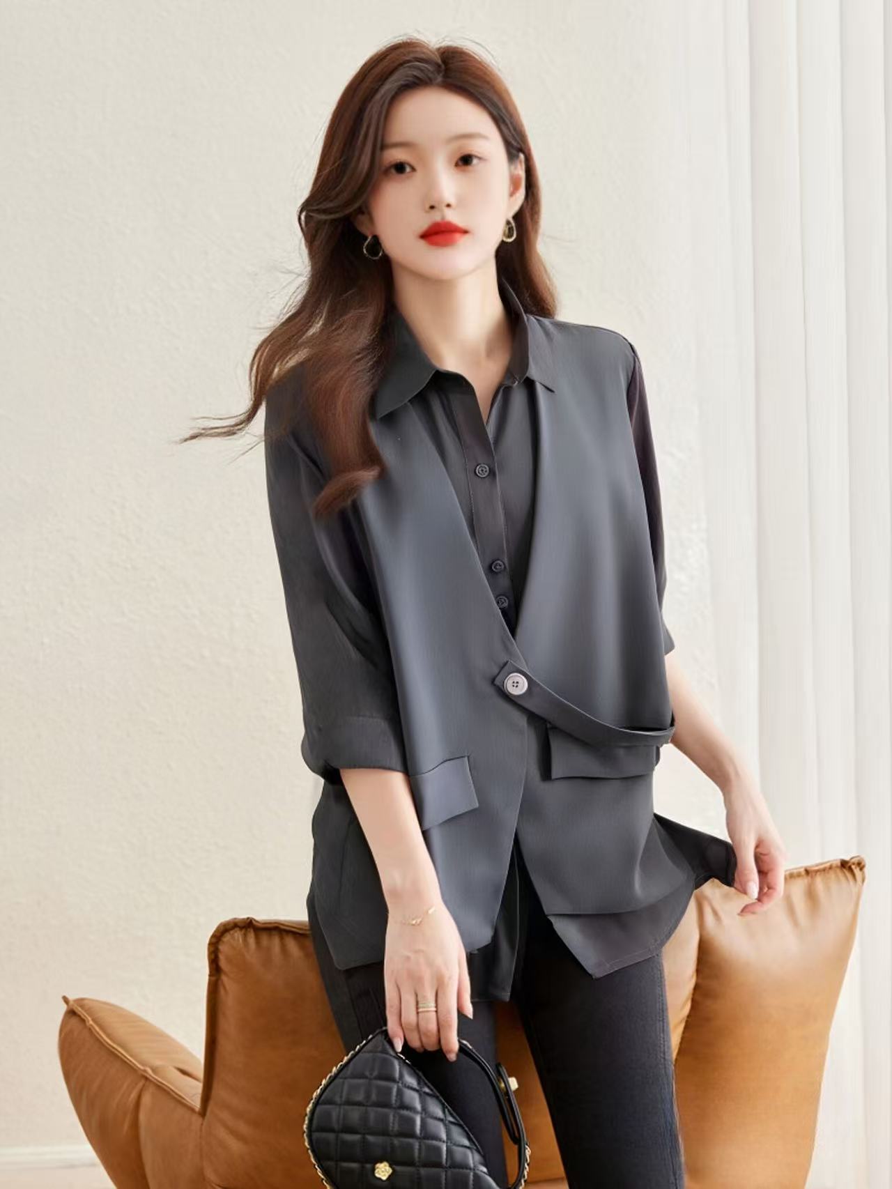 【秋新品】古泥品牌7063 假两件100%天丝衬衫翻领上衣-喜出