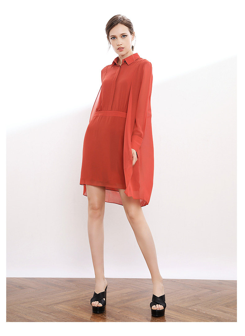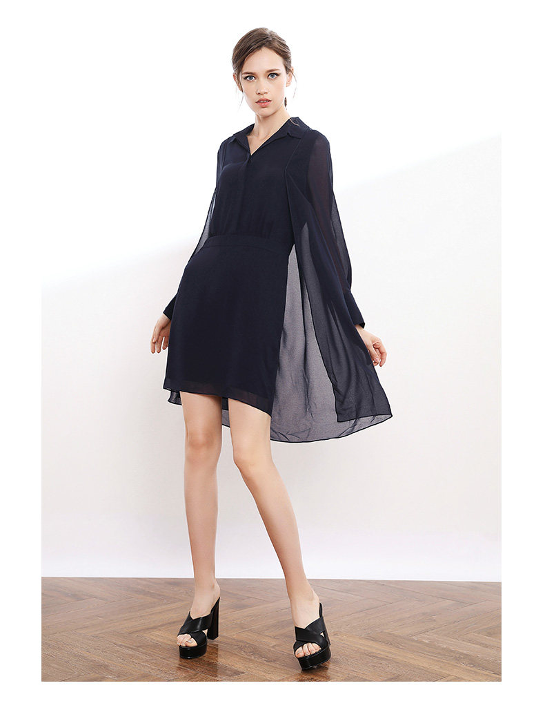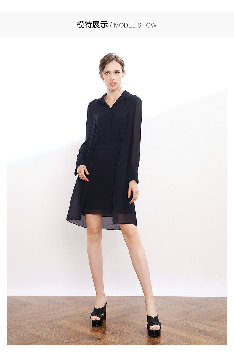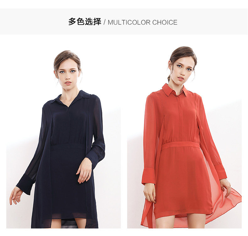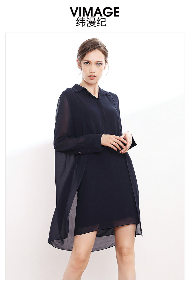VIMAGE纬漫纪秋季女装衬衫领长袖拼接披肩雪纺连衣裙中裙V9075103