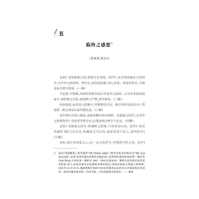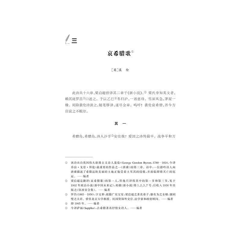 本书为“中华译学馆·中华翻译家代表性译文库”之一。全书收录了著名翻译家马君武的代表性译文。全书分为三大部分:导言、代表性译文和译事年表。diyi部分“导言”包括马君武的生平介绍、马君武的主要翻译作品简介、马君武的翻译理论及其实践、马君武翻译的特色、马君武的主要影响、版本选择说明和编选说明。第二部分为马君武的代表性译文。根据马君武译作涉及的具体领域,分为四编:diyi编为译诗,包含《米丽容歌》《缝衣歌》等;第二编为散文、小说,包含《自然》《绿城歌客》等;第三编为戏剧,包含《威廉退尔》;第四编为哲学社会科学著作,包含《法兰西近世史》《俄罗斯大风潮》等。第三部分为马君武译事年表,把马君武的主要翻译实践活动按时间顺序排列,包括年代与发表渠道等。