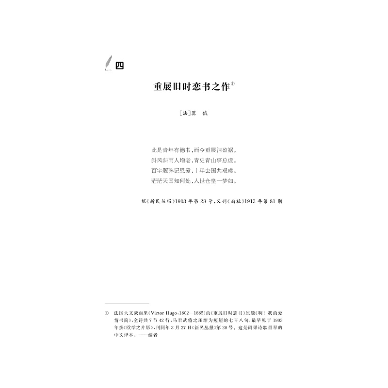 马君武,杰出的教育家和学者,卓越的翻译家和诗人。他注重介绍西方思想理论,把新思想视作改造社会的根本。他通英、法、德、日四种外语,学问渊博,译作颇丰。他的翻译可分为自然科学译作、社会科学译作和文学译作,在中国近现代翻译史上产生过重大的影响。