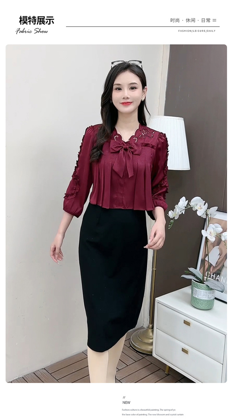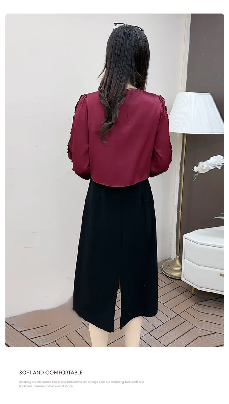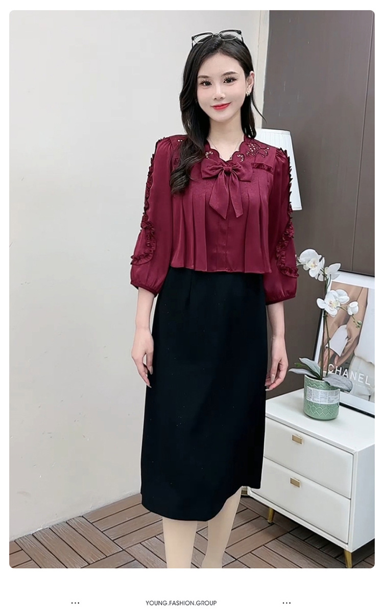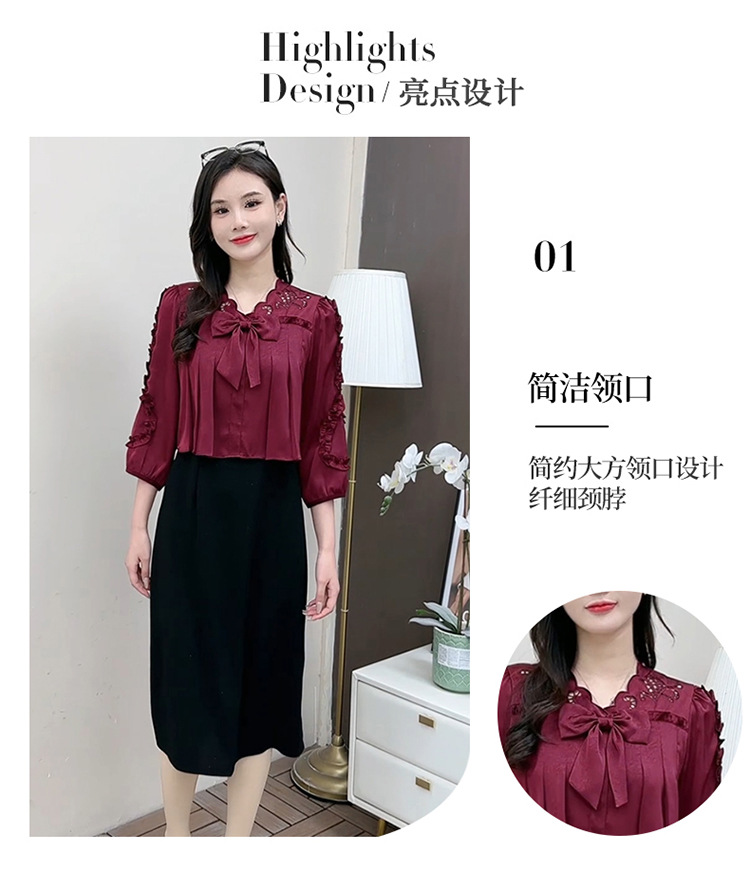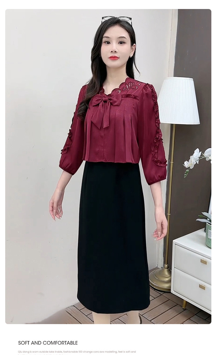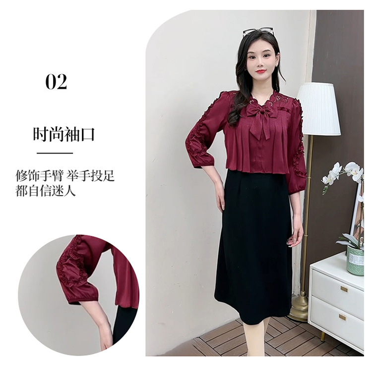 QYM 5A25212-Y蝴蝶结时尚连衣裙时尚拼结假两件连衣裙高腰开衩裙